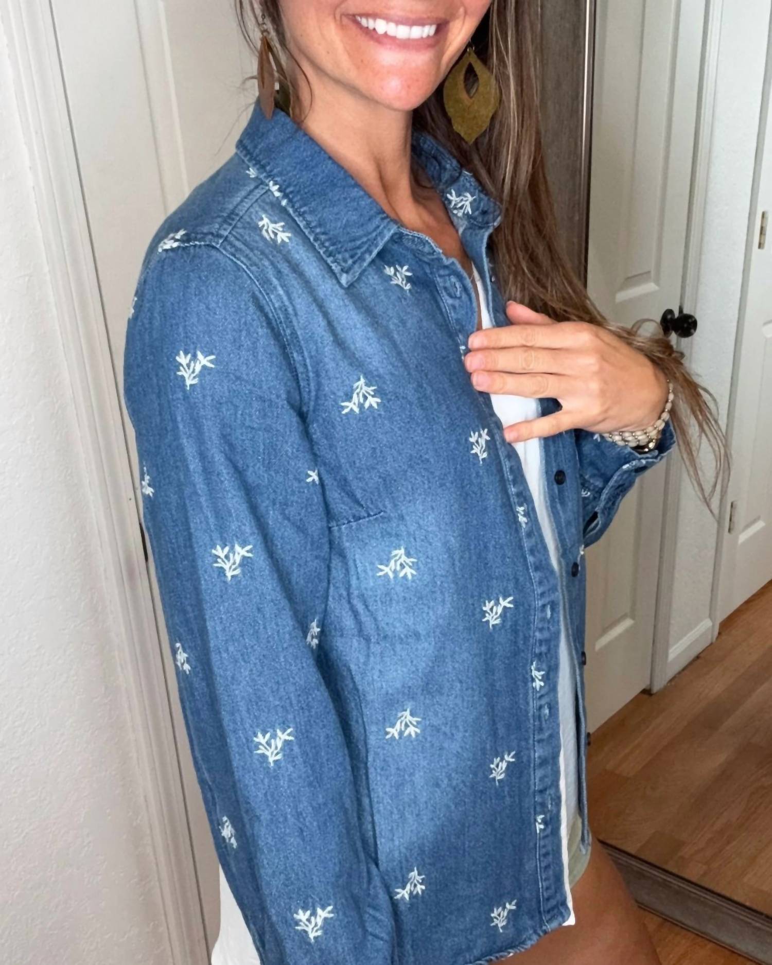 The perfect jean jacket for those slightly crisper days between seasons. The Serenity Denim Shirt by Risen, in a soothing blue hue, is an ideal piece for your casual wardrobe. This patterned, long sleeve shirt features delicate leaf embroidery, enhancing its streetwear appeal. Made from 100% cotton, it offers breathable comfort, ensuring it's perfect for summer vacation outings. It includes practical pockets and a button closure for convenience. With a garment length of 22" and a chest measurement of 37" in size S, the fit is designed to flatter. Care for this piece with a machine wash and tumble dry, keeping its relaxed fit fresh for Mother's Day celebrations and beyond.
