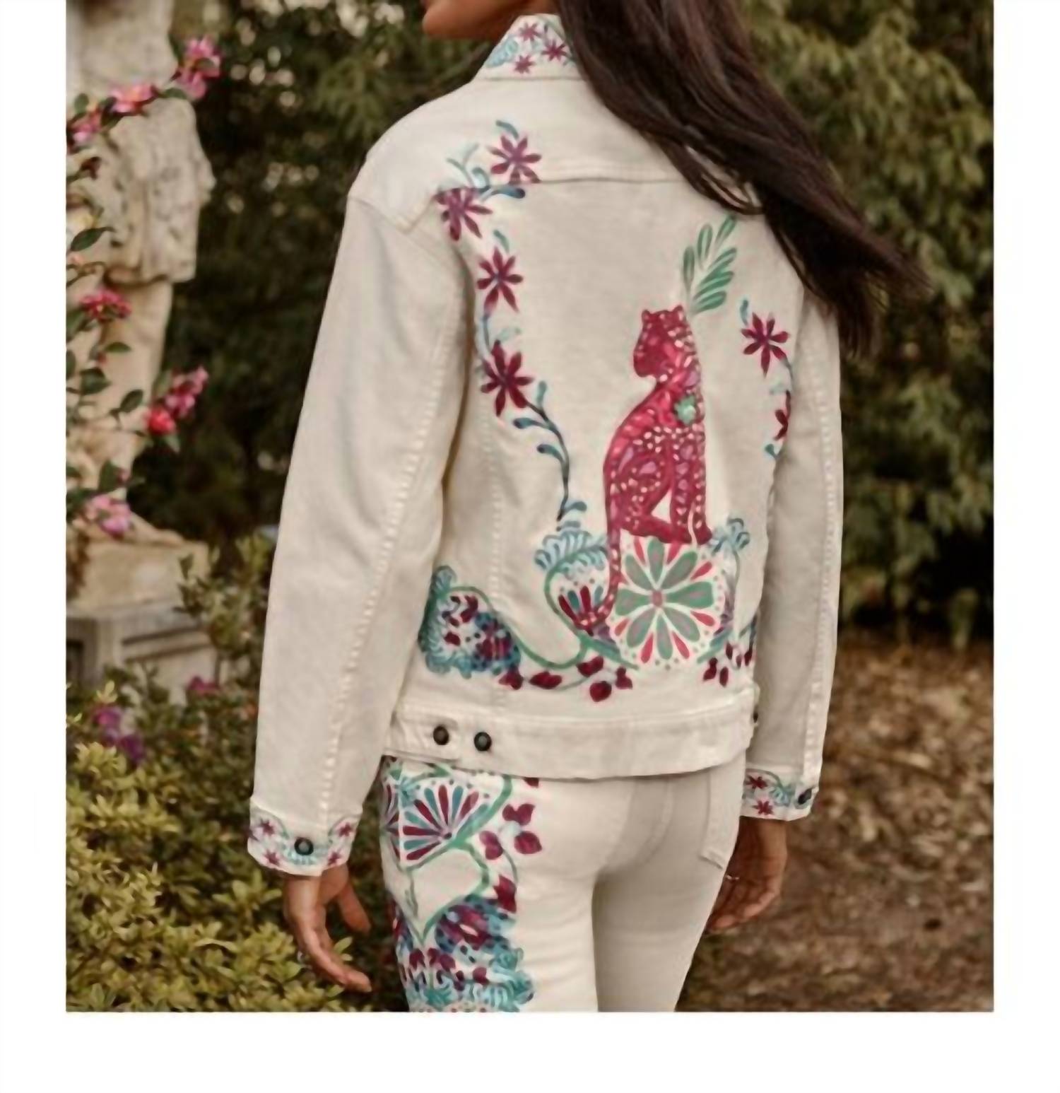 Classic, cool and works with almost any outfit choice. Made from luxurious cream-colored denim, the Leilana Classic Denim Jacket provides a fresh take on a timeless wardrobe staple. This casual jacket is crafted from a cotton blend with a touch of stretch. It features slip pockets and a vibrant flora and fauna print. Machine Wash
