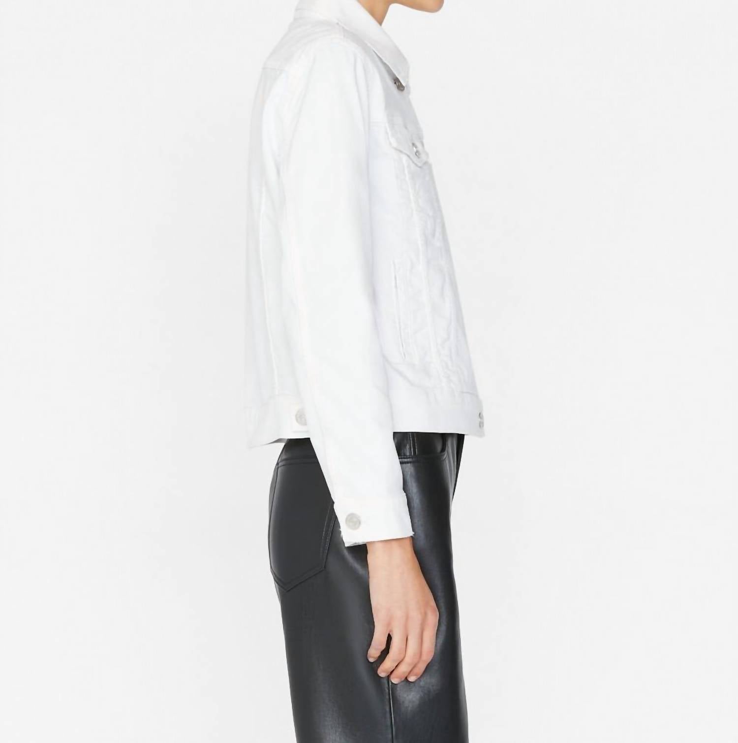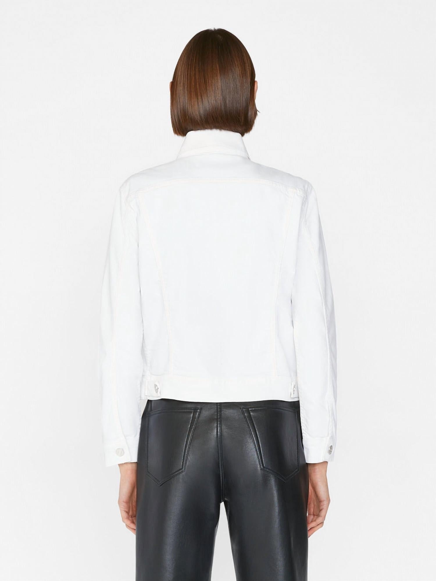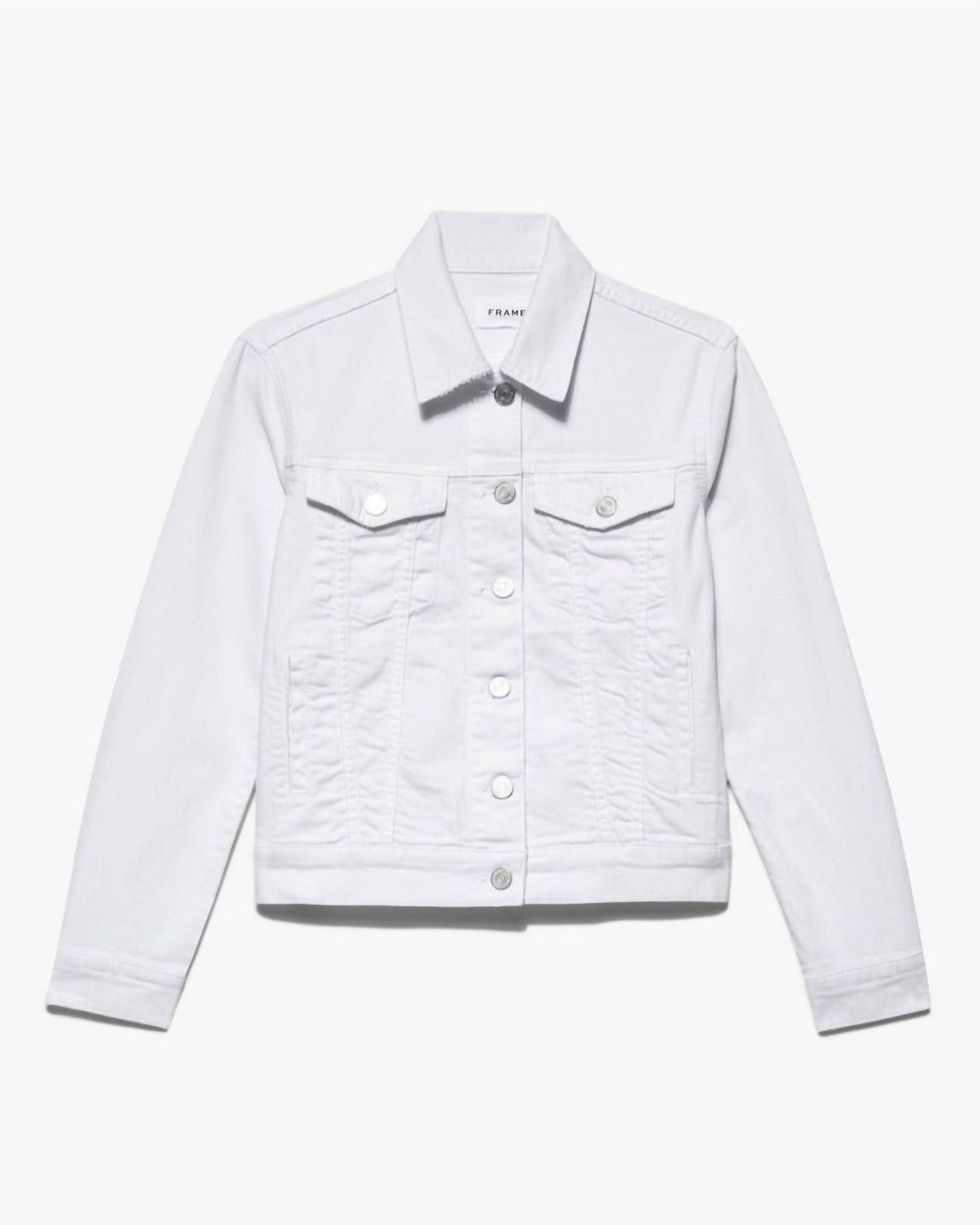 The perfect jean jacket for those slightly crisper days between seasons. Elevate your style with FRAME's Le Vintage Denim Jacket in crisp white, a perfect blend of rugged and refined aesthetics. This jean jacket features long sleeves and is crafted from a premium cotton blend, comprising 79% Cotton, 20% Pre-Consumer Recycled Cotton, and 1% Elastane, offering both comfort and sustainability. Designed with distressed detailing and a classic button closure, it effortlessly transitions from day to night, making it ideal for any occasion. For easy upkeep, this stylish piece can be machine washed and tumble dried.
