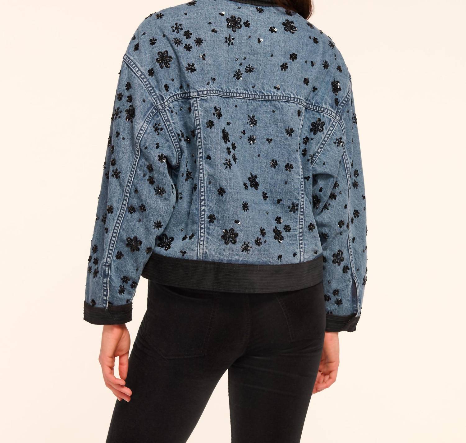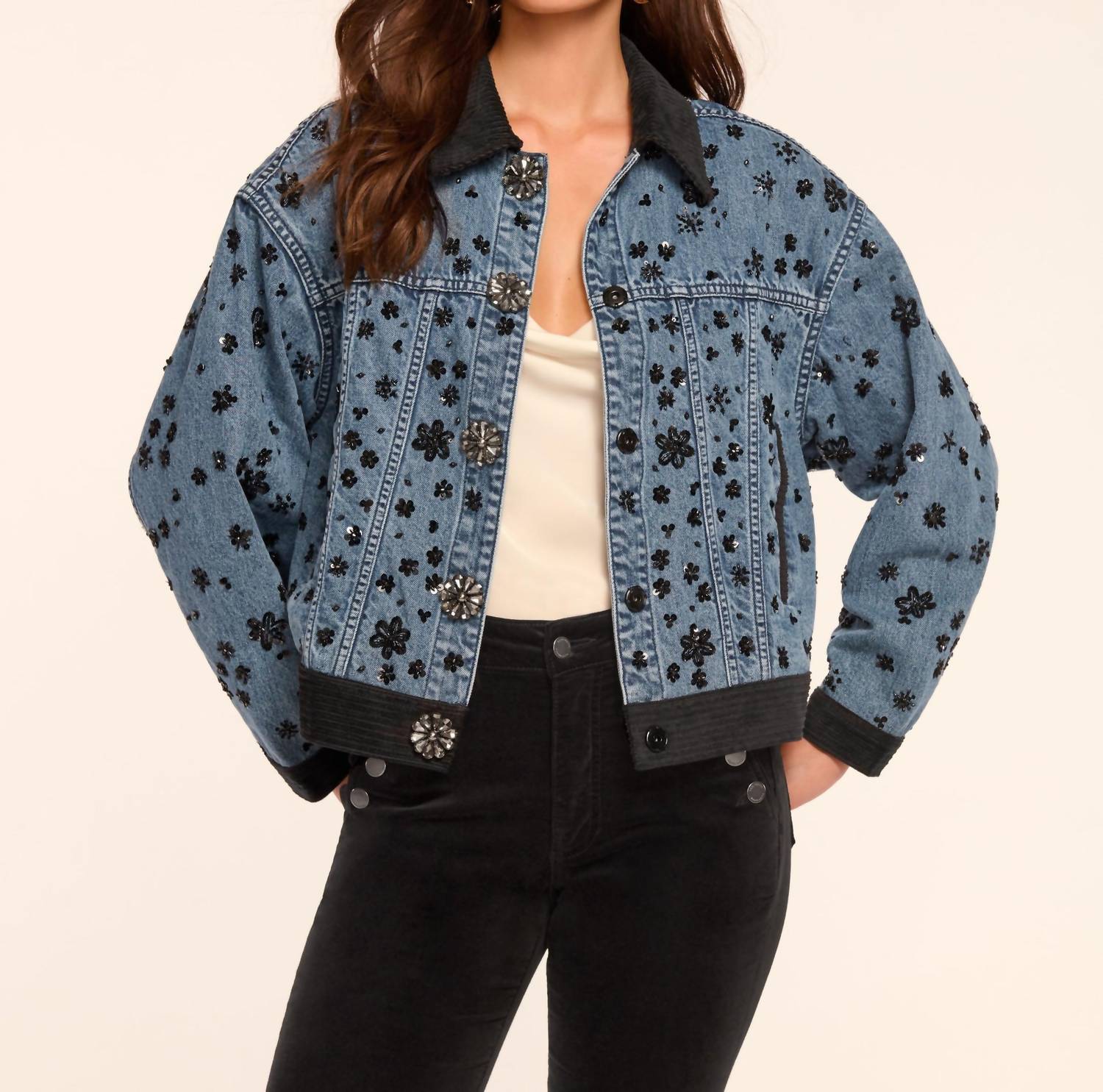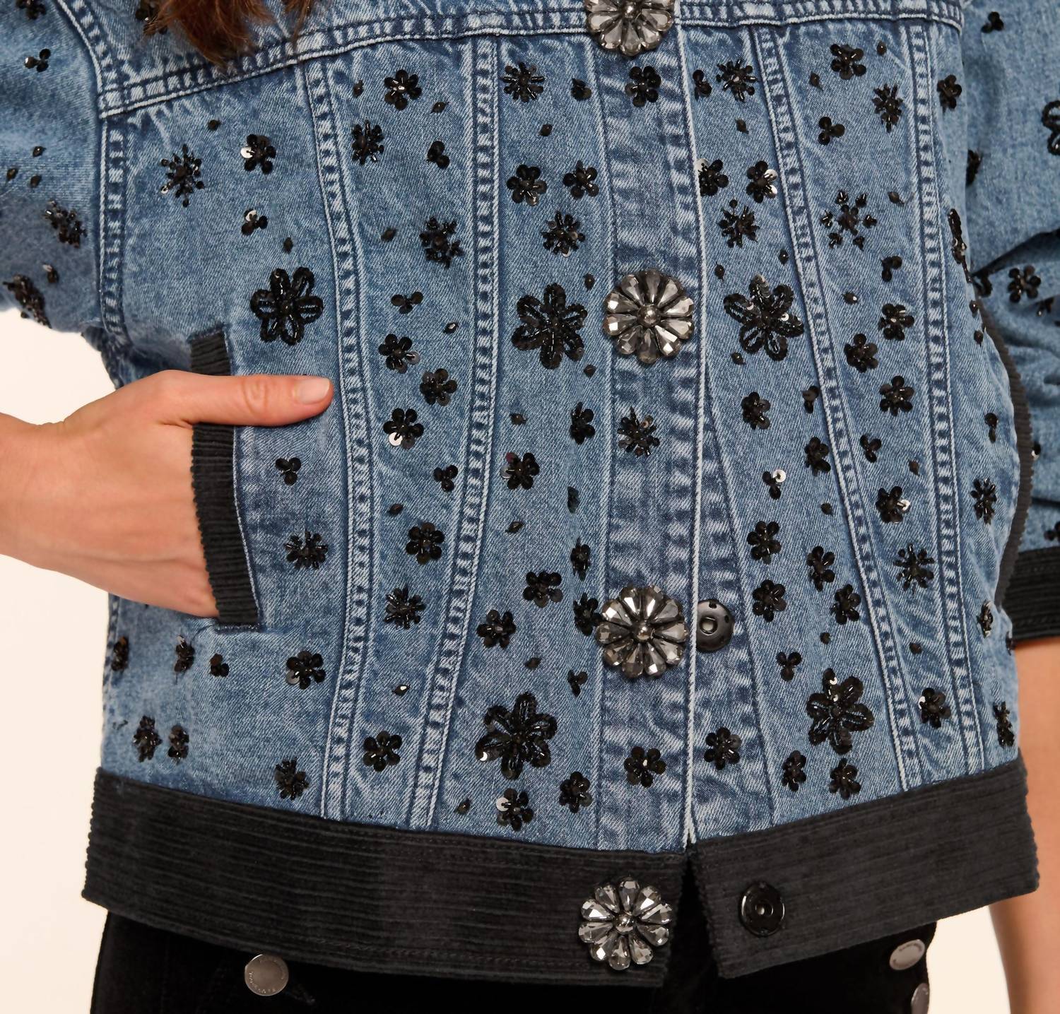 Classic, cool and works with almost any outfit choice. Introducing the Robin Embellished Jean Jacket by Ramy Brook, a perfect blend of luxury and casual style. This women's jacket features long sleeves and is crafted from 100% cotton, adorned with intricately beaded floral embellishments for a textured appeal. It showcases rhinestone flower buttons for a statement look and includes contrast corduroy trim for added polish. Closure: Button closure. Model wears size XS and stands 5'9".