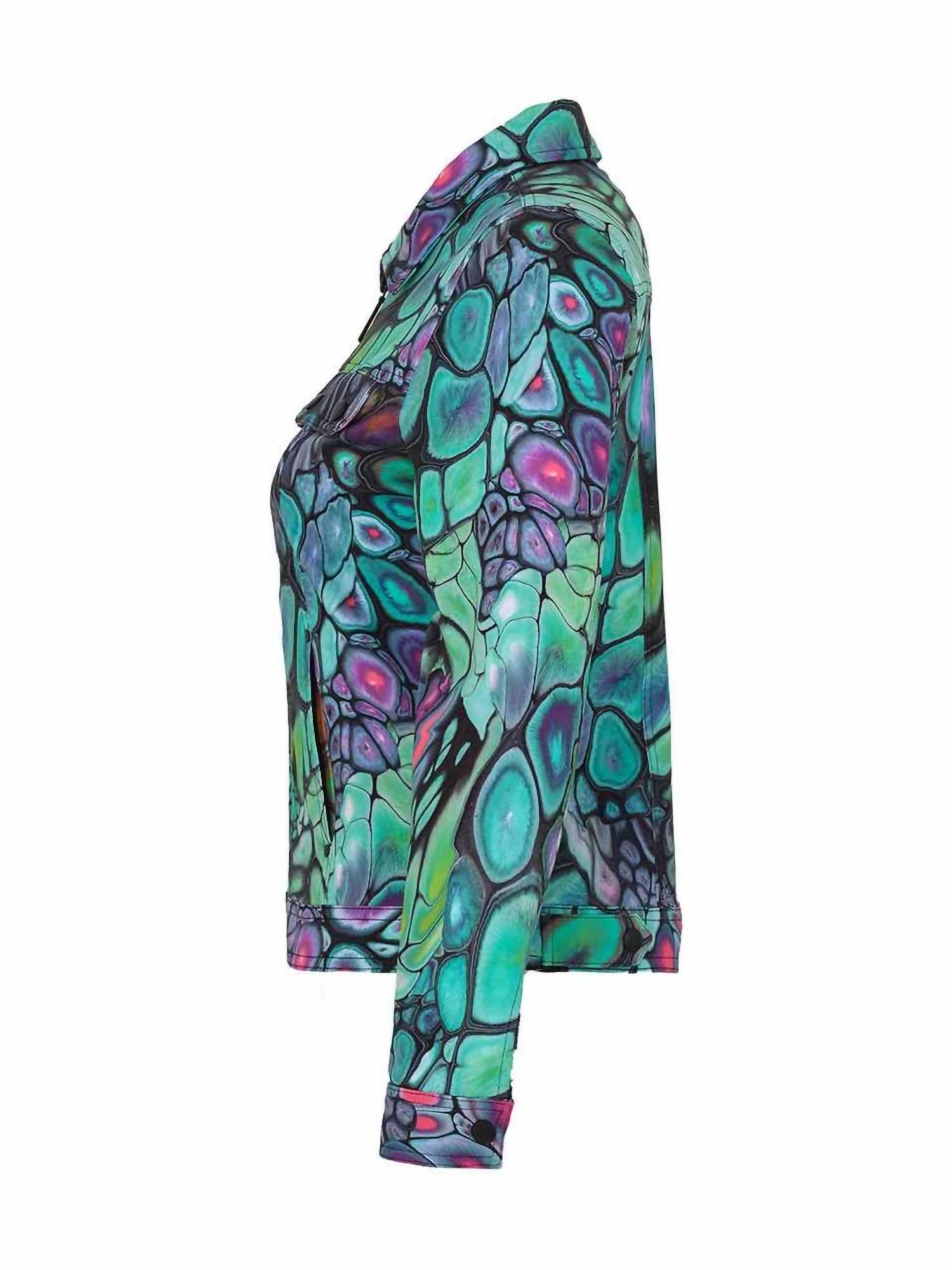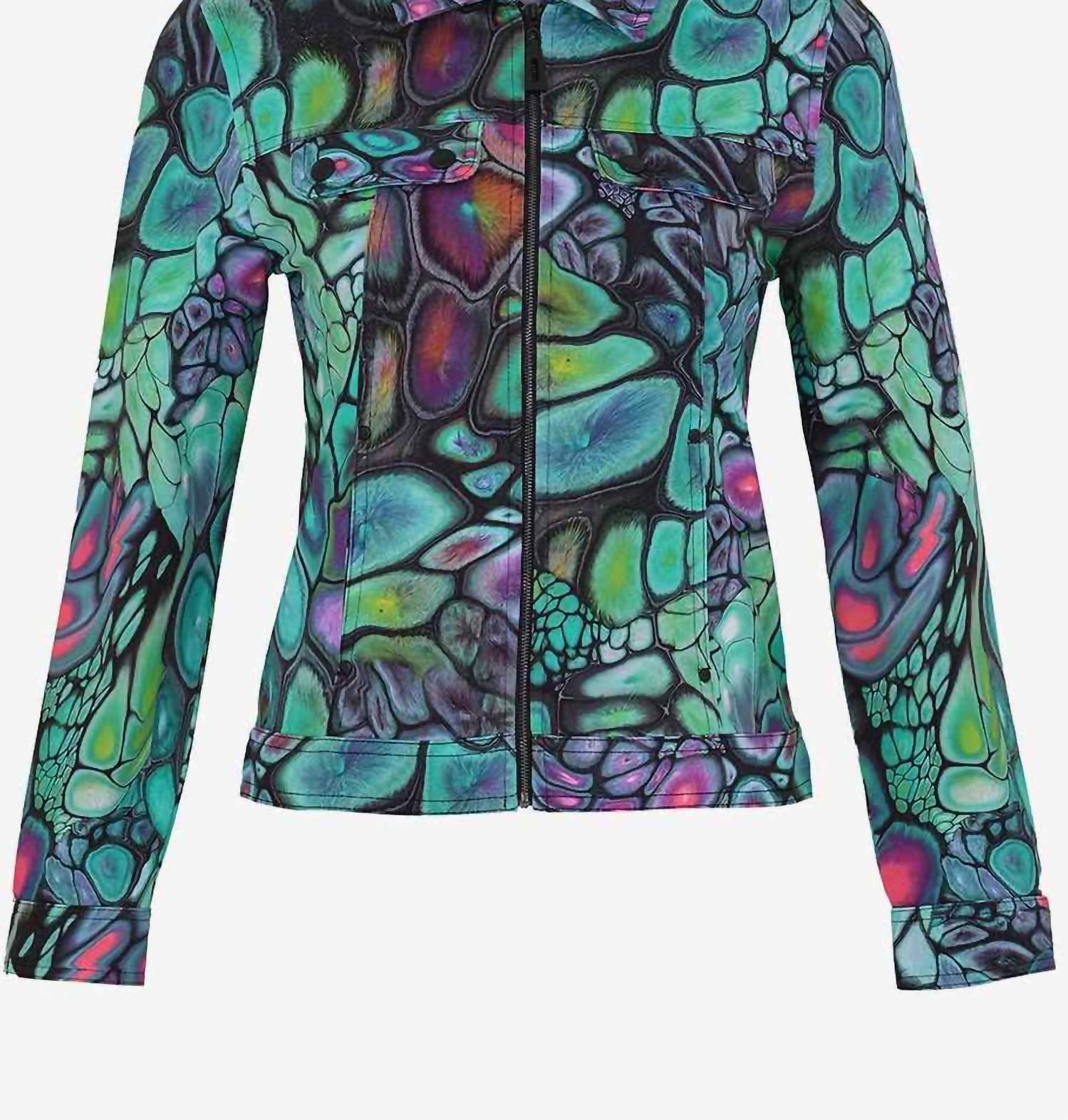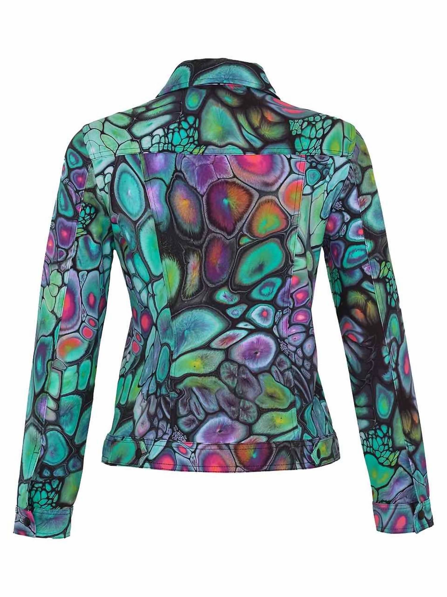 The perfect jean jacket for those slightly crisper days between seasons. Meet the Fantasy Print Zip Jacket by DOLCEZZA, showcasing a unique design with full-length sleeves and an all-over print by English artist Maria Brookes. Made from a cotton blend, this stylish piece features a front zip closure and collar, with two functional pockets and two faux breast pockets for added detail. The garment has a total length of 22'' and includes button cuffs, all unlined for a lightweight feel. Composition: 75% Cotton, 15% Polyester, 10% Elastane.