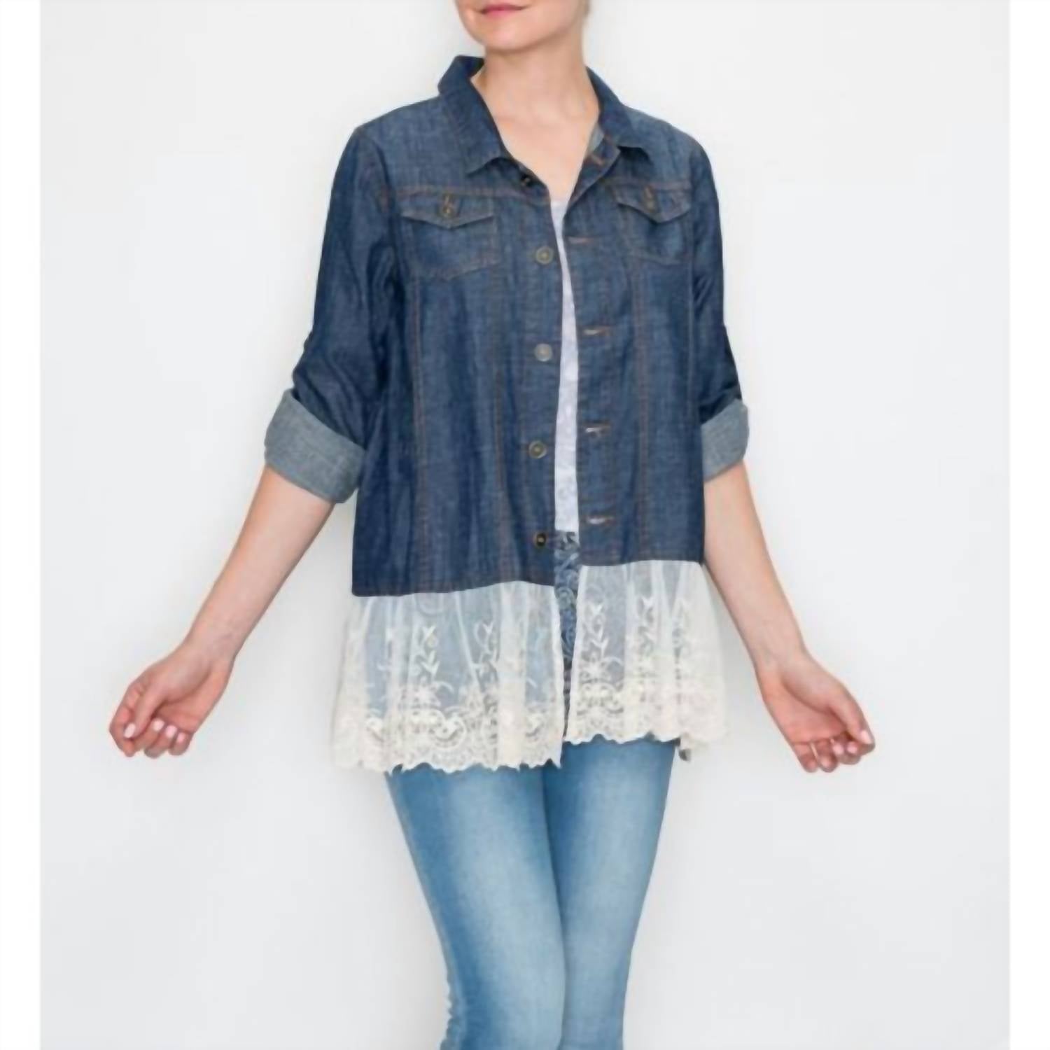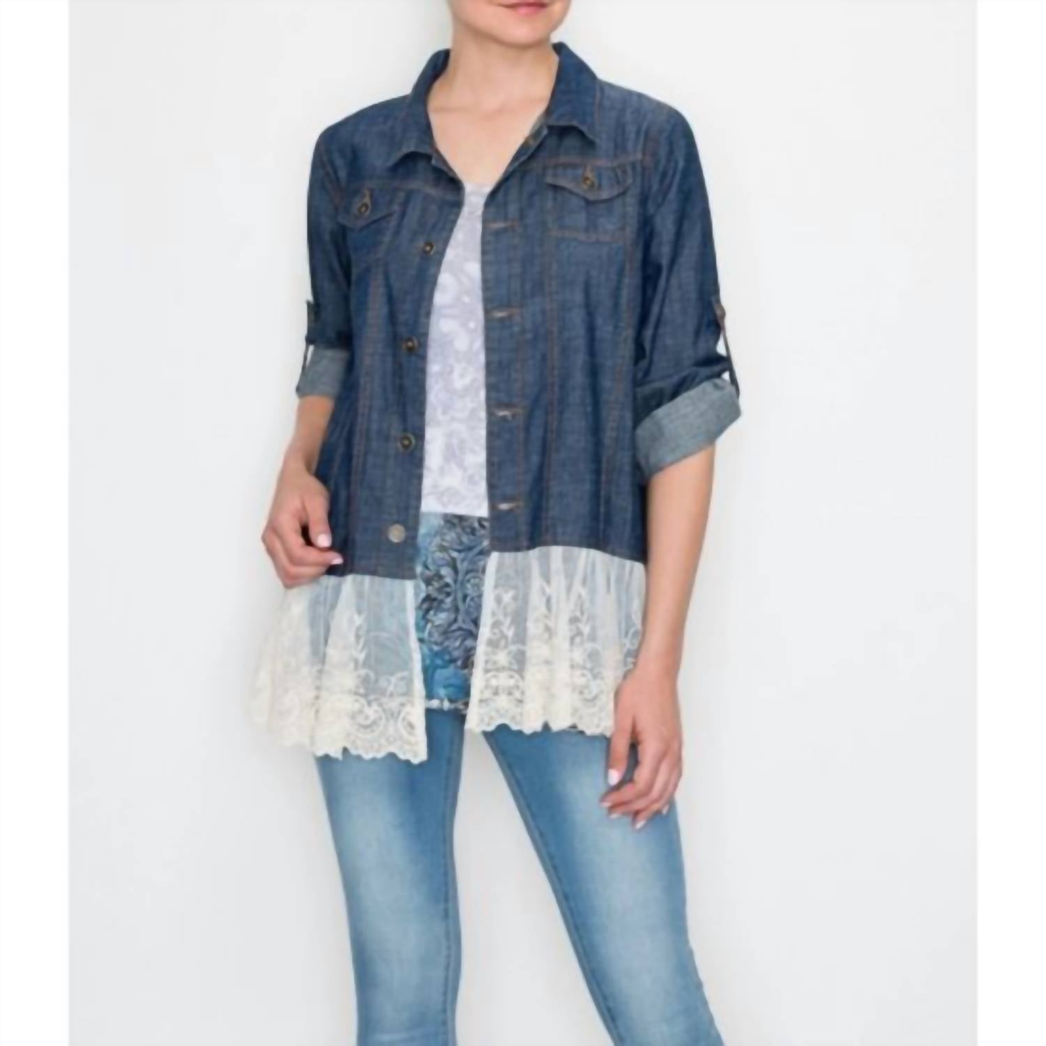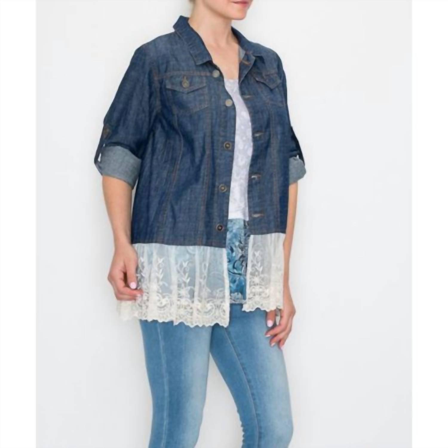Throw this adorable jacket over just about anything for an effortlessly stylish look. Introducing the Women's Denim Jacket by Origami, a chic addition to any wardrobe with its short sleeves and blue hue. Crafted from a soft blend of 50% cotton and 50% polyester, this jacket features textured material with natural lace trimming along the hemline for added feminine flair. Designed with a stylish collar, rolled sleeves, and button closure, it includes convenient pockets and lining, ensuring comfort and functionality. Perfect for layering, this versatile piece embraces a streetwear trend, ideal for summer vacation getaways. Care: Machine wash and tumble dry.
