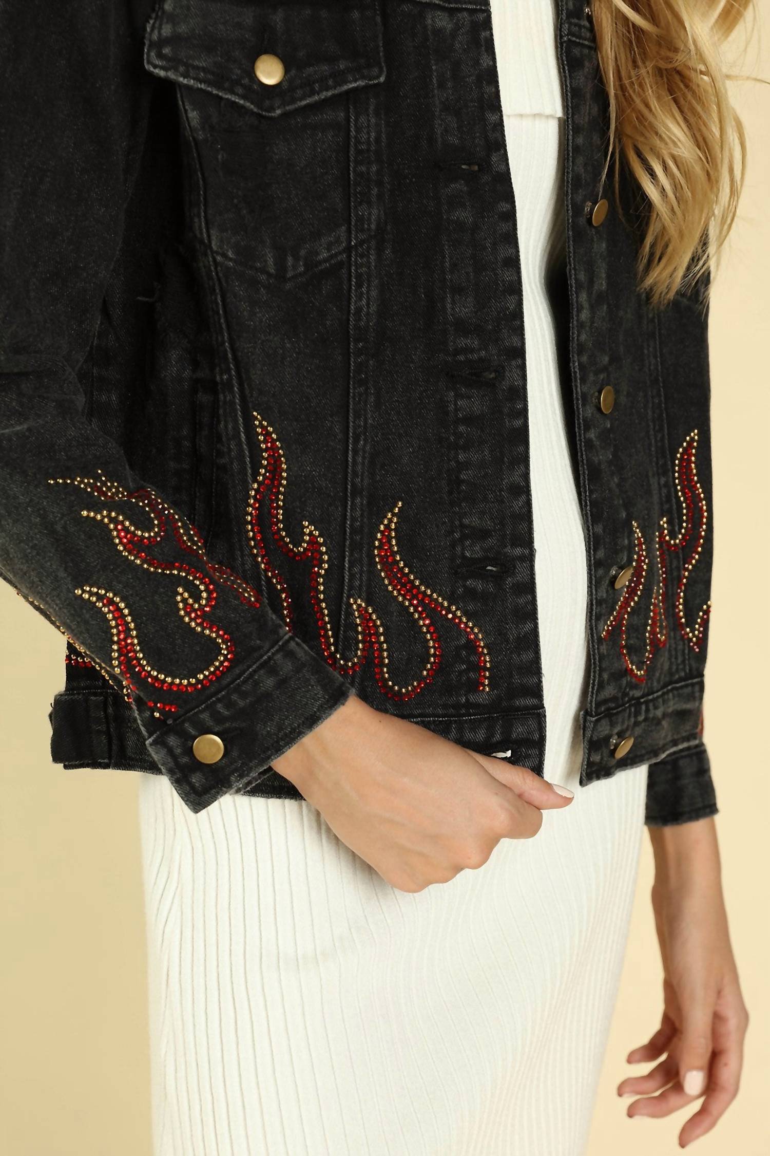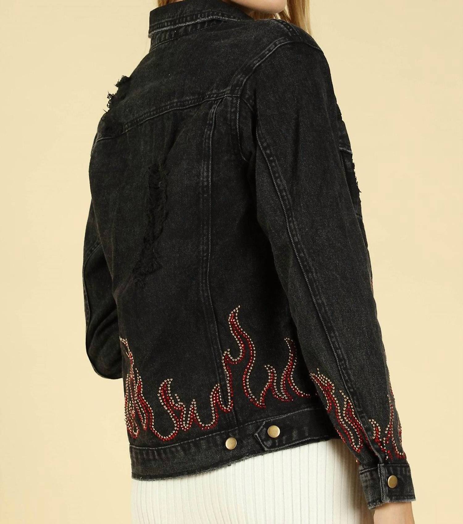 It's a classic jacket with a twist. It features a classic collar, button down front, four pockets, long sleeves, distressed detailing and flame rhinestones. Small Bust 38" Length 23", Medium Bust 40" Length 23", Large Bust 42" Length 23". 100% cotton.