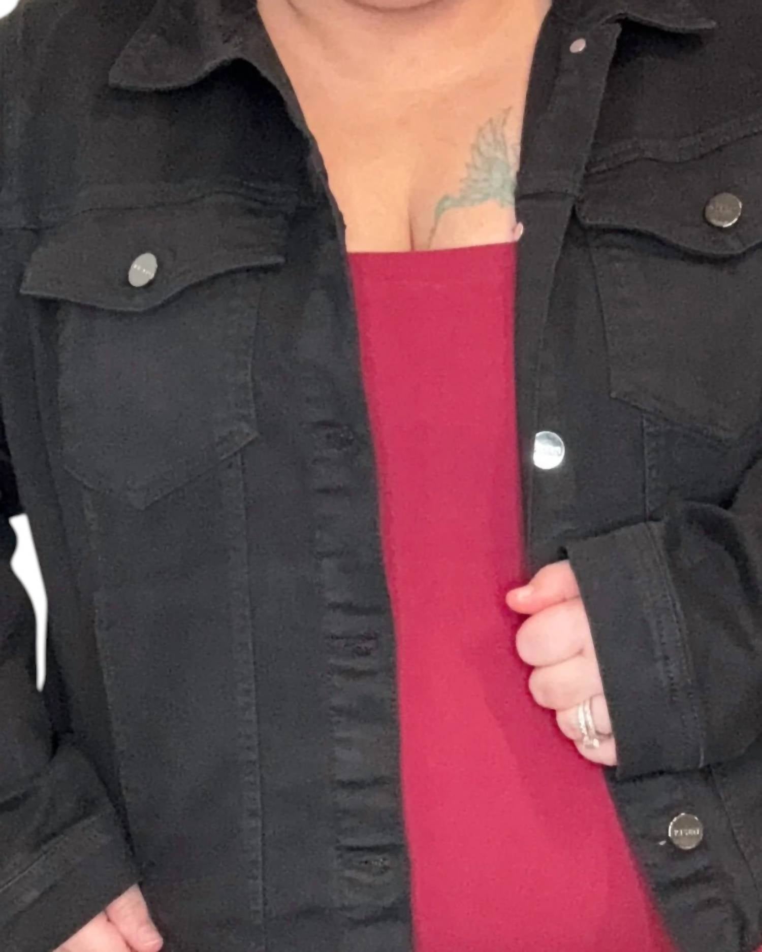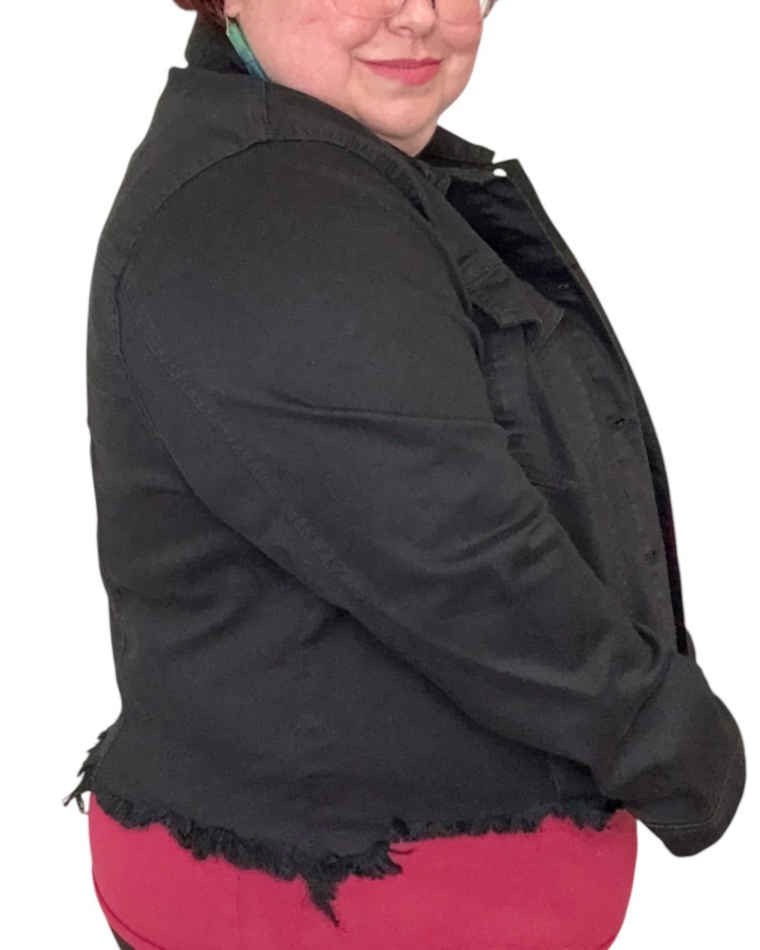 Classic, cool and works with almost any outfit choice. Elevate your streetwear with the Beauty Denim Jacket by RISEN, a chic black denim piece perfect for casual elegance. Designed with long sleeves, this jacket features a 92% cotton, 6% polyester, and 2% spandex blend, emphasizing comfort and style. The irregular fray hem and textured pattern add an edgy touch, with a collar neckline and convenient button closure. Practicality meets style with pockets included, while the jacket is easy-to-care for with machine wash and tumble dry instructions.