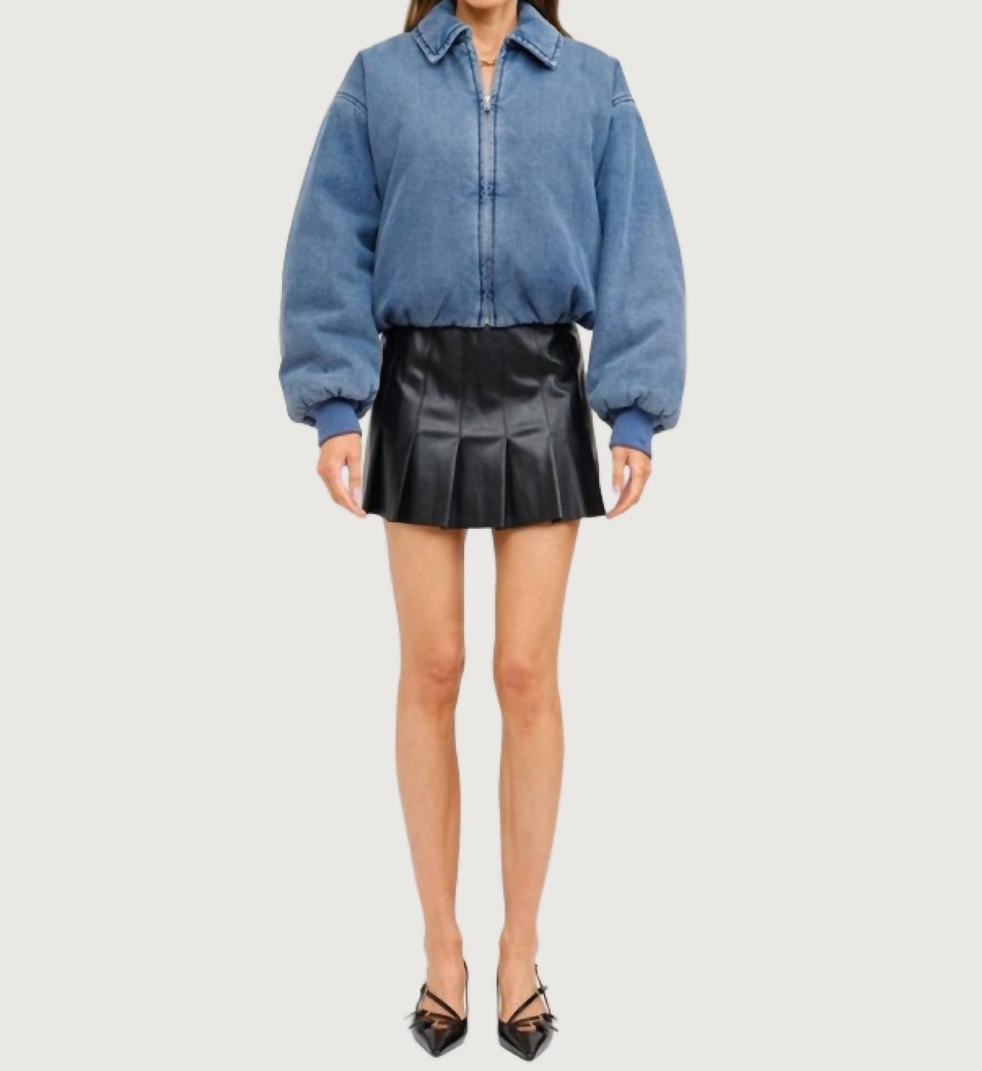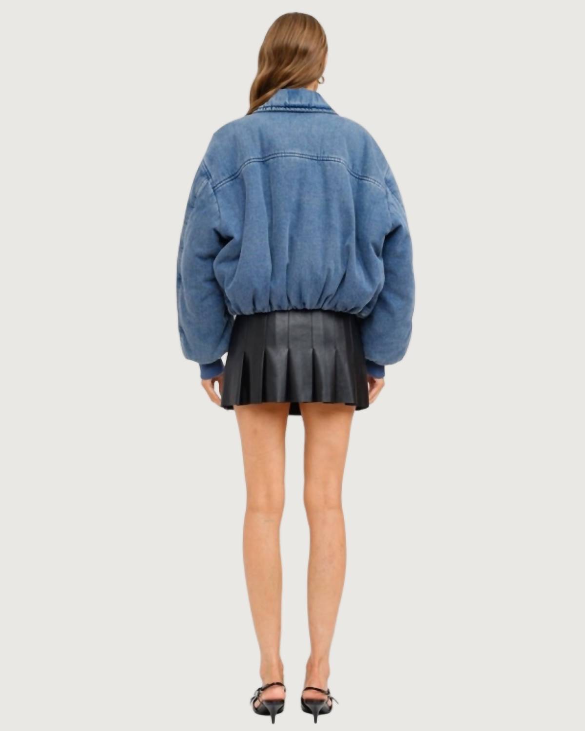 The perfect jean jacket for those slightly crisper days between seasons. Meet the Pierre Denim Jacket by Sofie the Label, a chic nod to 90s fashion perfect for your fall travel needs. This women's jean jacket in classic blue is crafted from solid denim and showcases a bubble hem, long sleeves with elastic cuffs, and an elastic waist for a flattering fit. Designed with practicality in mind, it features a convenient zip closure and a stylish collar. Model is wearing a size small.
