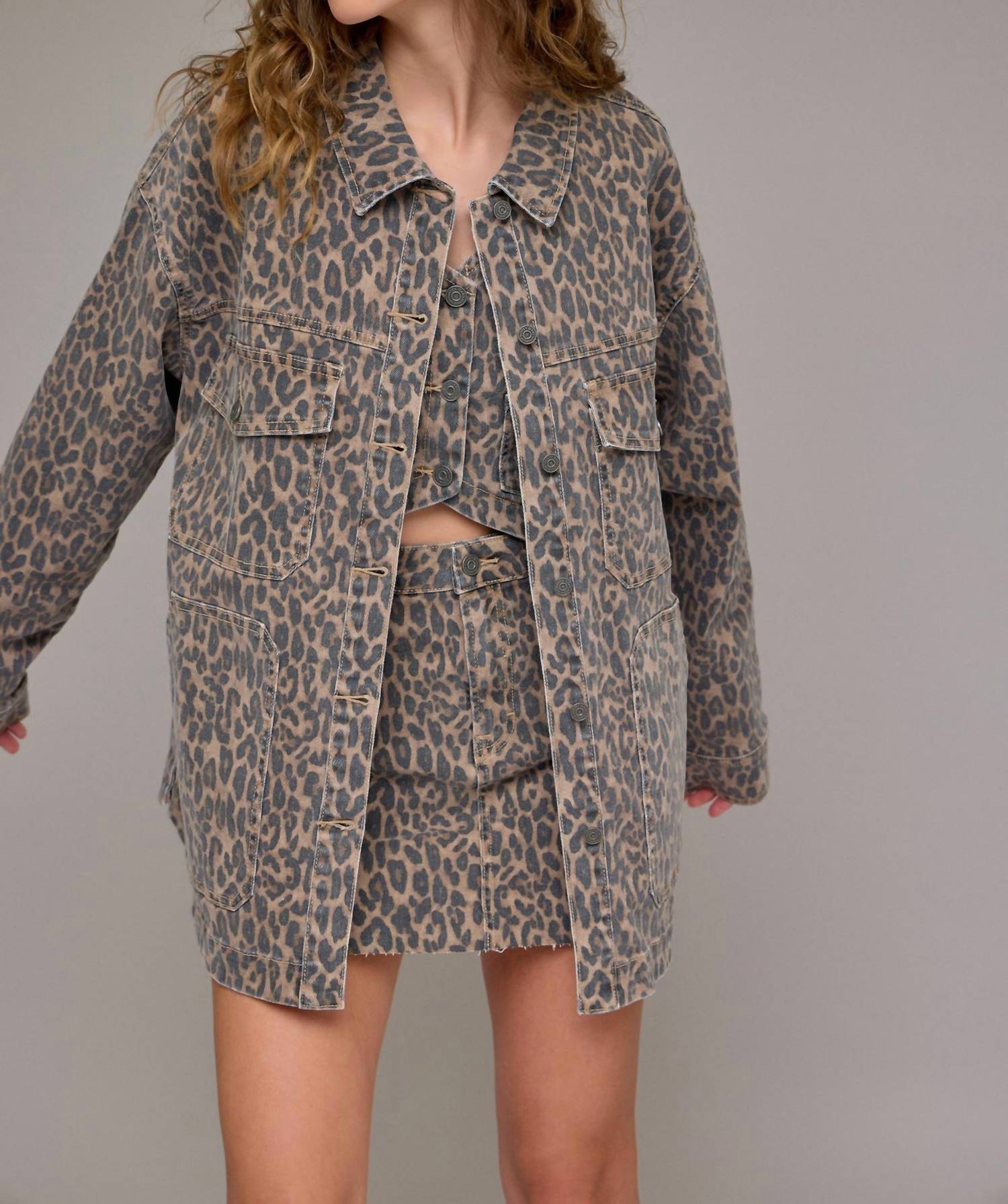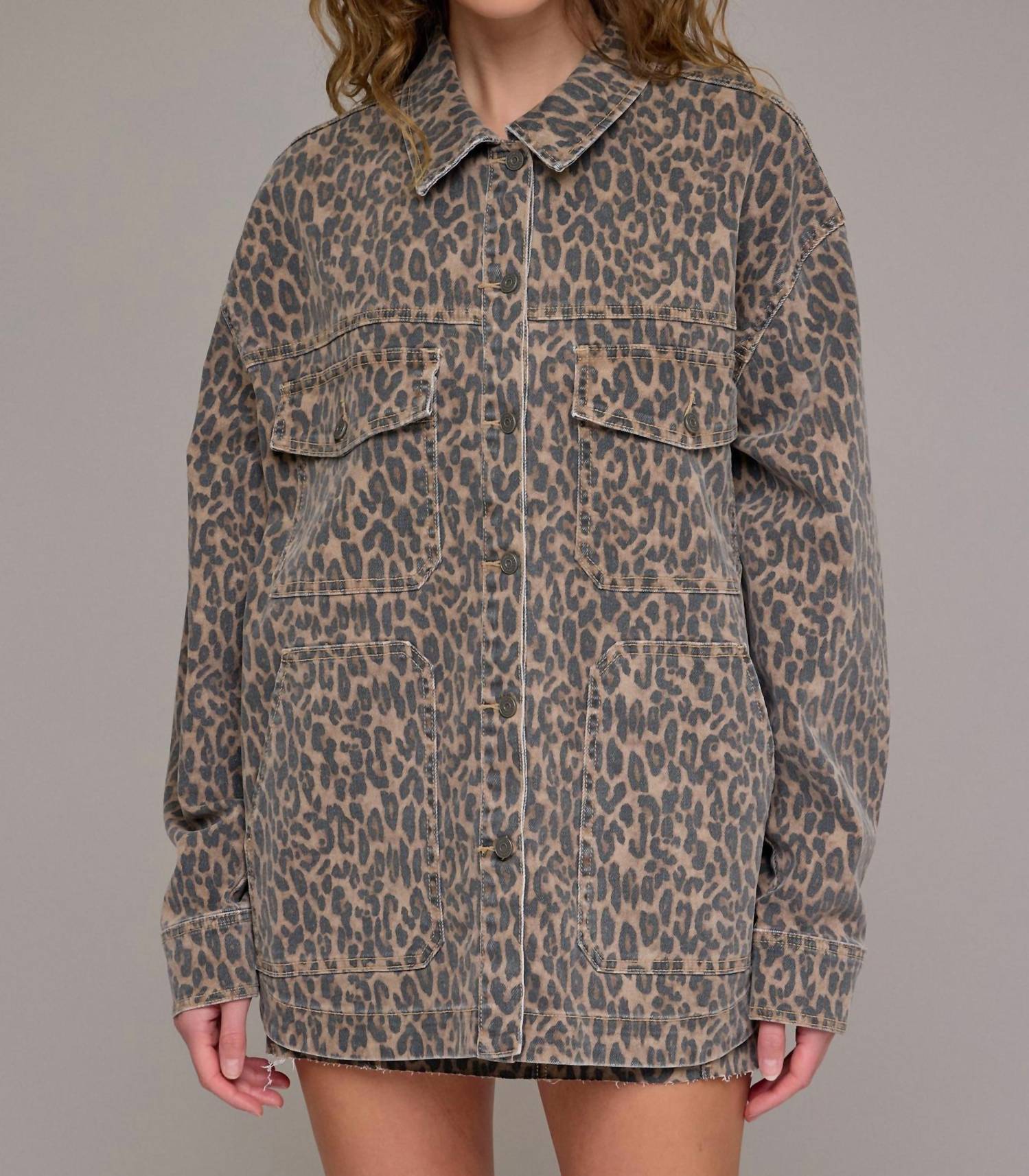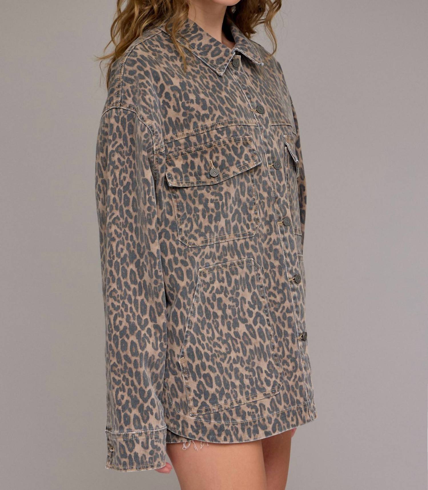 The perfect jean jacket for those slightly crisper days between seasons. Discover the Oversized Denim Jacket by HIDDEN, featuring a striking cheetah print perfect for making a statement. This women's jacket is crafted from a cotton blend (94% Cotton, 5% Polyester, 1% Spandex), offering both durability and comfort. It comes with long sleeves featuring buttoned cuffs and a classic button-down closure, alongside functional front flap pockets. Care for this bold jean jacket is simple with machine wash instructions, making it an effortless addition to any wardrobe.