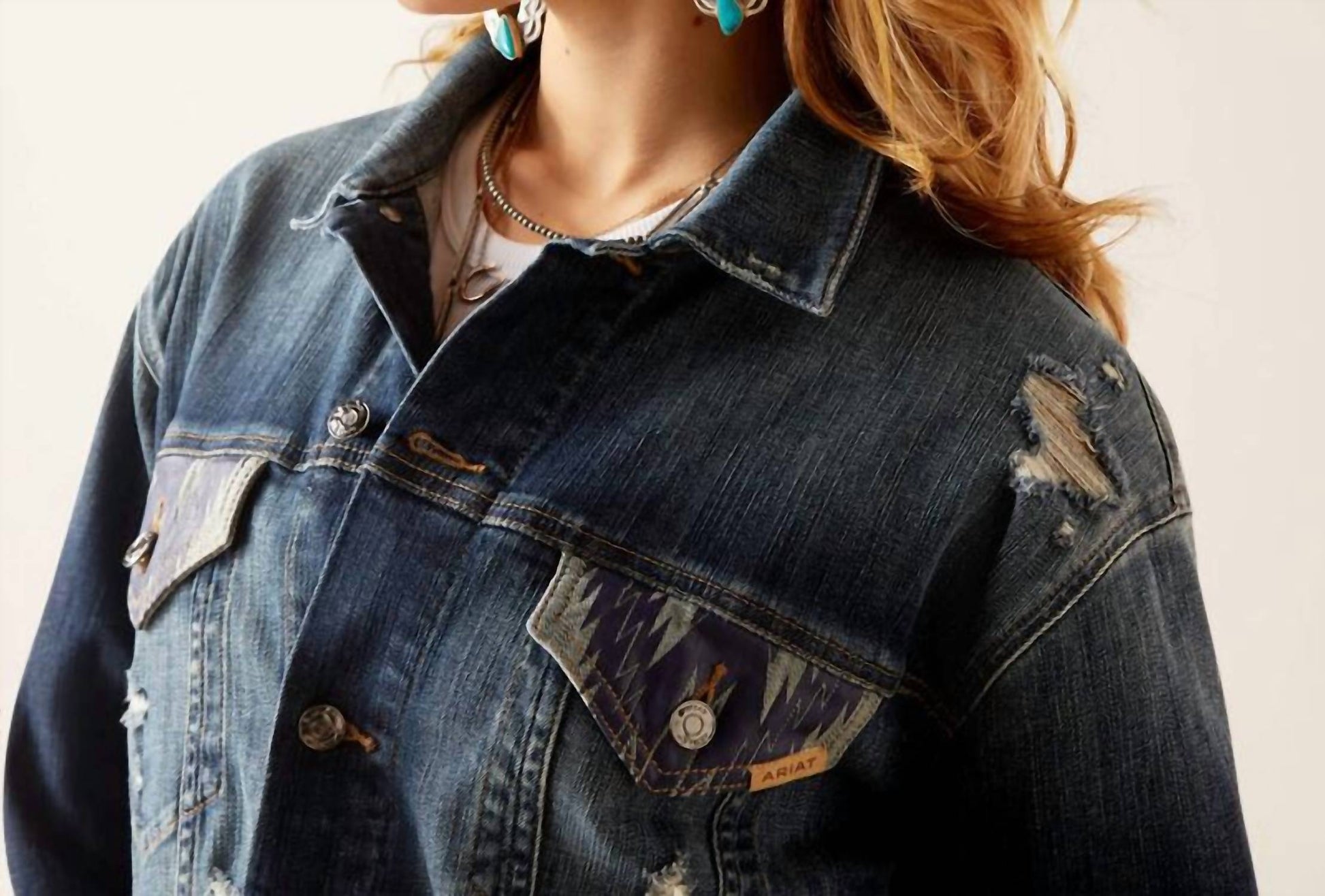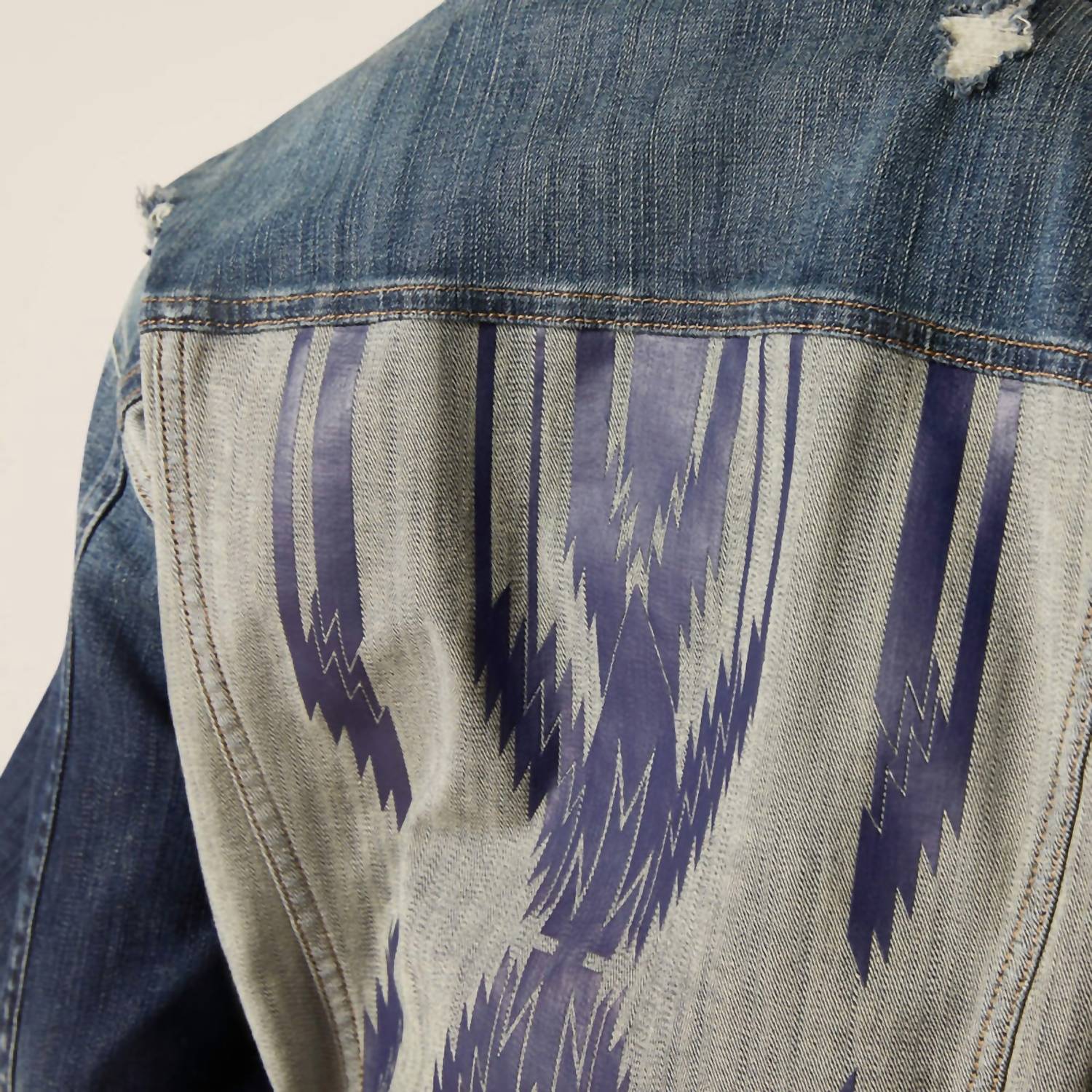 Standout piece in Burbank color. Seamlessly blends traditional weaving with modern flair. Featuring long sleeves. Crafted from 9.75 oz ring-spun stretch denim. Boasts a Chimayo motif print and reverse denim detailing on its pockets. Made from 93% cotton, 5% polyester, and 2% Lycra Spandex elastane. Offers a button closure and a classic collar neckline. Intricate fashion destruction at the shoulders.