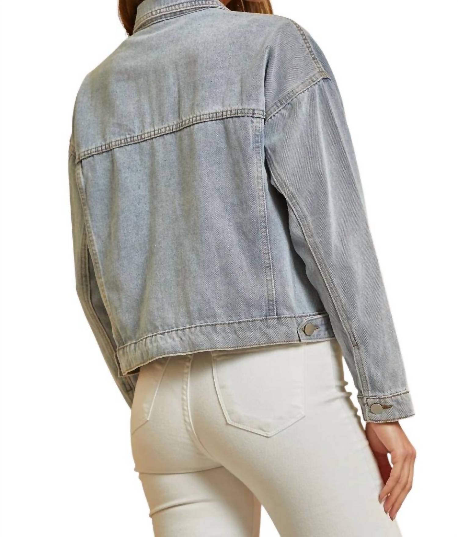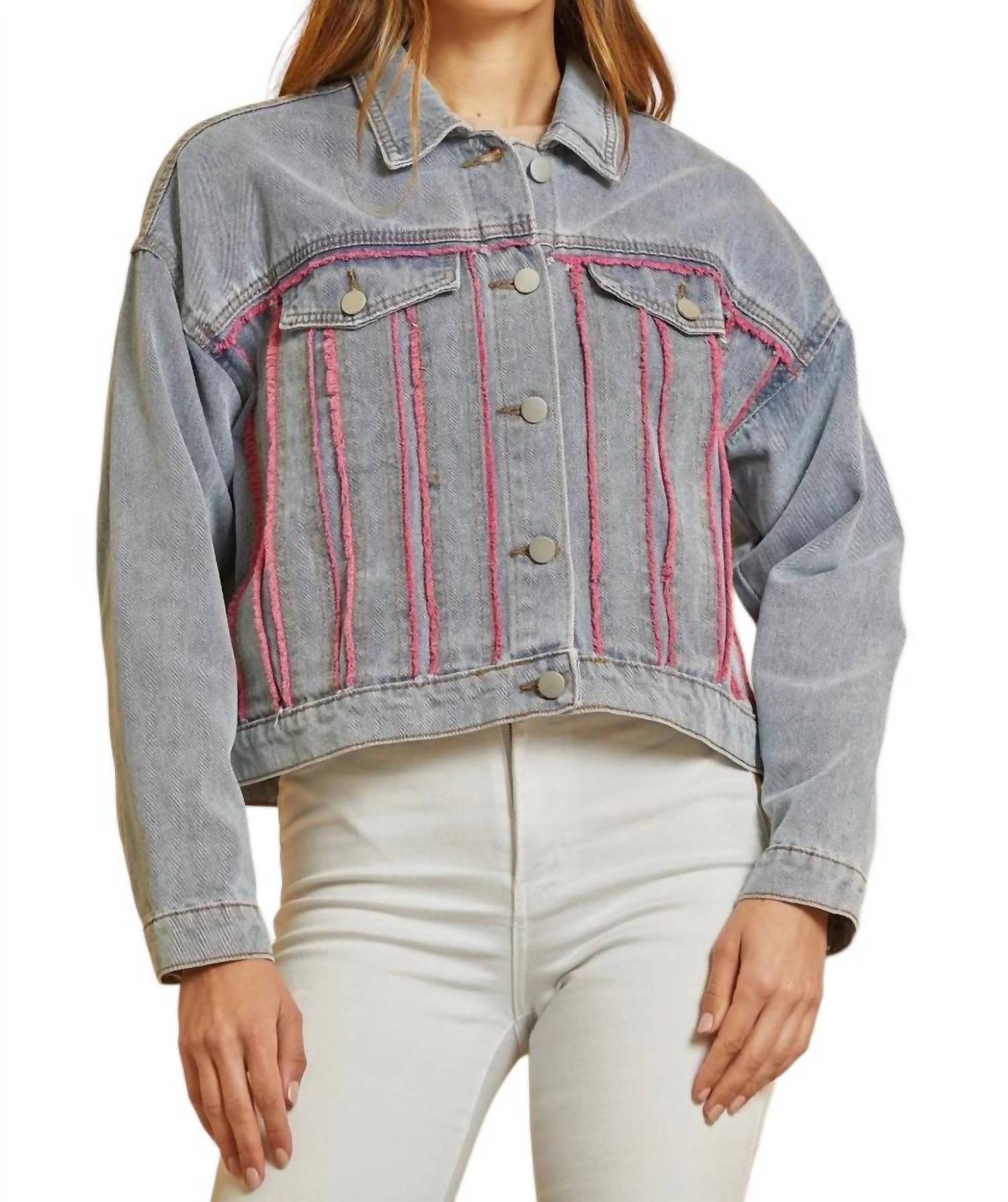 This denim jacket features raw edge accents on the front and back, with a slight loose fit. It has long sleeves, a collar, a button closure, and a double-breasted design. Made from 78% cotton and 22% polyester.