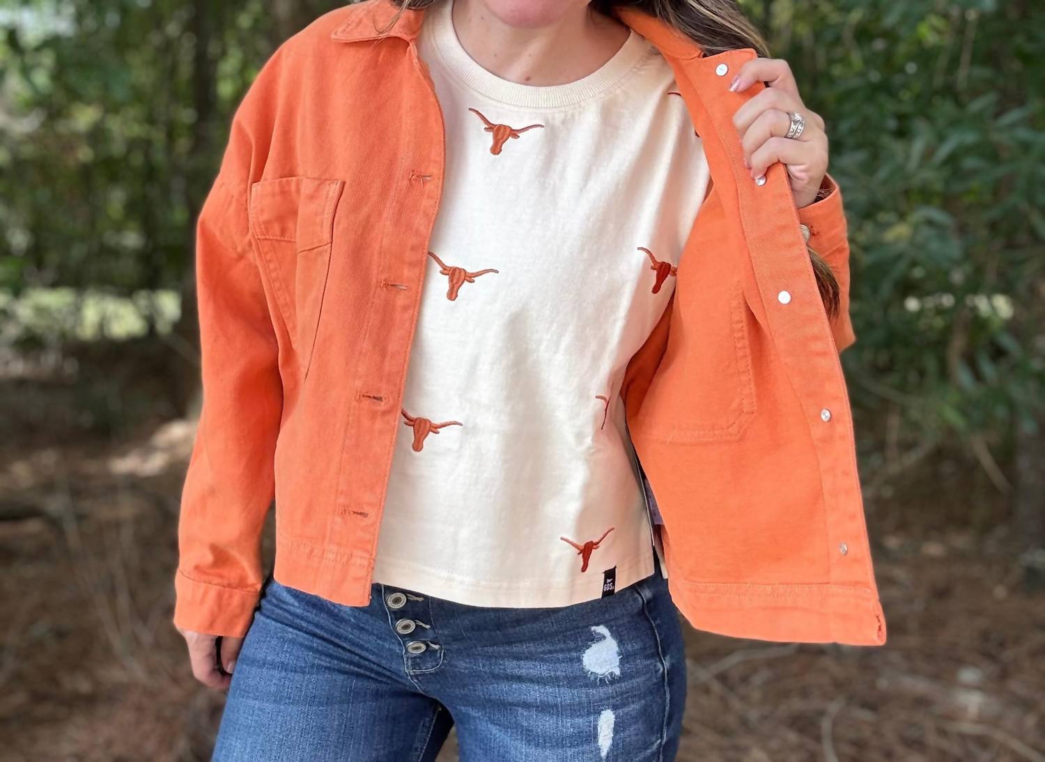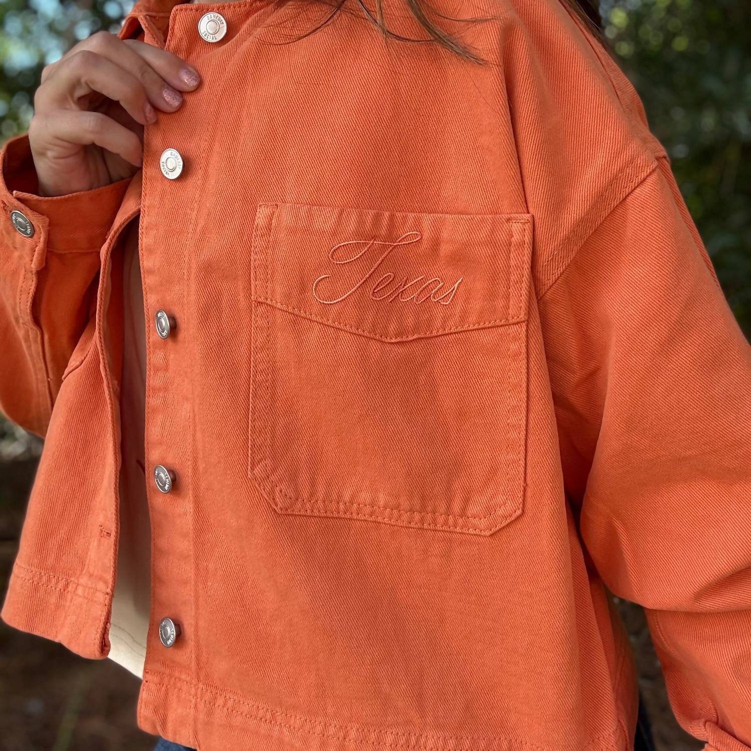Throw this adorable jacket over just about anything for an effortlessly stylish look. Celebrate your Texas pride with the Longhorns Denim Jacket by Gameday Social, a stylish piece perfect for game days and casual outings. This long sleeve jacket is crafted from 100% cotton in a distinctive burnt orange, featuring fun embroidery on the front pocket and back. Designed with a classic collar, it offers a true-to-size fit and fastens with a five-button closure. For care, machine wash and tumble dry to maintain its vibrant look.
