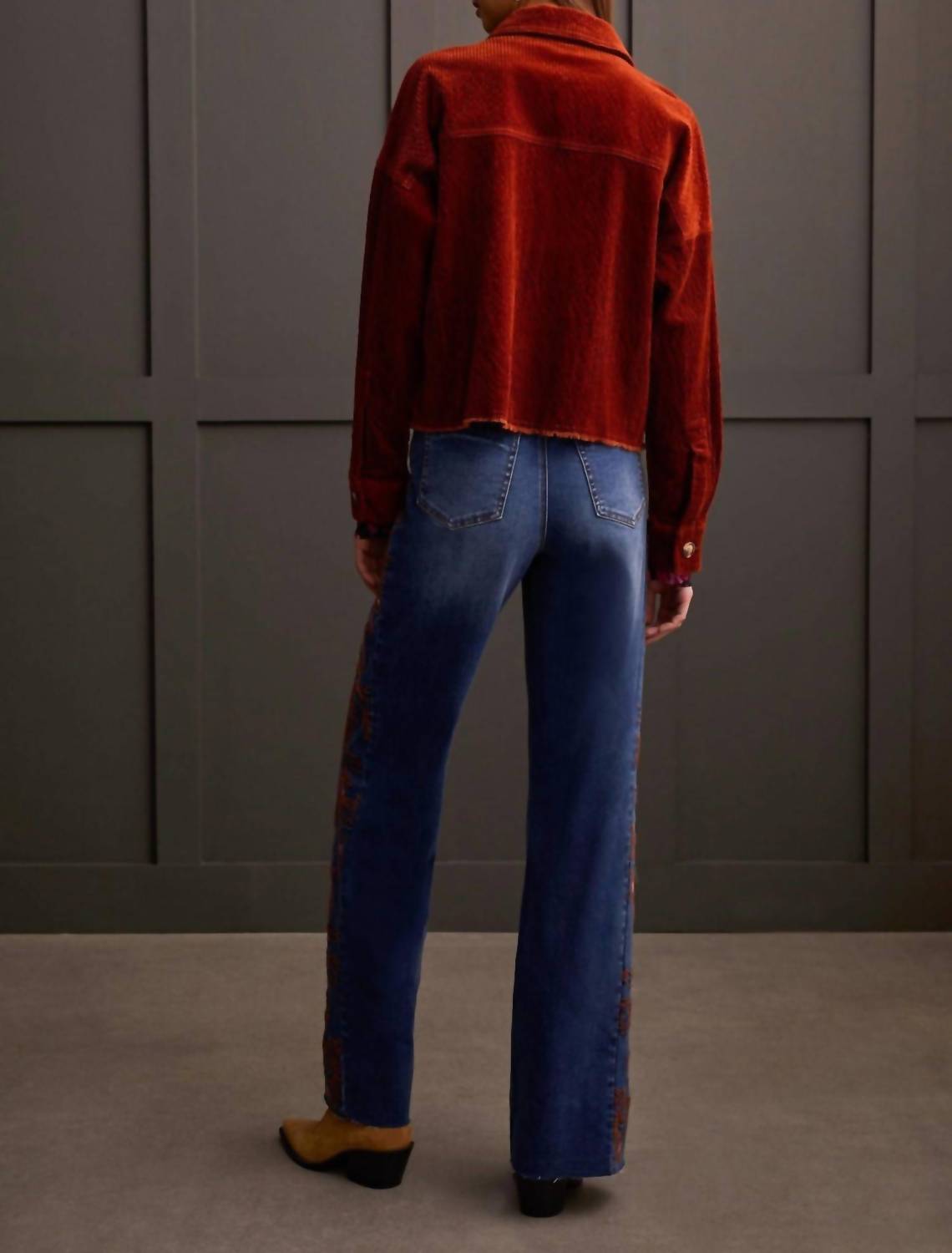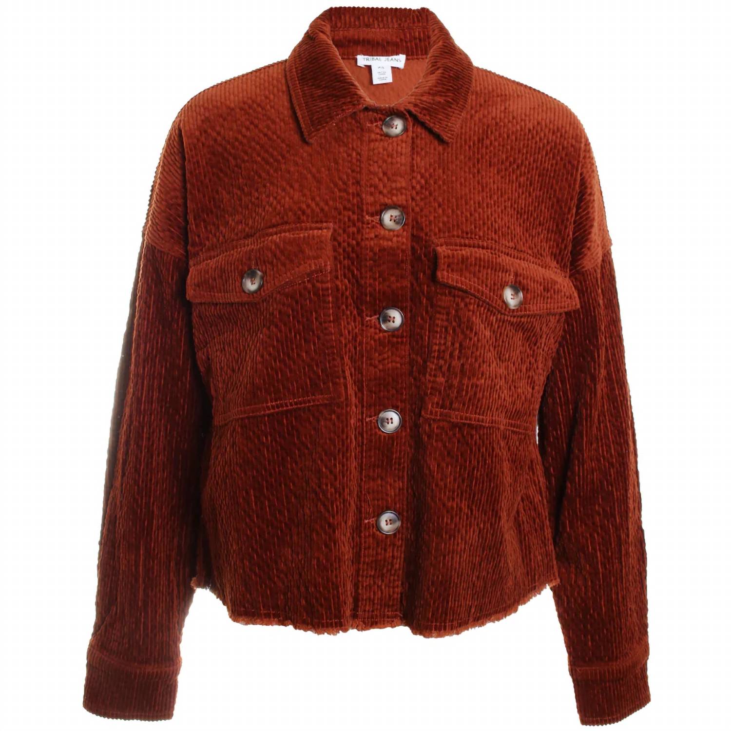 The perfect jean jacket for those slightly crisper days between seasons. Step back in time with the TRIBAL Crop Denim Shacket in a warm Pumpkin Spice hue, perfect for Thanksgiving gatherings and fall concerts. This vintage-inspired piece features long sleeves with opening cuffs and a classic collared neckline, all in a textured corduroy finish. Crafted from a 98% Cotton, 2% Spandex blend, the 21" long shacket is not only stylish but also functional, courtesy of its button-up closure and chest patch pockets. Care instructions: Machine wash on a delicate cycle with cold water and like colors, line dry, and medium iron if necessary.