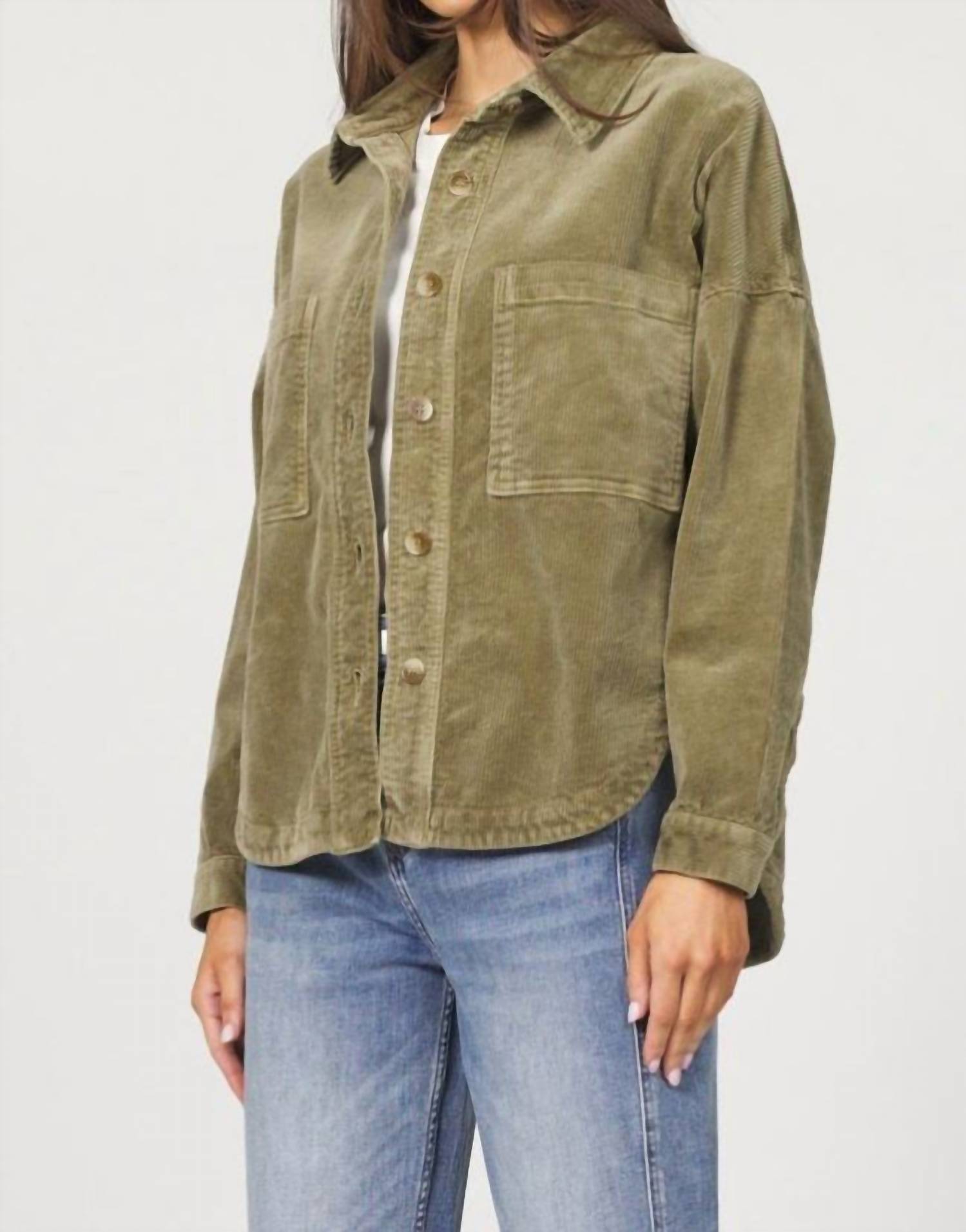 The perfect jean jacket for those slightly crisper days between seasons. The Gina Button Front Oversized Denim Jacket by Dear John Denim is a stylish essential for women this fall. Crafted from a 98% cotton and 2% spandex blend, this jacket features long sleeves and a solid Olive Branch hue, perfect for a minimalist travel ensemble. With a button closure and practical pockets, it offers both fashion and functionality. Easy to care for, simply machine wash and tumble dry for effortless maintenance.