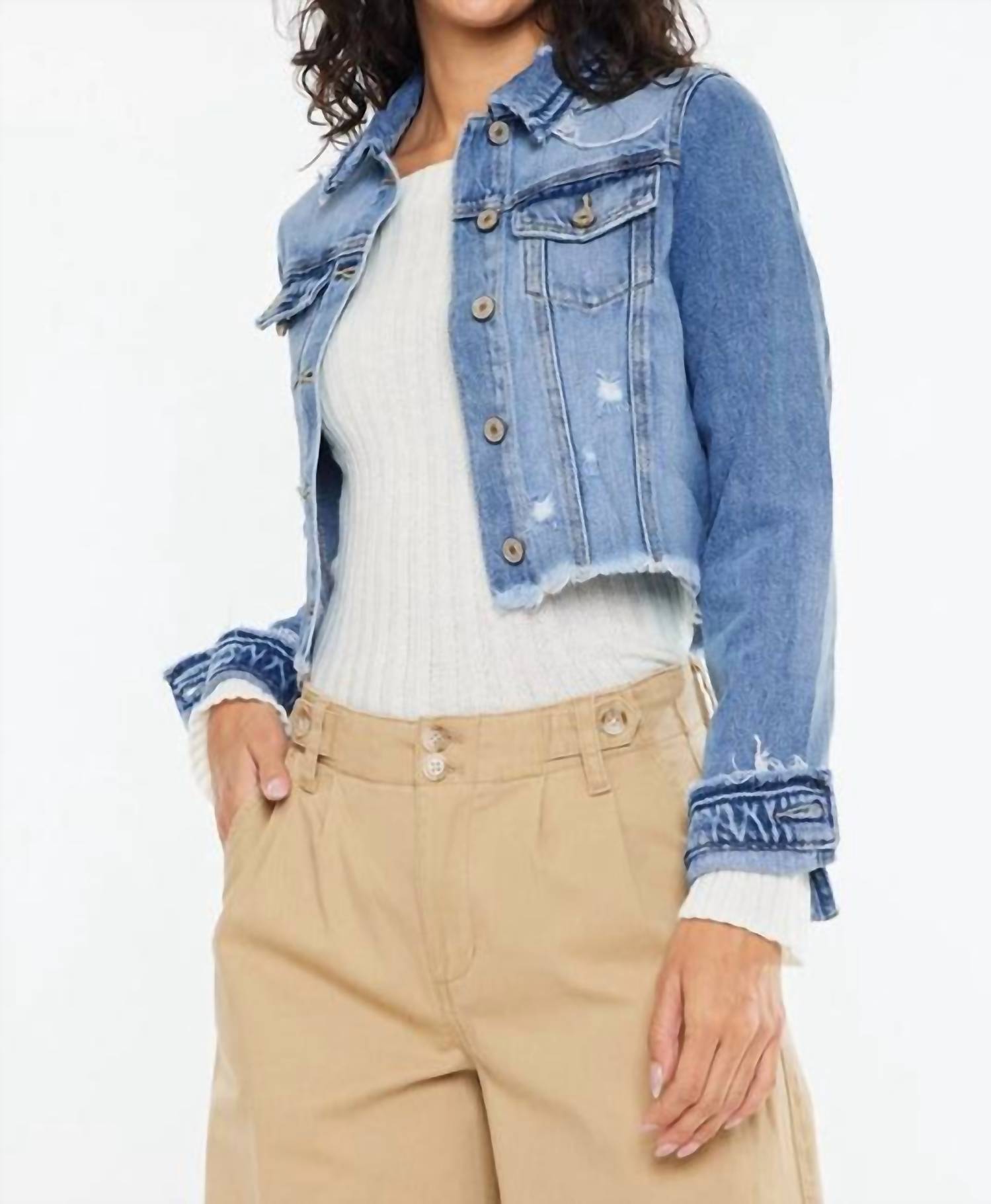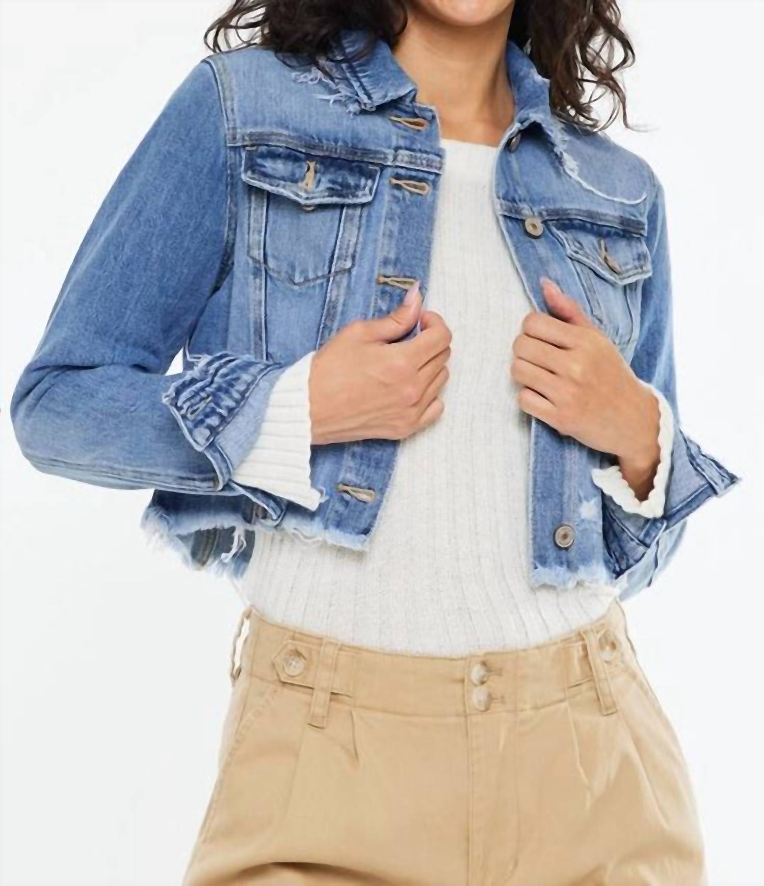 The perfect jean jacket for those slightly crisper days between seasons. Introducing the KanCan Crop Fray Jacket in a stylish light denim, perfect for adding an edgy touch to your spring streetwear wardrobe. This women's jacket features long sleeves and a frayed collar and hem for a distinctive look. Designed with practicality in mind, it includes pockets and a convenient button closure. Ideal for vacations or adding flair to your Easter outfit, this solid pattern jean jacket effortlessly combines style and functionality.