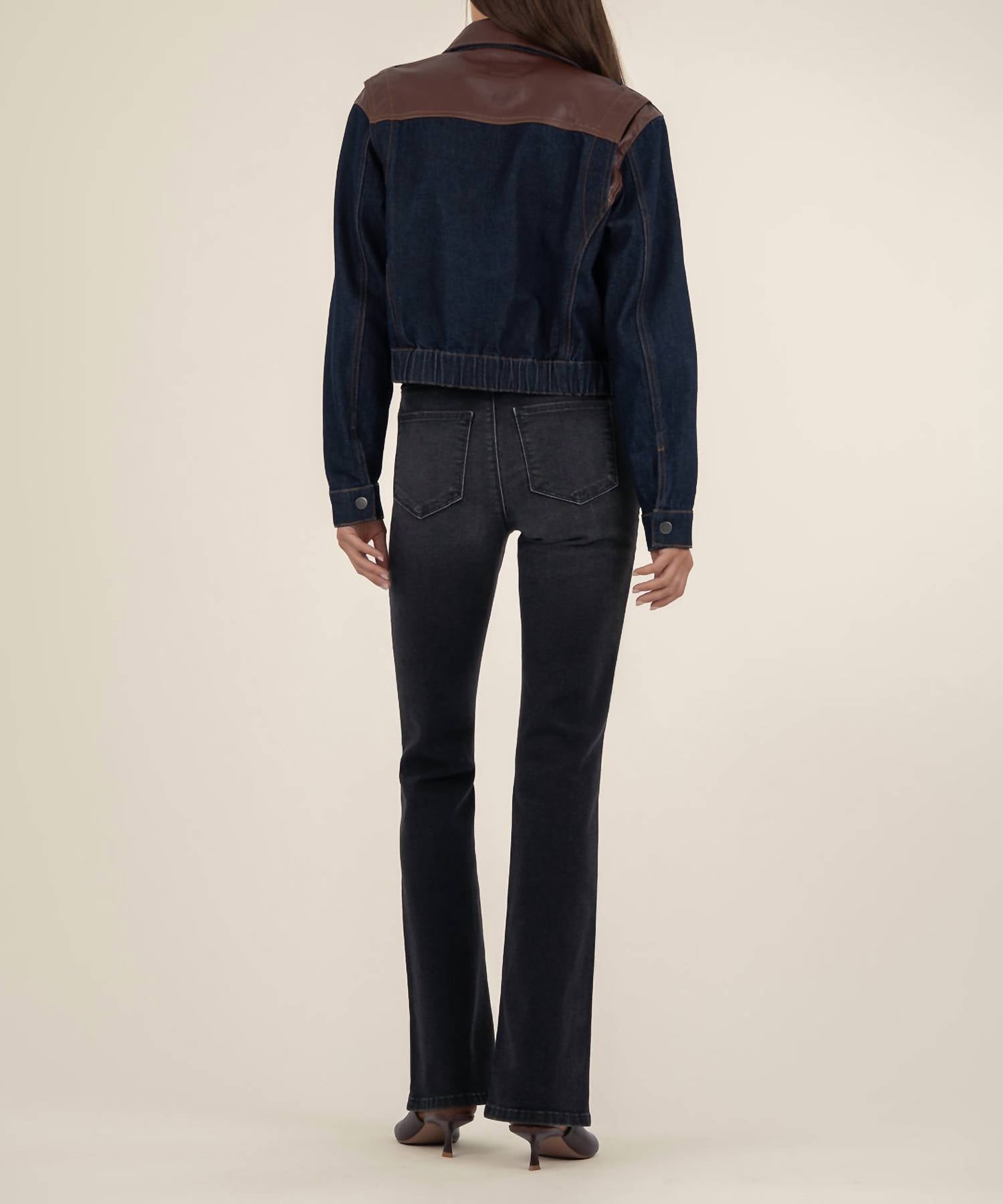 Throw this adorable jacket over just about anything for an effortlessly stylish look. Introducing the Ella Barn Jacket by KUT FROM THE KLOTH, a stylish addition to your wardrobe in dark denim. This long sleeve piece features rich leather contrast detailing, a contrast collar, and pocket trim for added dimension, with a snap closure for convenience. Crafted from 100% cotton, its cropped structure elegantly defines the waist, ideal for pairing with high-rise bottoms. Easy care with machine wash and tumble dry, this imported jacket is both polished for work and comfortable for all-day wear.