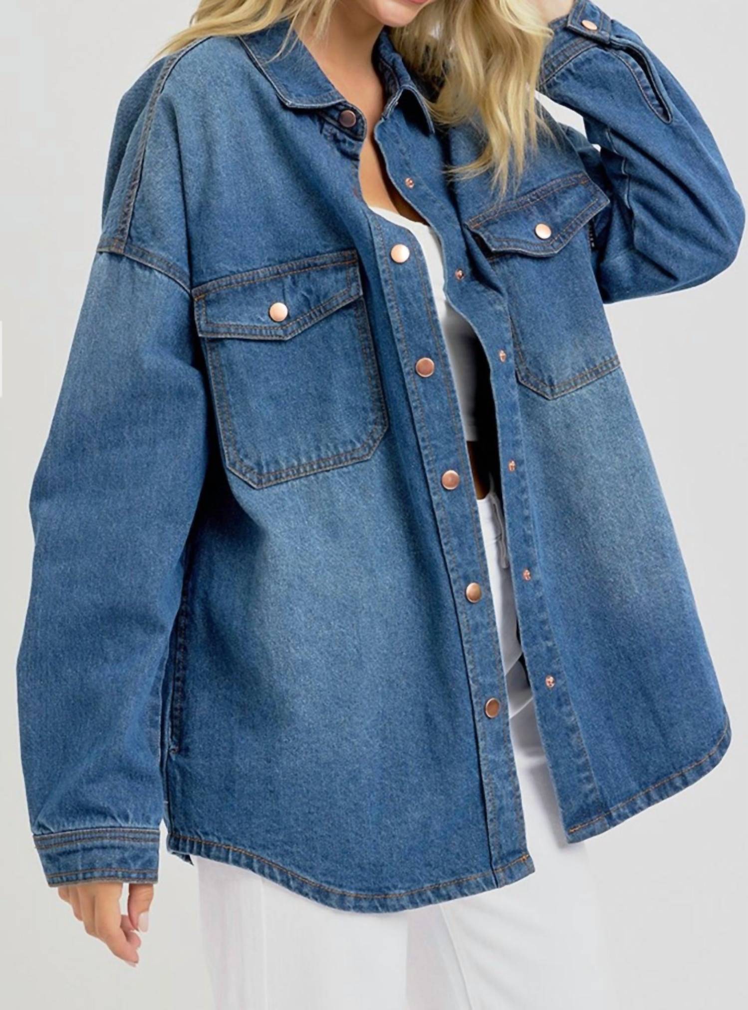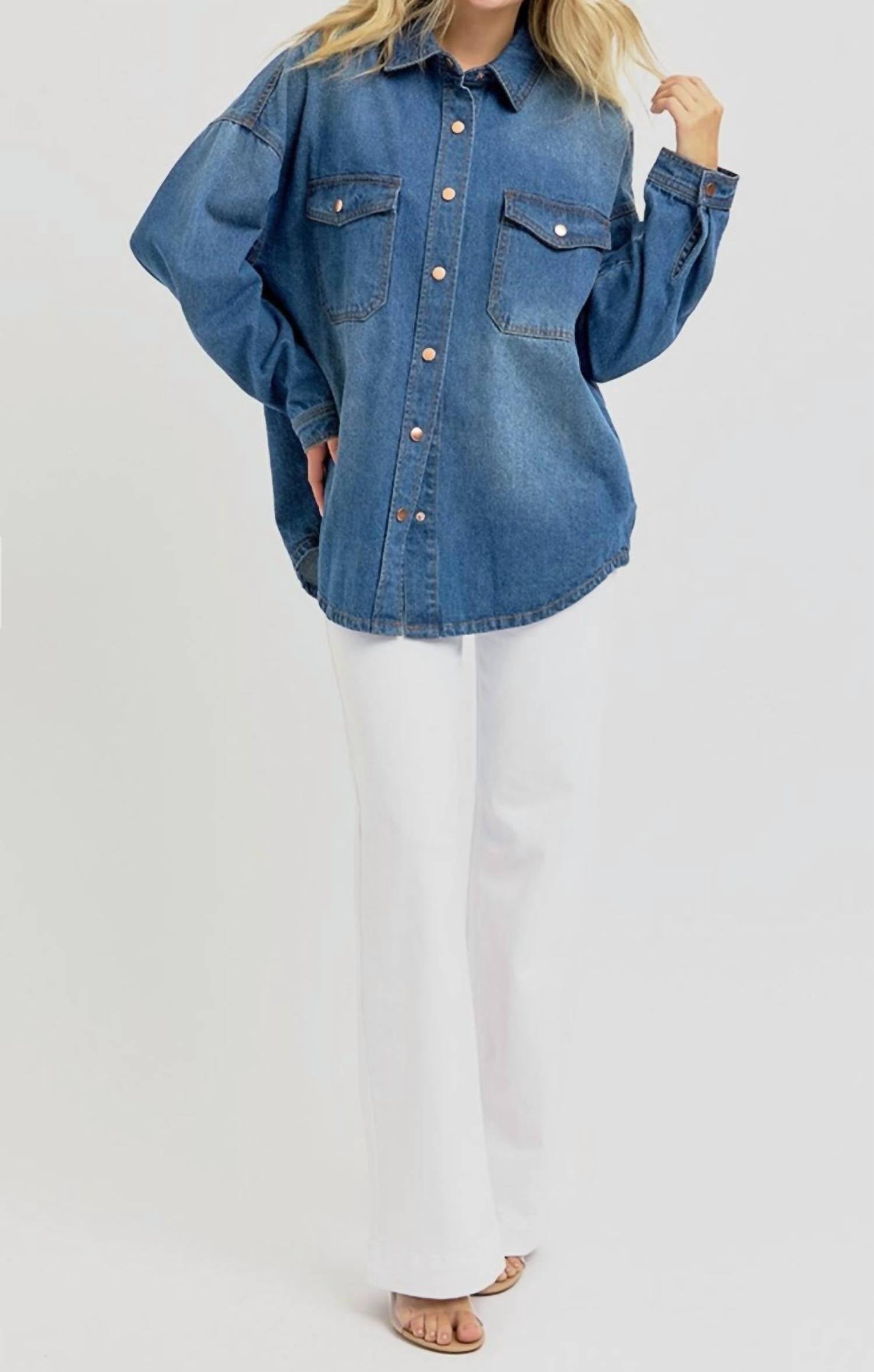 Classic, cool and works with almost any outfit choice. Elevate your streetwear collection with the Oversized Shirt Jacket by RISEN, perfect for a dinner party or casual spring outing. This stylish piece in a dark wash is crafted from 100% cotton and features long sleeves and a collar neckline. Designed for a comfortable fit, it also includes functional pockets and a button closure for easy wear. Available in regular and plus sizes: size S measures 29 3/4" in length with a 47" chest, while size 1XL measures 31 3/4" in length with a 55" chest. Model is 5'8" with a waist of 24" and hips of 34", wearing a size S.