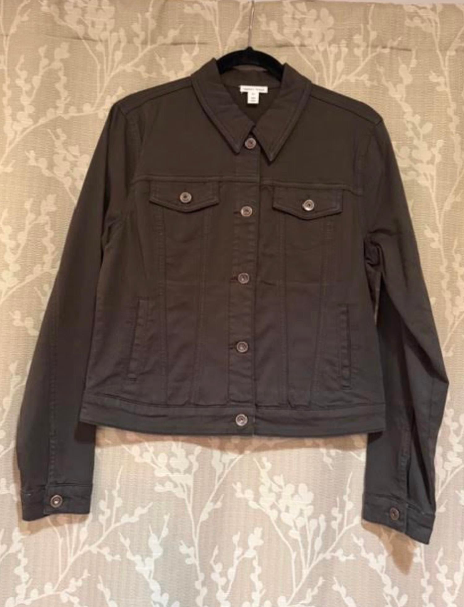 The perfect jean jacket for those slightly crisper days between seasons. Embrace timeless style with the Women's Stretch Color Denim Jacket by TRIBAL, crafted in a rich Black Olive shade. Featuring long sleeves, this cotton blend jacket measures 22 inches in length and boasts a smart button-front closure. Made with a composition of 73% Cotton, 23% Polyester, 3% Viscose, and 1% Spandex, it offers a comfortable stretch without compromising on style. Complete with side pockets and decorative chest flap pockets, this piece is a versatile addition to any wardrobe.