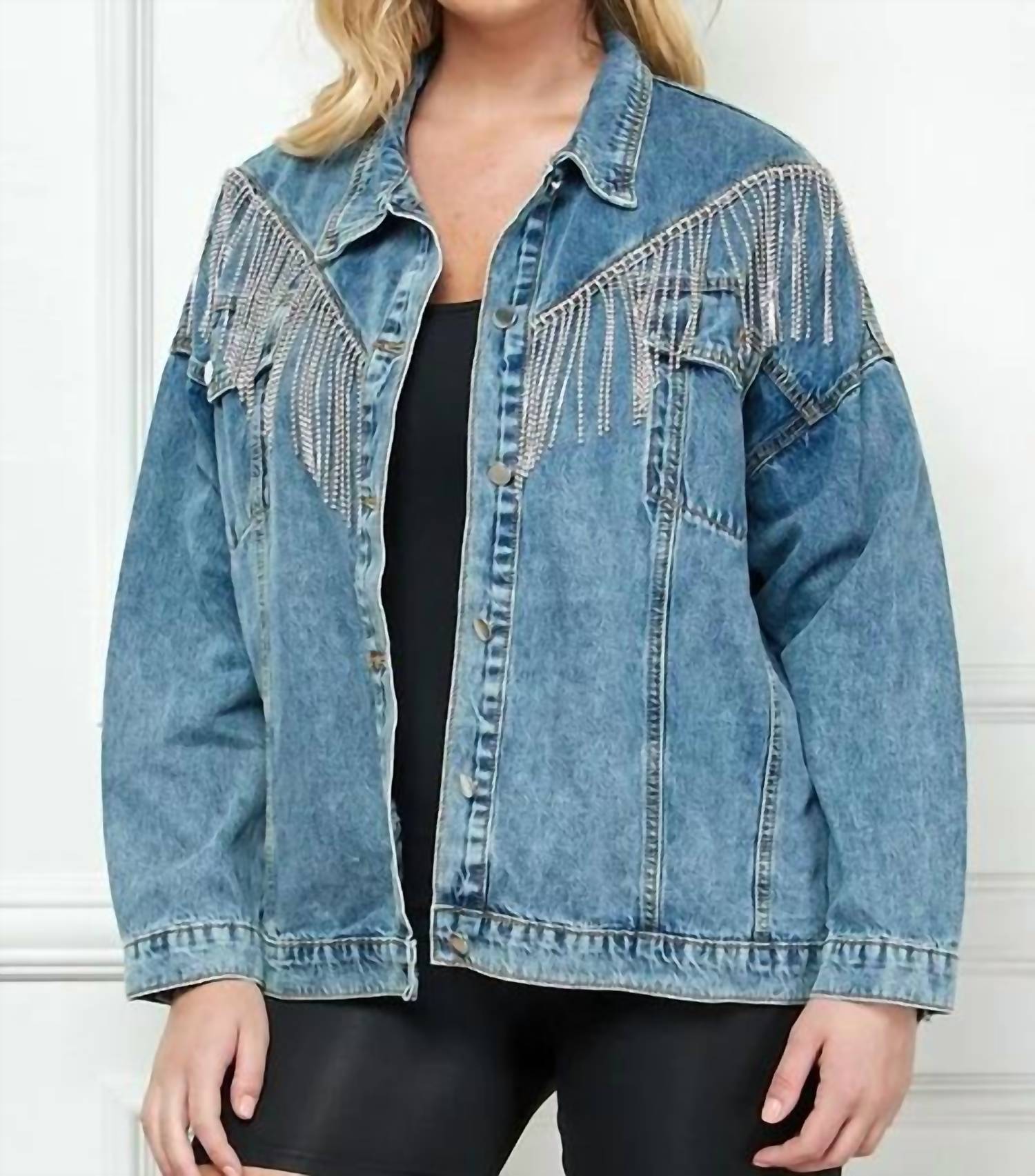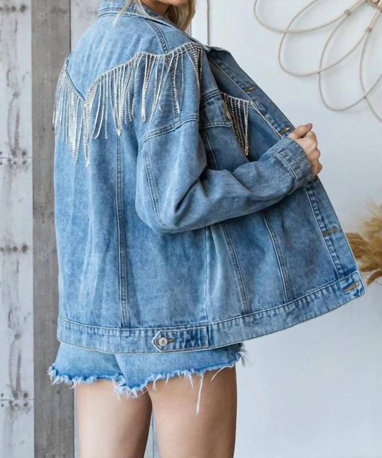 Classic, cool and works with almost any outfit choice. Add a touch of sparkle to your wardrobe with the Veveret Rhinestone Fringe Denim Jacket in blue, perfect for music festivals and spring adventures. This women's jean jacket boasts long sleeves with button cuffs and a button-down front, featuring a fun rhinestone fringe for that vintage charm. Made from 90% Cotton and 10% Polyester, it offers a solid pattern and comes in a loose fit with a garment length of 23 inches. Closure: Button closure.