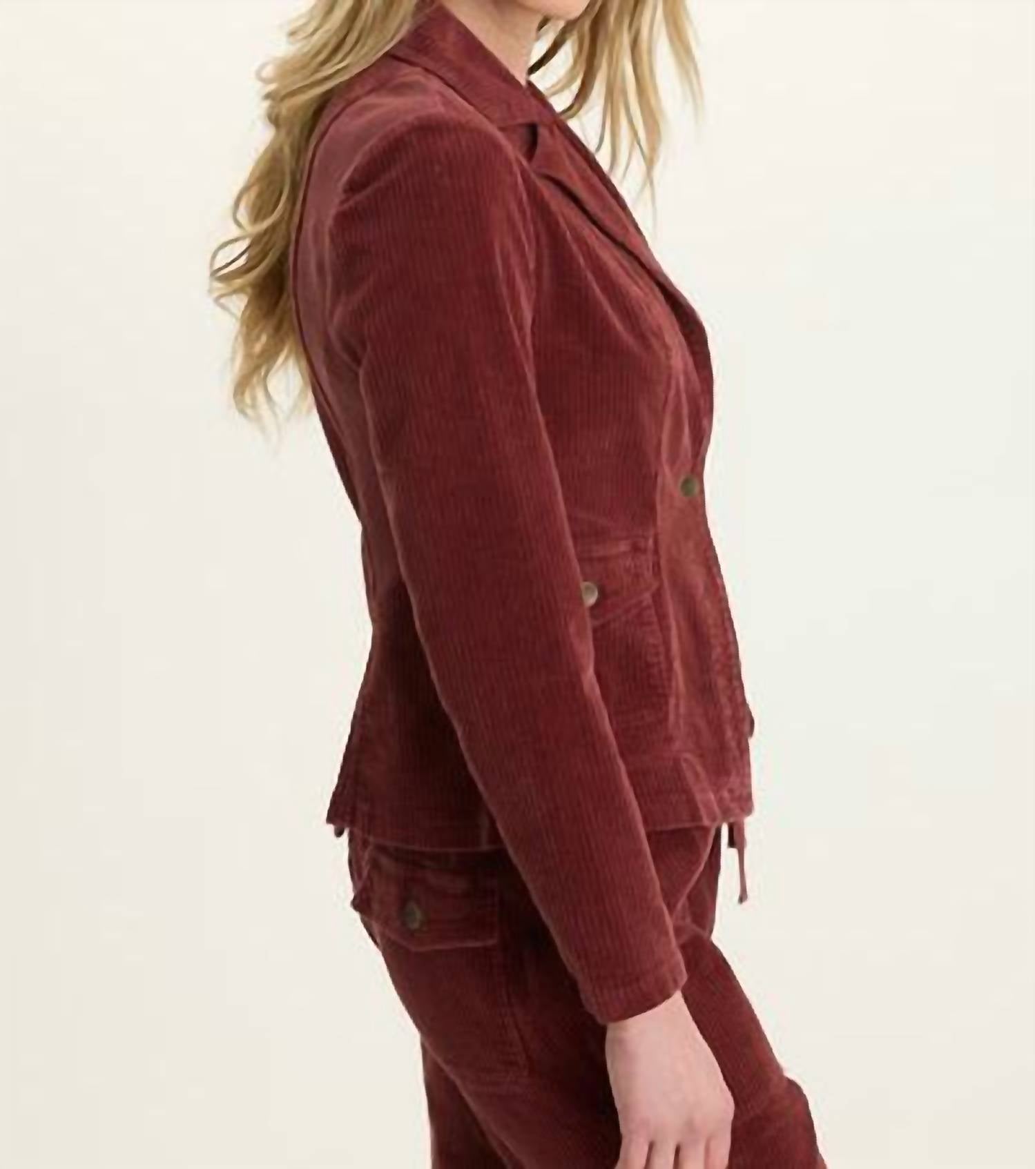 Throw this adorable jacket over just about anything for an effortlessly stylish look. Enhance your fall wardrobe with the Aila Corduroy Casual Blazer by XCVI, crafted for a chic vacation look. This long sleeve jacket is made from Camden Cord with a composition of 98% Cotton and 2% Spandex, featuring a split collar and envelope pockets. The single button closure offers a subtly contoured silhouette, perfect for Thanksgiving gatherings. The dimensions of the blazer include a center front length of approximately 21 inches and center back length of approximately 22 inches in a striking solid Salem's Door red. Care: Machine wash, tumble dry.