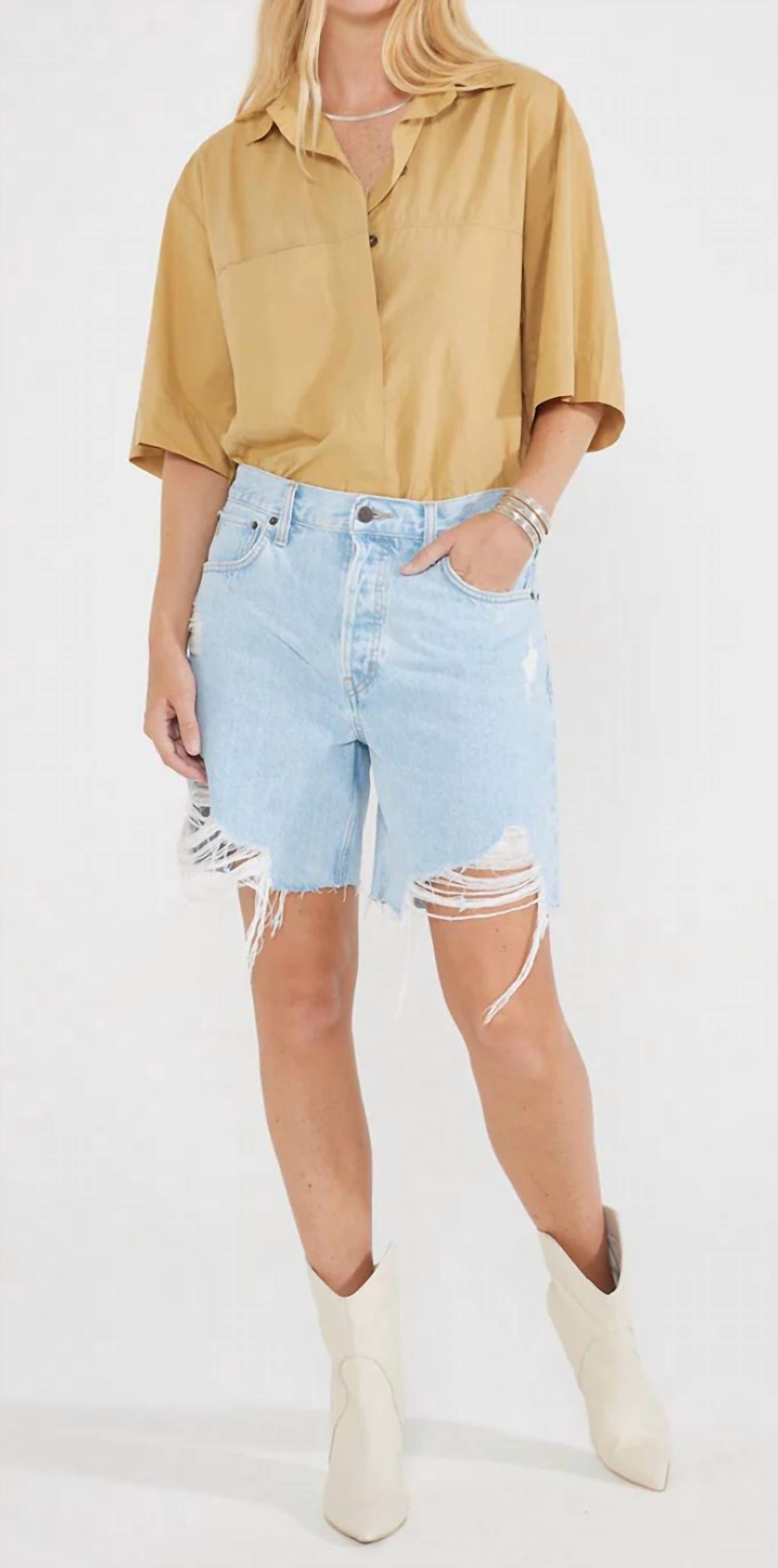 You can never have too many jean shorts and these will be your new favorites. The Narin Long Short by ETICA in Blue Mist is a stylish essential for your summer wardrobe. These jean shorts feature a relaxed leg that finishes at mid-thigh, offering a comfortable fit. Made from 100% organic cotton, they are as sustainable as they are chic, with a playful destructed look. The shorts have an 11.5" rise and a 7" inseam, secured by a button closure, and are best cared for with a machine wash in cold water followed by line drying.
