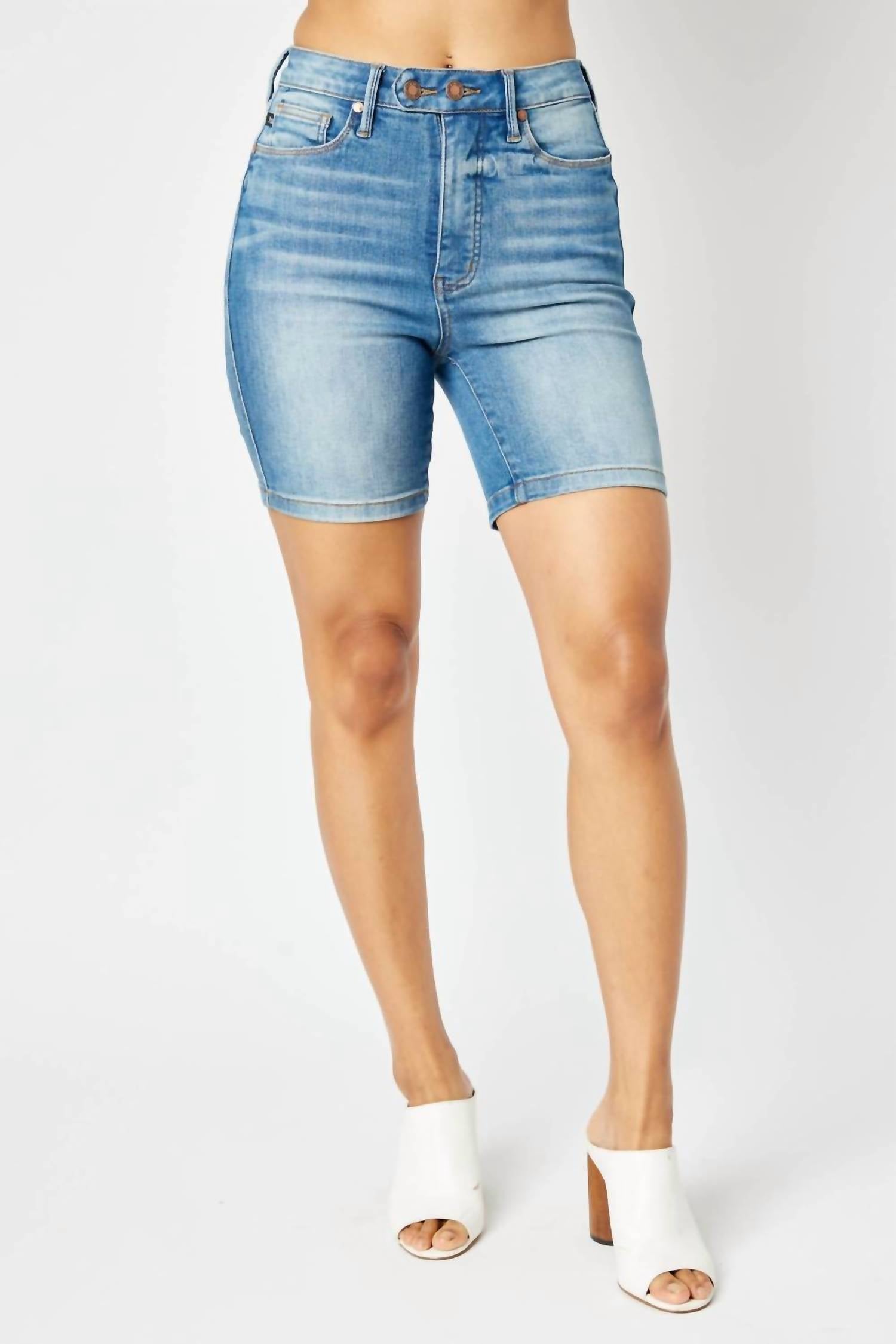 Not only cute but extremely comfortable. The jean shorts you will be reaching for all season long. Enhance your summer wardrobe with the Women's High Waist Tummy Control Double Button Bermuda Shorts by Judy Blue. Crafted from a cotton blend, these tie-dye jean shorts in blue offer a flattering fit with tummy control technology and a stylish double button closure. The Bermuda length shorts come with pockets, a 7" inseam for regular sizes, and a front rise of 11". Ideal for women seeking comfort with a touch of style, these shorts promise a sleek silhouette perfect for any casual outing.