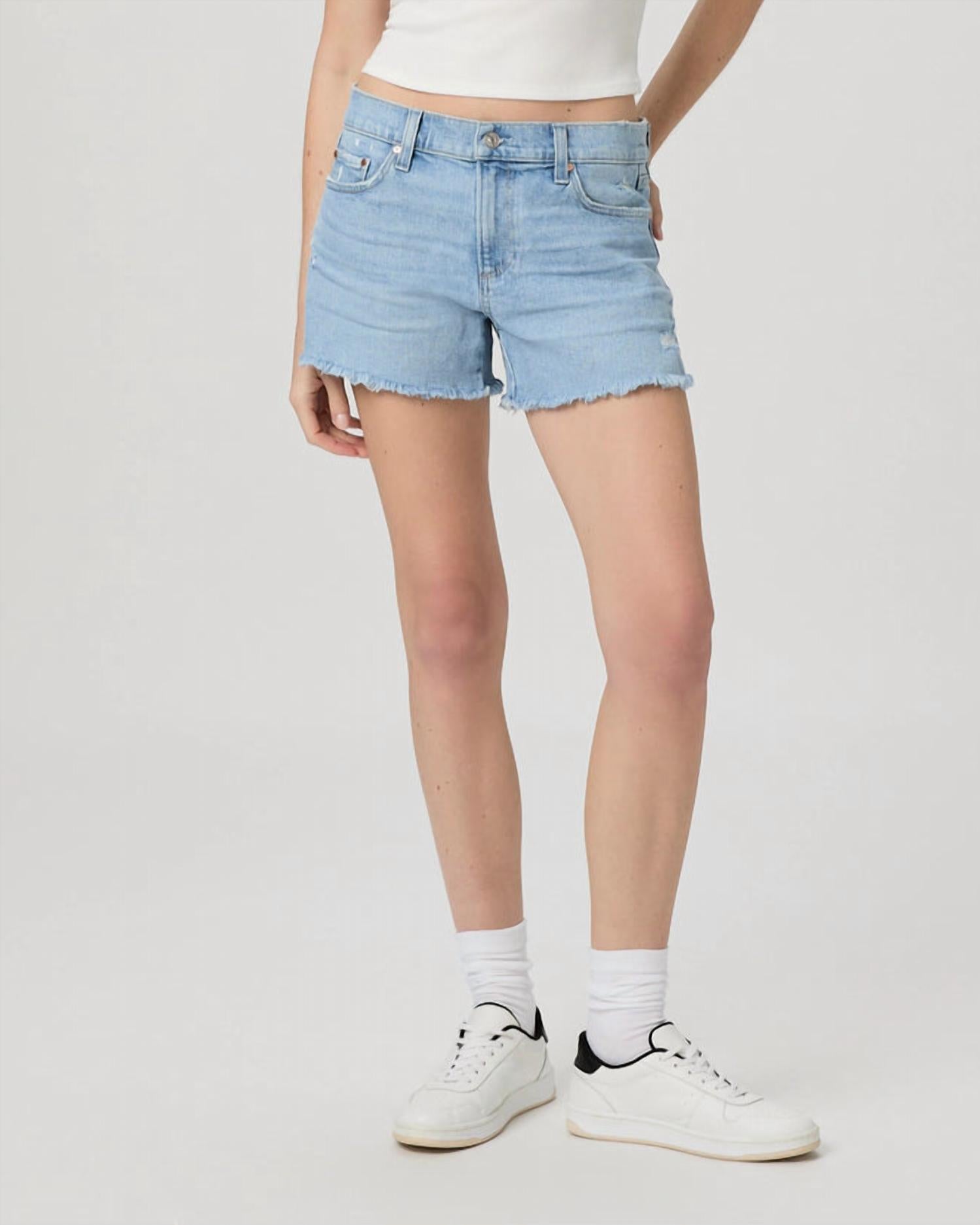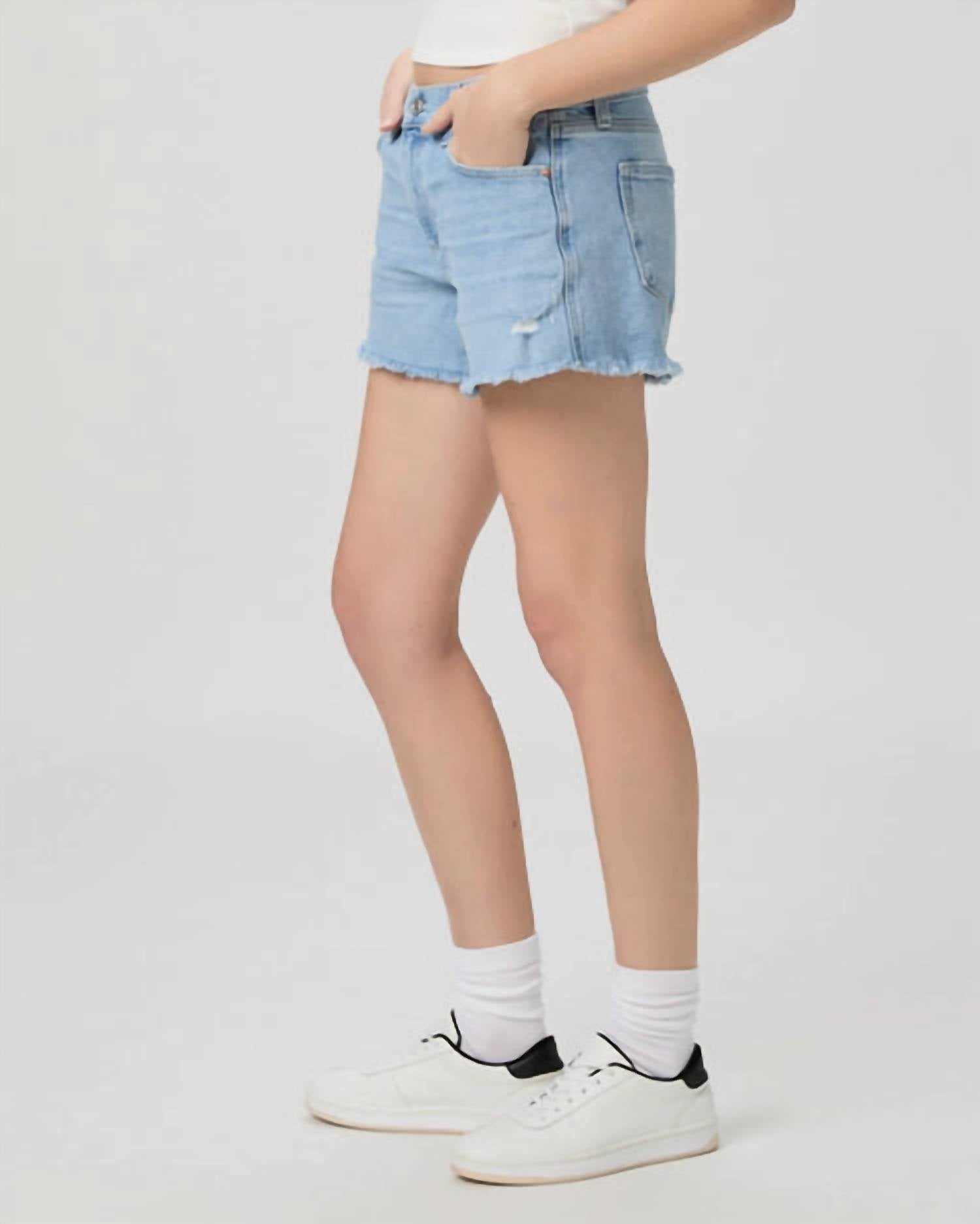 You can never have too many jean shorts and these will be your new favorites. Upgrade your summer wardrobe with the Paige Dylan Short in My Girl Distressed, a must-have for a relaxed, lived-in look. Crafted from a comfortable 99% Cotton, 1% Polyurethane blend, these jean shorts feature a raw hem and inseam length of 4 inches, offering both style and comfort. Closure is secure with a button, and practical pockets are included for added convenience. Easy to care for with machine wash cold inside out and tumble dry low instructions, these shorts are perfect for travel and casual occasions.