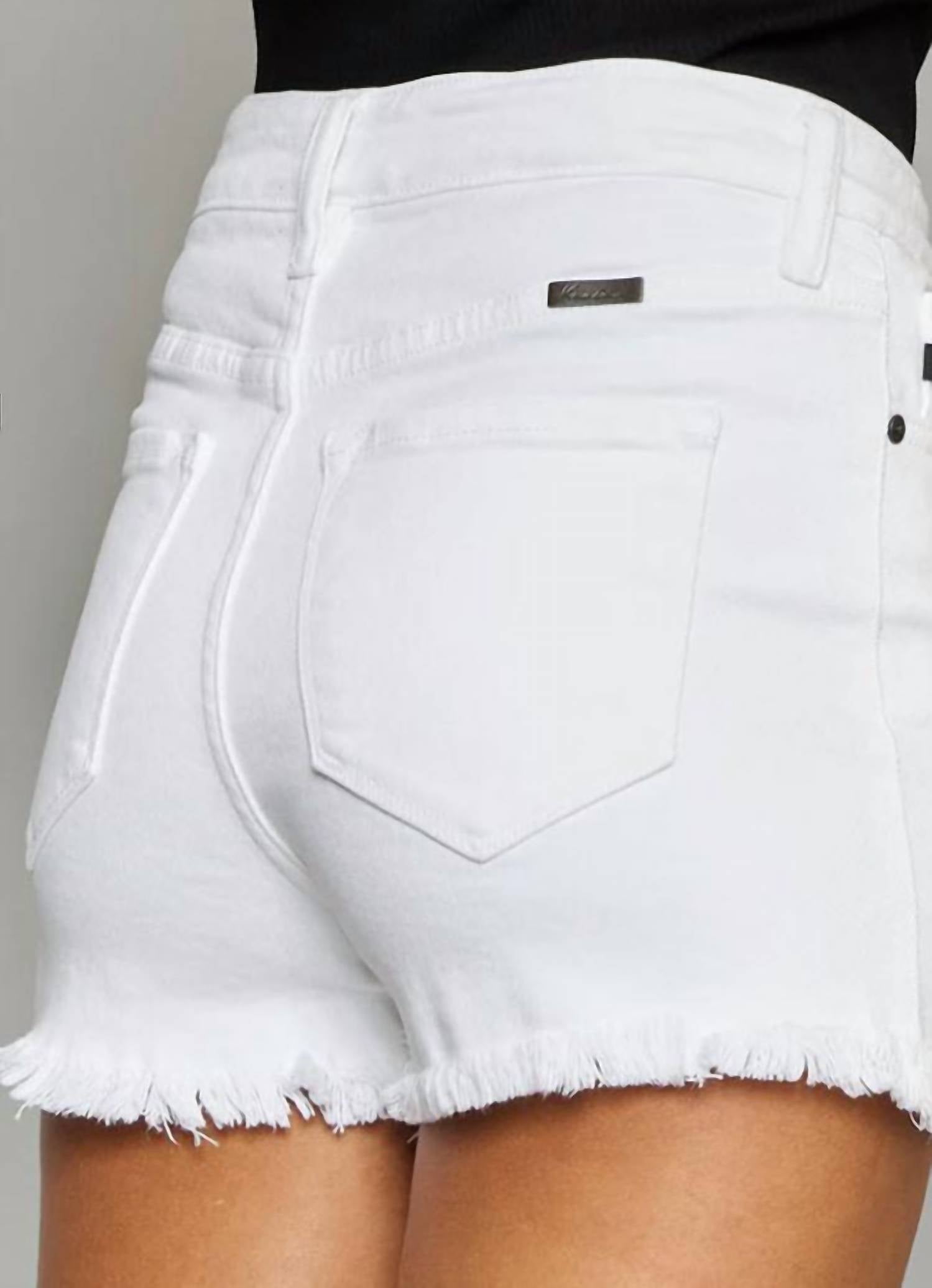 You can never have too many jean shorts and these will be your new favorites. Introducing the High Rise Distressed Shorts by KanCan, designed to elevate your everyday look with their edgy, distressed finish. These white denim shorts feature a high-rise fit that beautifully enhances your natural waistline, crafted from a comfortable blend of 94.8% cotton, 4% T-400, and 1.2% spandex. With a 2.5" inseam, they strike the perfect balance between coverage and leg-baring appeal. Closure is via a zip, and the garment is simple to care for with machine wash and tumble dry instructions.