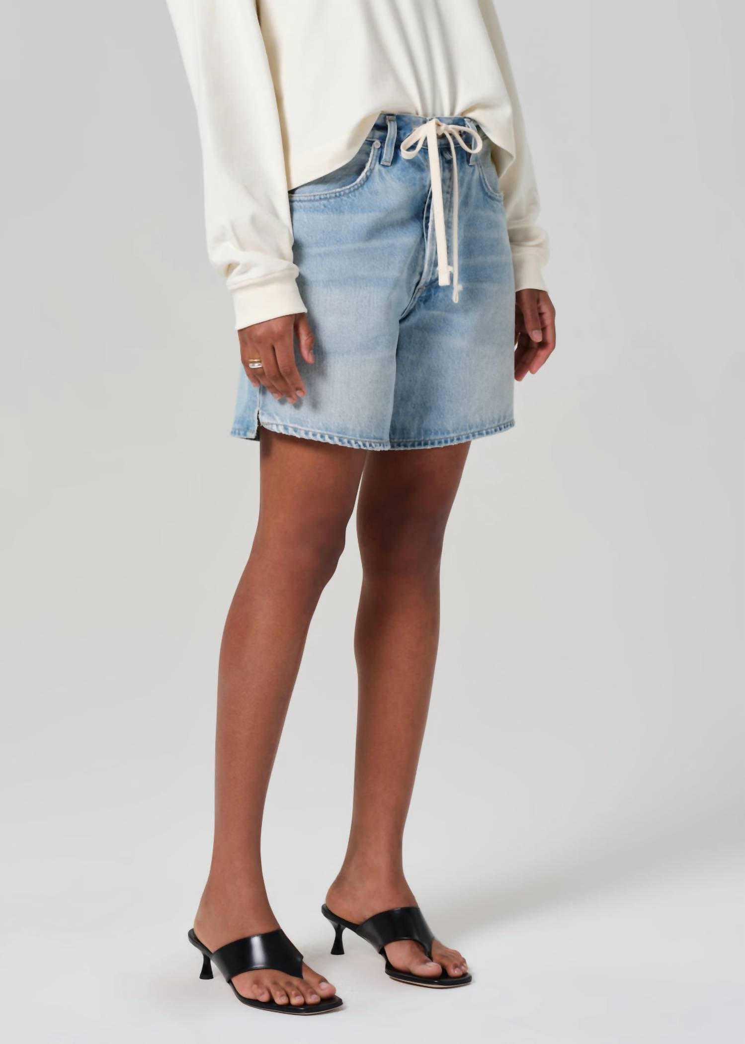 Not only cute but extremely comfortable. The jean shorts you will be reaching for all season long. The Citizens of Humanity Brynn Drawstring Short offers a relaxed fit ideal for warm weather and vacation-ready style. Crafted from 100% regenerative cotton in a light vintage indigo shade, these shorts feature a button fly closure and a breathable, ultra-soft feel. With a 12" rise, a 6.5" inseam, and a 25" leg opening, they provide an effortlessly chic look paired with coordinating tops. Care is simplified with machine wash cold instructions and low tumble drying. Model is 5'10" and wearing a size 27.