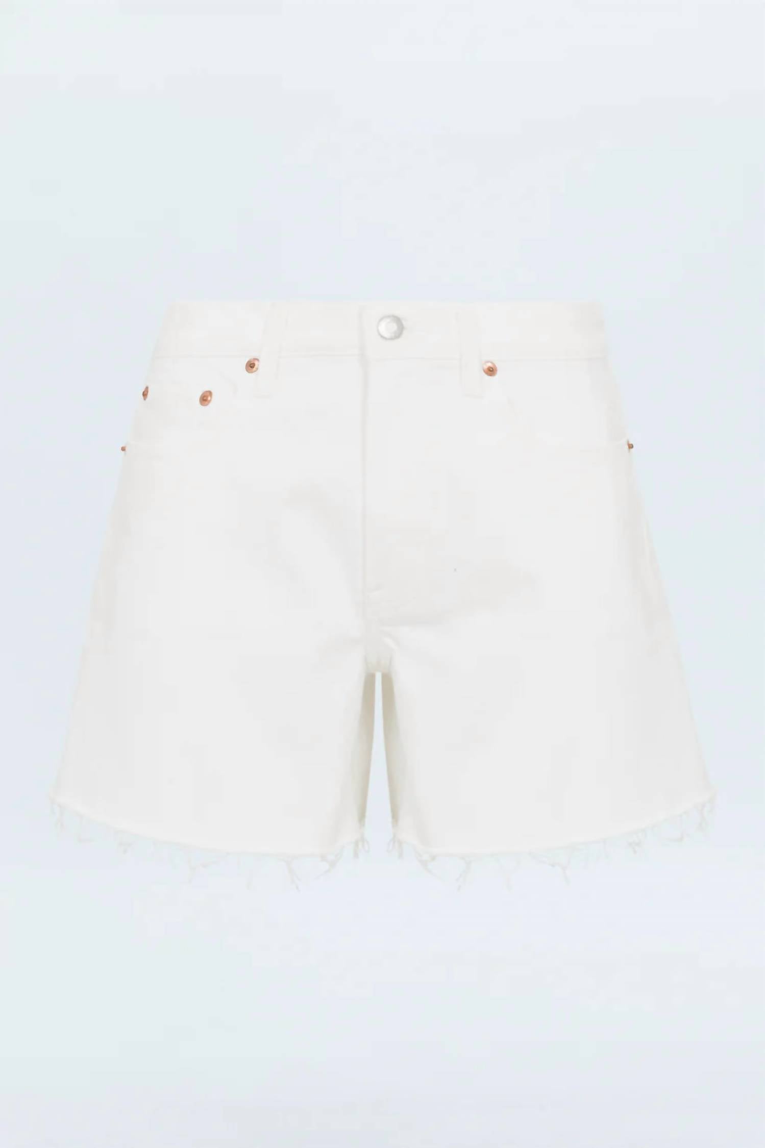 Jean shorts so versatile, you can literally wear them with anything. Introducing the Kennedy Relaxed Mid Rise Cut Off Short by PISTOLA, designed in a pure antique white denim for versatile styling. These shorts feature a medium length with a relaxed fit, perfect for a streetwear-inspired look. Crafted from a comfortable cotton blend that's 99% Cotton and 1% Spandex, the shorts include a zip closure and moderate distressing with a raw scissor cut hem for a chic finish. Inseam measures 4.5", with a rise of 10.5", ensuring a flattering fit. Care instructions: Machine wash and tumble dry. Model is 5’9” wearing size 26.