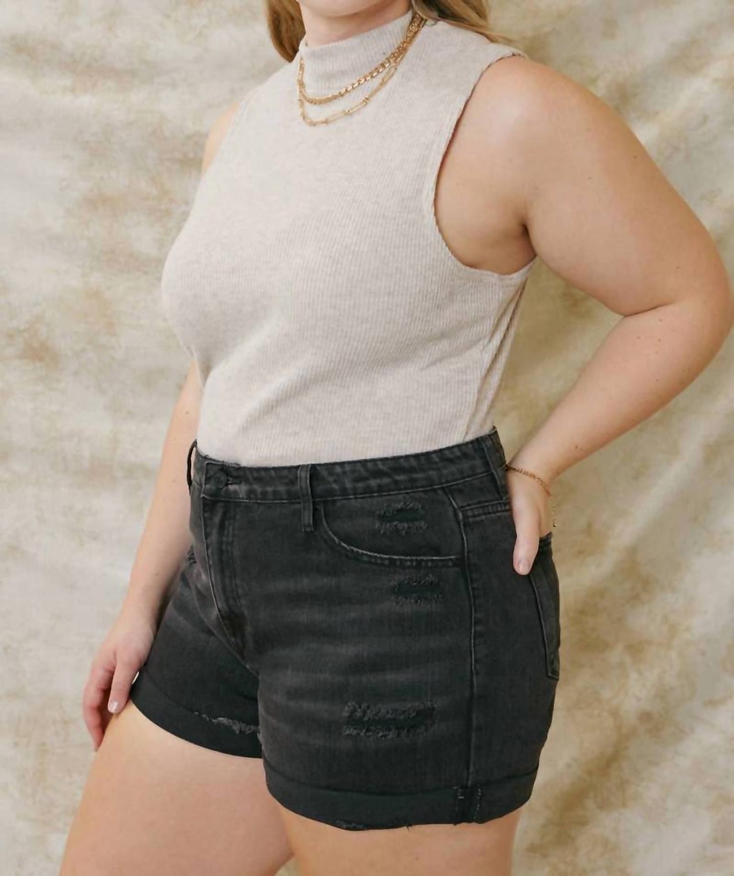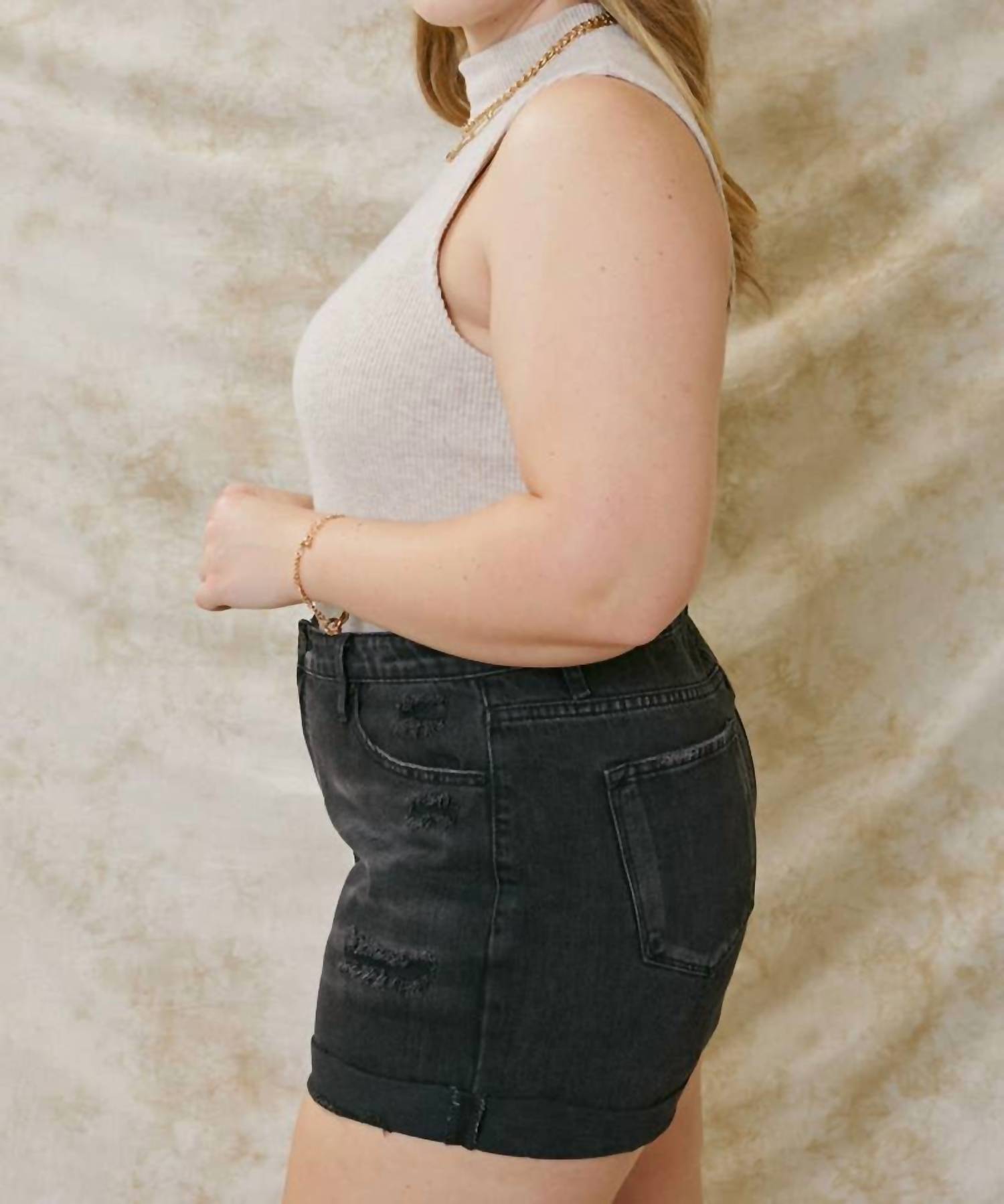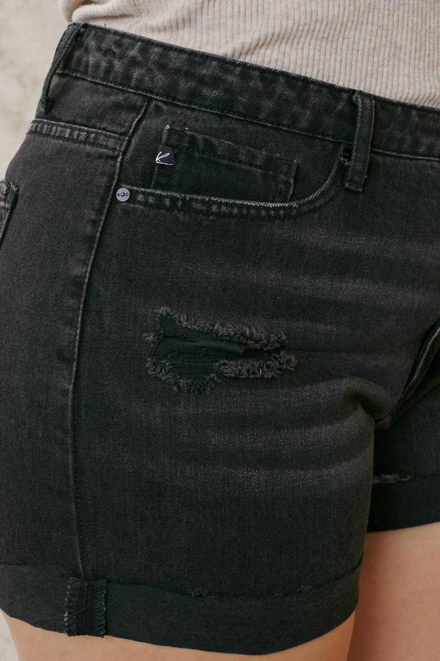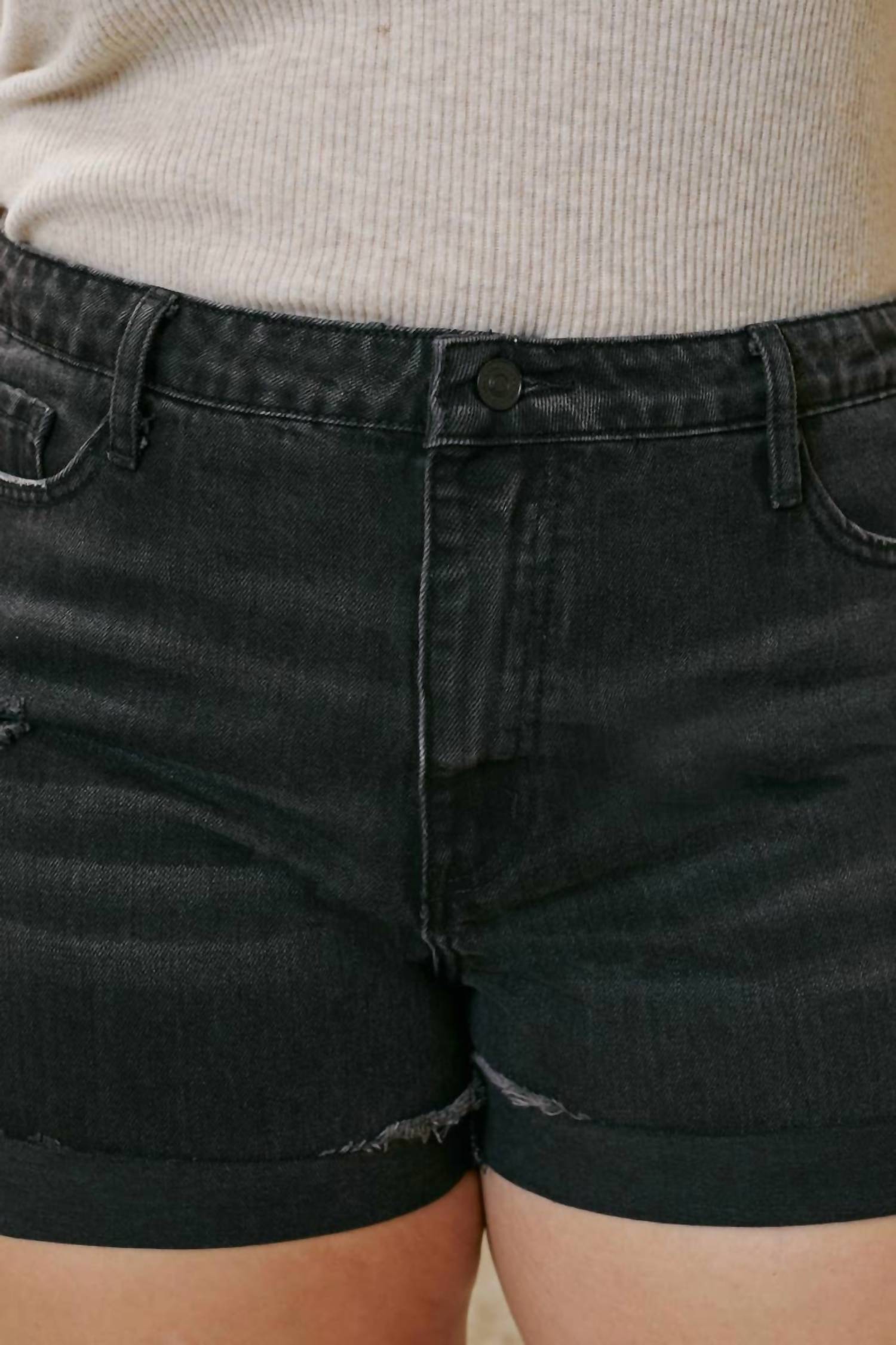 You can never have too many jean shorts and these will be your new favorites. Introducing the High Rise Denim Shorts by KanCan, designed for plus-size women who seek both comfort and style. These solid black jean shorts feature a 13" rise with a frayed hem and distressed detailing, crafted entirely from cotton for authentic denim feel. With a practical zip closure and convenient pockets, they're perfect for summer outings. Care is simple with machine wash and tumble dry instructions, making these shorts a go-to addition to your wardrobe. 100% Cotton.