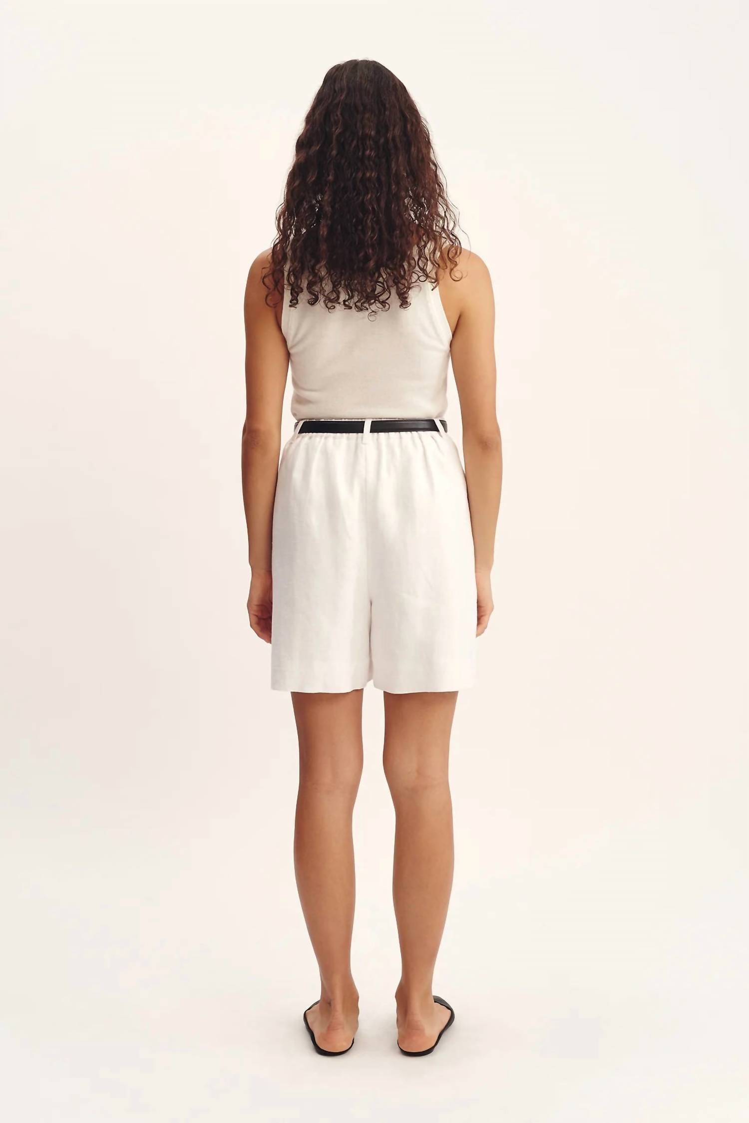Not only cute but extremely comfortable. The jean shorts you will be reaching for all season long. Introducing the Marchello Shorts by POSSE, perfect for a relaxed summer vacation look. Crafted from 100% Linen, these ivory, Bermuda-style shorts boast a high-waisted silhouette with an elasticated back waistband and a comfortable relaxed fit. Designed with thoughtful details like trouser-style pockets, front tucks, and turn-back cuffs, they feature a double hook and eye closure with a front fly entry for easy wear. Care: Machine wash. Marlene (173cm, 82cm bust, 62cm waist, 89cm hips) and Stephanie (176cm, 81cm bust, 65cm waist, 91cm hips) are both styled in size S, affirming its timeless, minimalist charm.