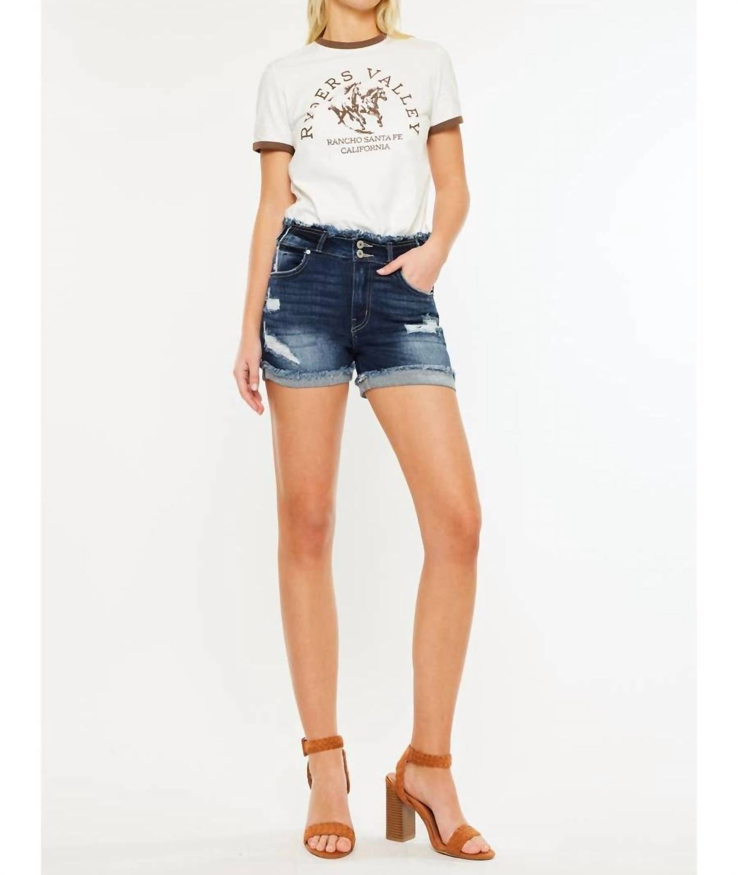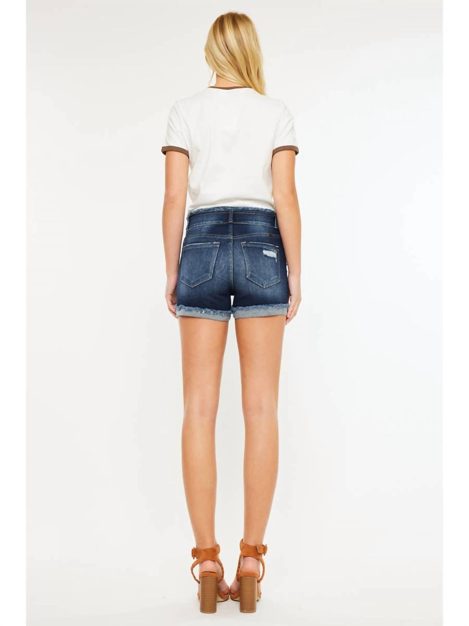 Not only cute but extremely comfortable. The jean shorts you will be reaching for all season long. Elevate your summer style with the KanCan Free Spirit Denim Short, the ideal choice for travel and festive occasions. Crafted in a durable cotton blend of 93% Cotton, 5% Polyester, and 2% Spandex, these textured dark wash shorts feature a high-rise waist with waistband detail and a button closure. The side open seam and single cuffed hem with a 0.5” space stitch frayed hem offer a stylish Western touch, measuring 10.75" in rise and 3" in inseam. For easy care, machine wash and tumble dry.