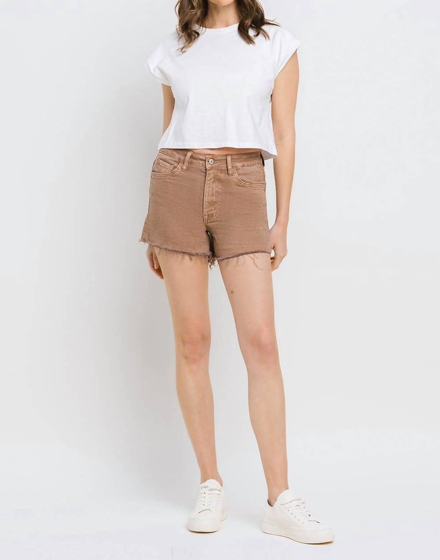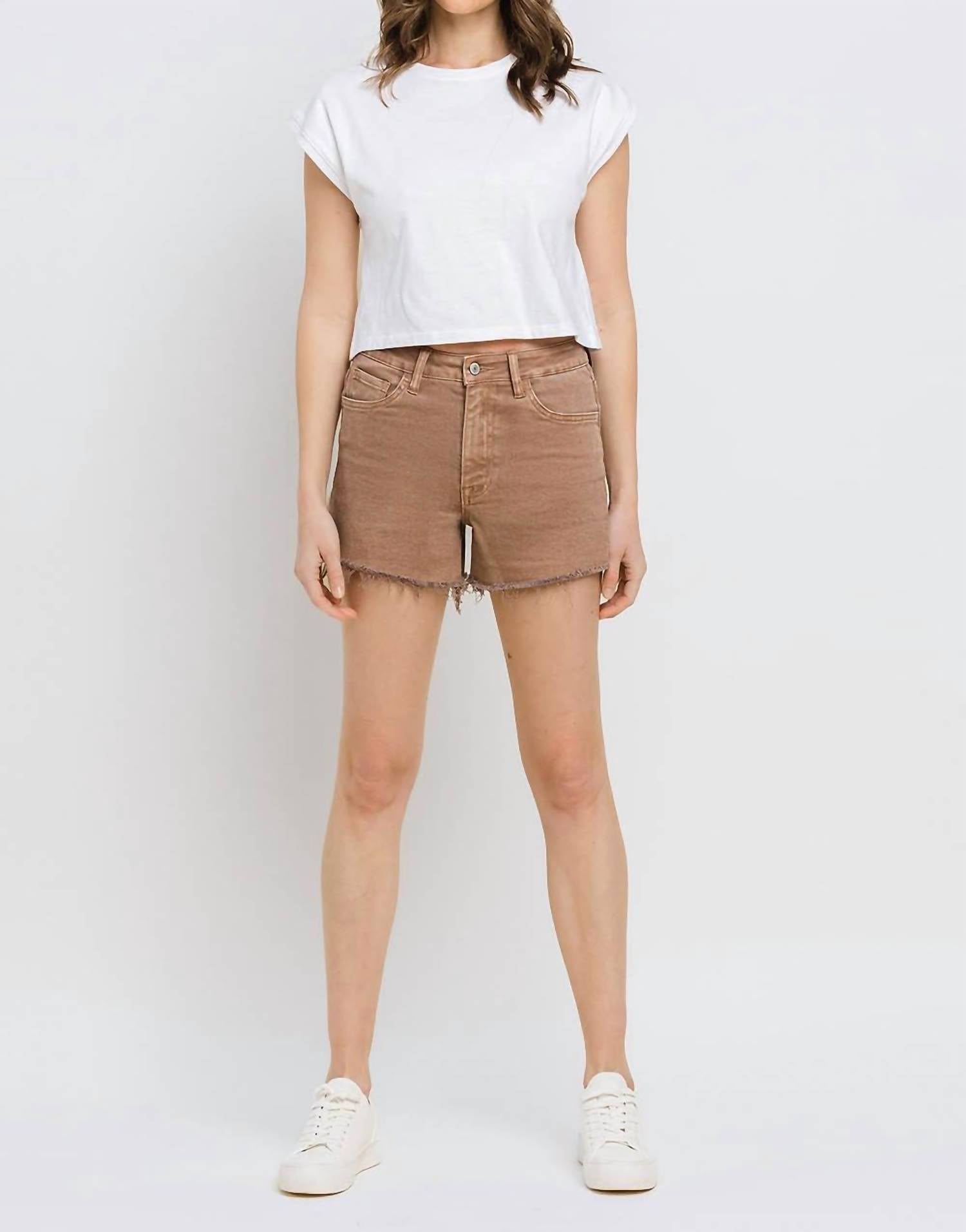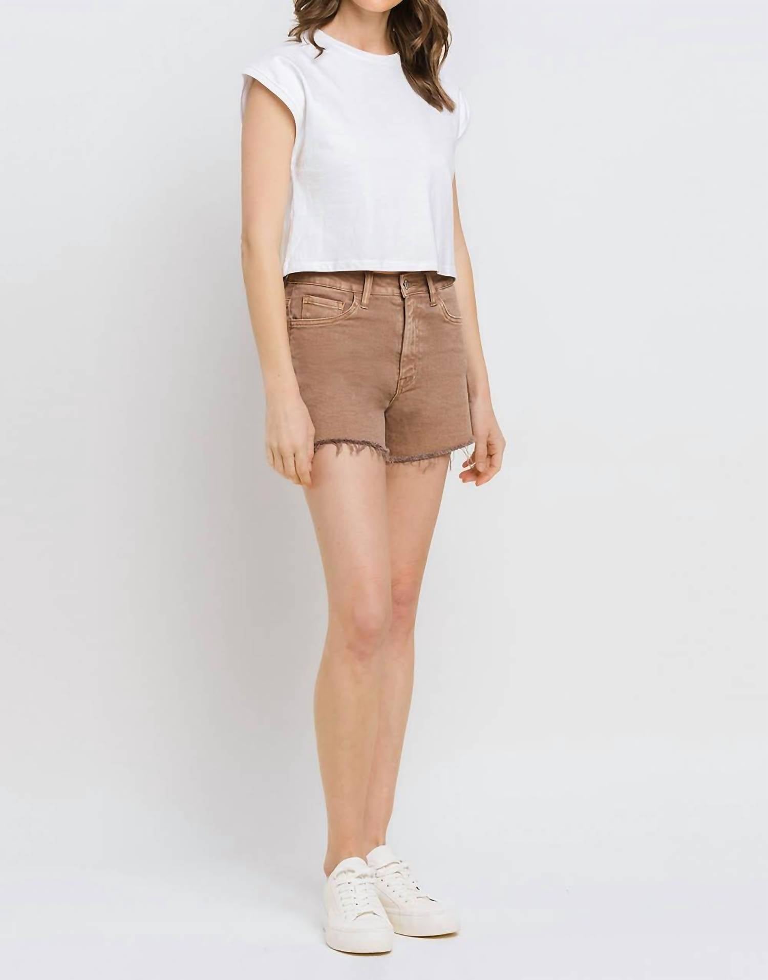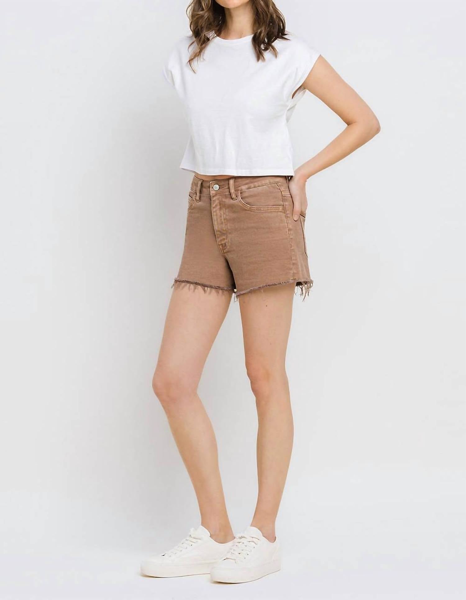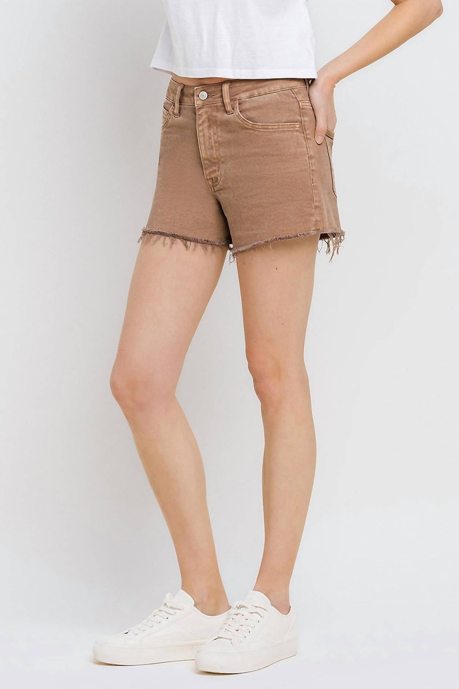 You can never have too many jean shorts and these will be your new favorites. Discover the Super High Rise Raw Hem Mom Shorts by Vervet by Flying Monkey, designed in a chic warm taupe to redefine casual elegance. These shorts boast a flattering fit with a super high-rise waist, raw hems, and a slight distressed detail, crafted from a comfort stretch denim blend of 94% cotton, 4% polyester, and 2% spandex. They feature a zip closure and include pockets, with dimensions of an 11" rise, 3 1/2" inseam, and 24 1/2" leg opening. Care for these versatile shorts is simple with machine wash and tumble dry instructions. Available in sizes XS-L, the model is 5'9" and wears a small.