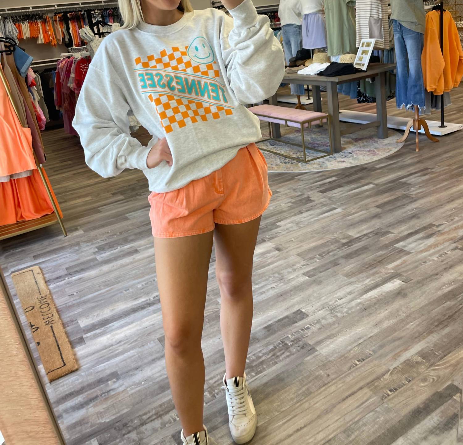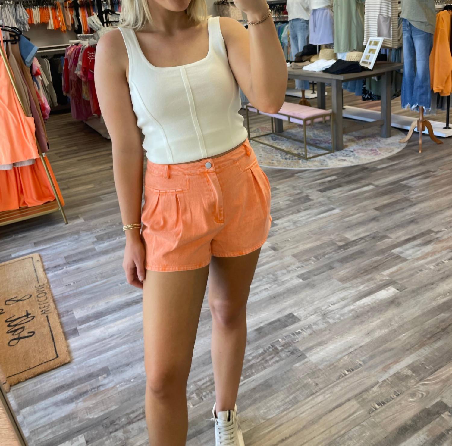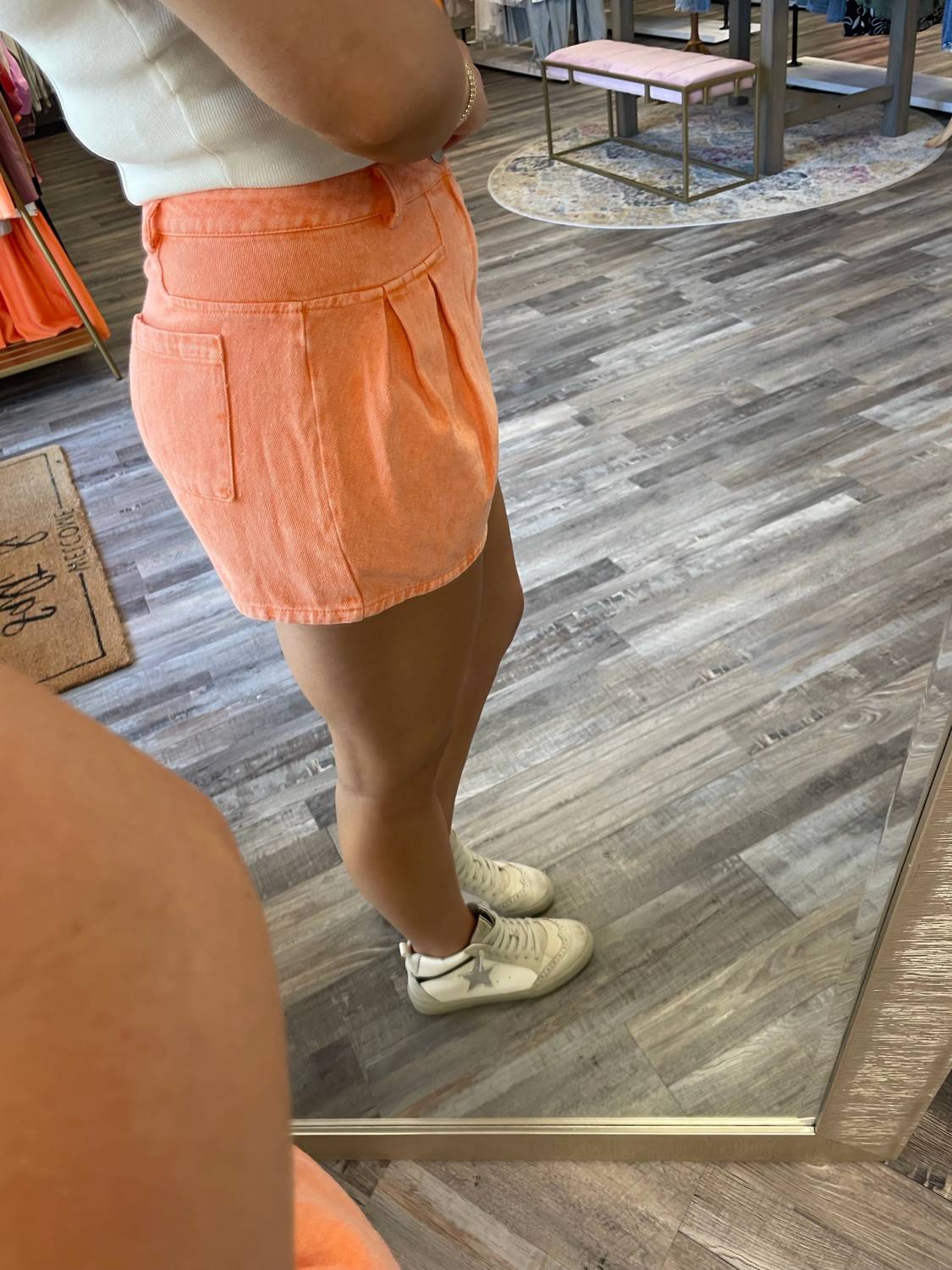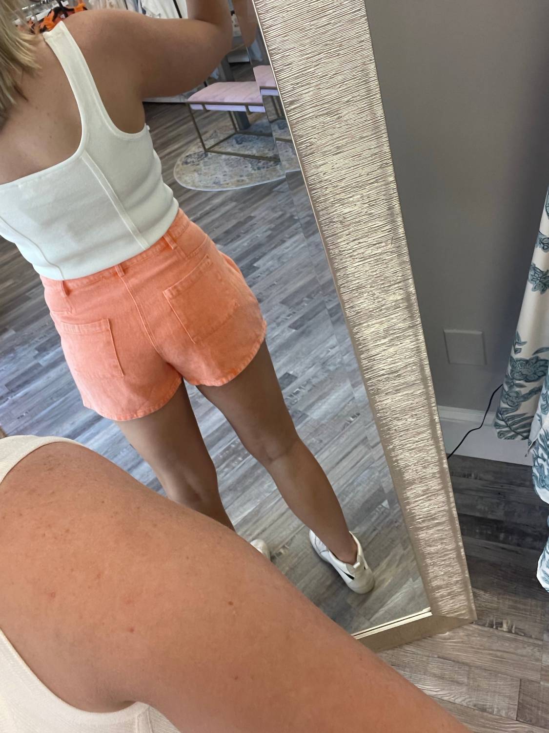 Not only cute but extremely comfortable. The jean shorts you will be reaching for all season long. Introducing the Double Pleat Flare Denim Shorts by Day + Moon in a vivid Washed Sunkist hue, perfect for adding a pop of color to your wardrobe. These shorts feature a flared design with belt loops and a convenient button closure. They are crafted for women in a solid pattern with pocket details, offering both style and functionality. Care instructions include machine wash and tumble dry. Model is wearing a medium and the shorts run true to size.