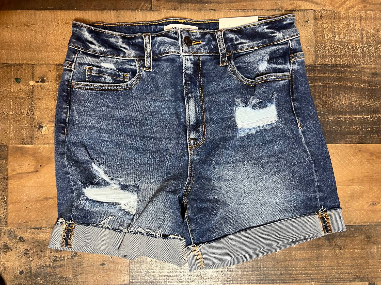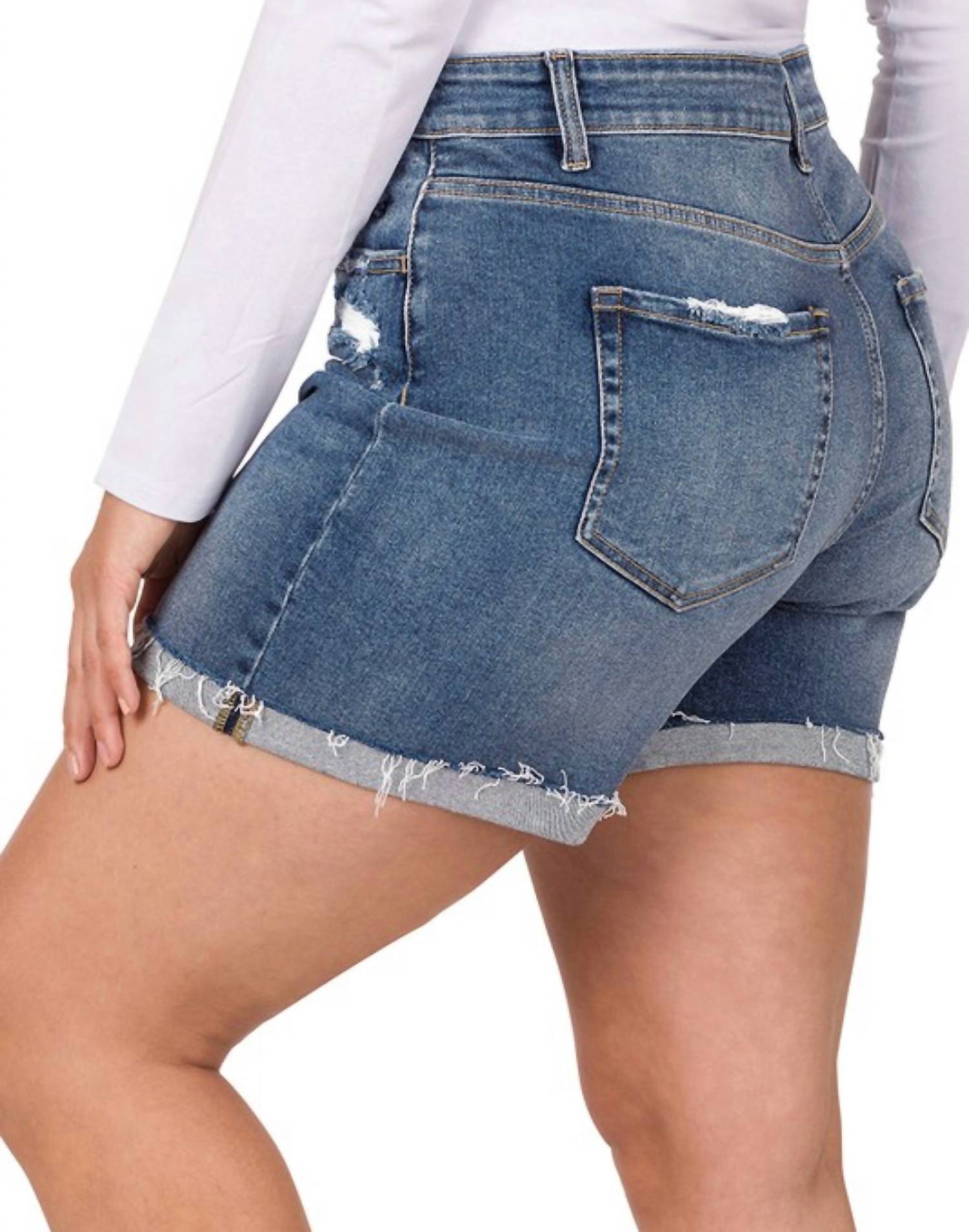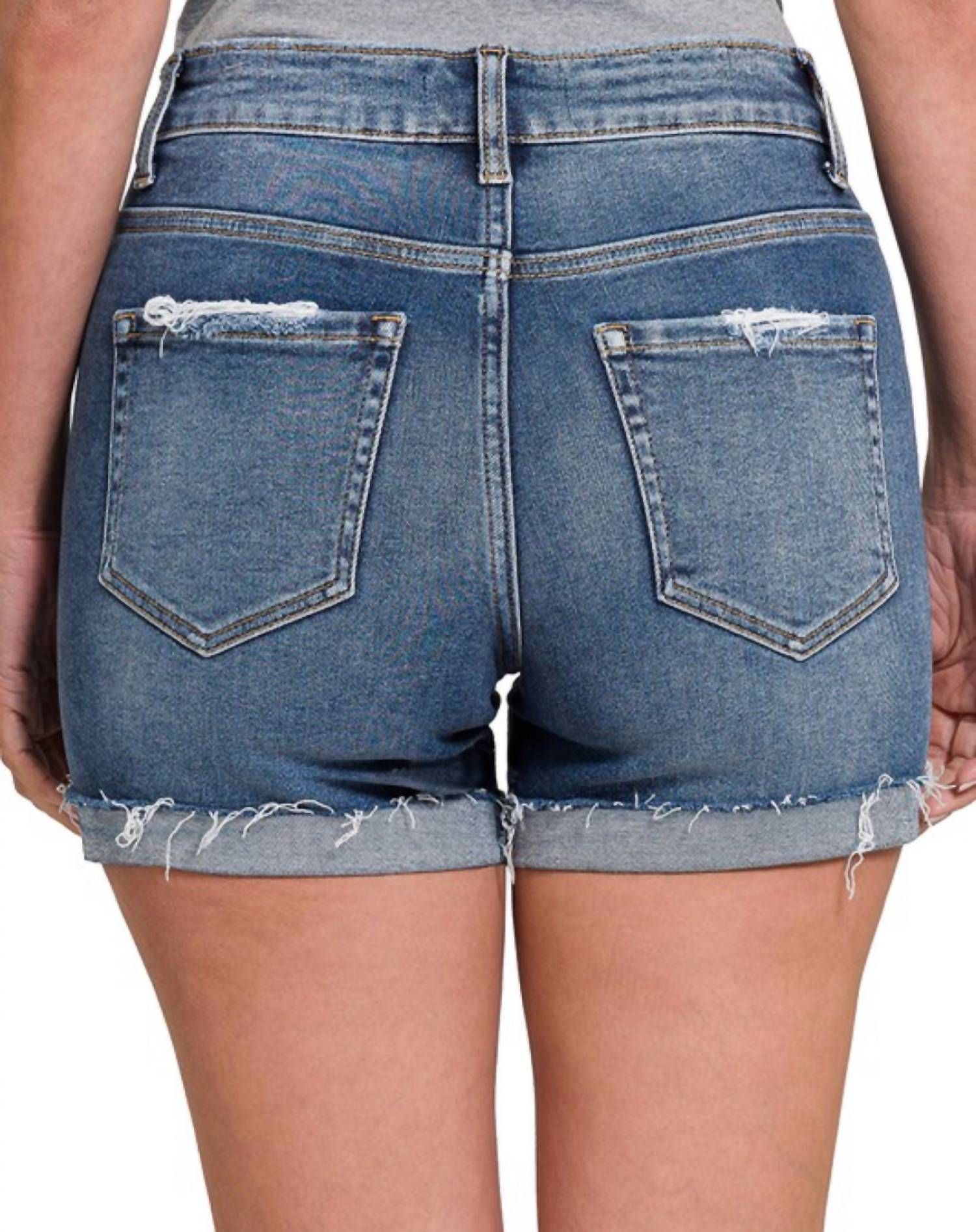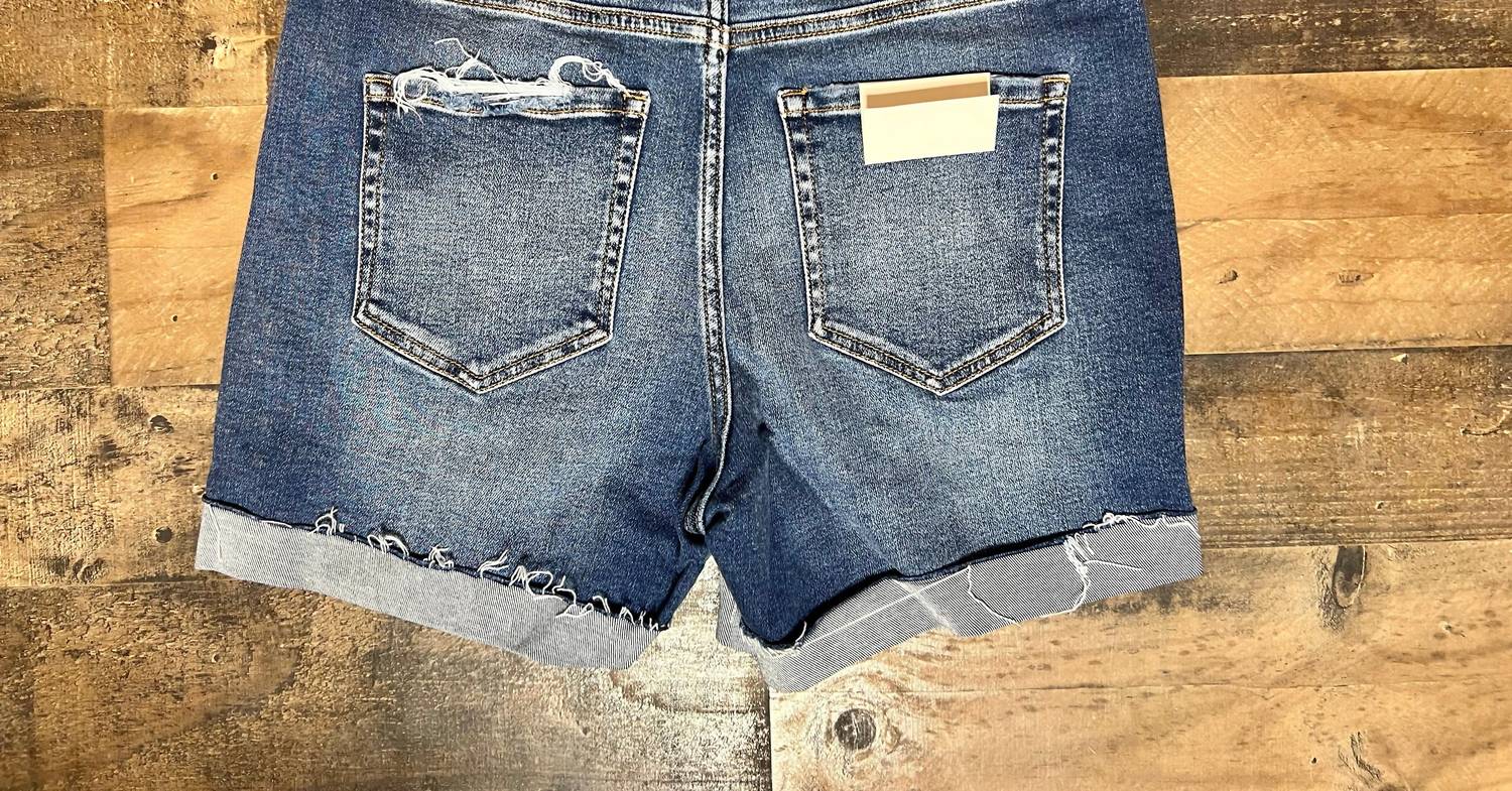 You can never have too many jean shorts and these will be your new favorites. Introducing the Carli Cuffed Shorts by ZENANA, a must-have for the modern woman's summer wardrobe. Crafted from a comfortable cotton blend comprising 93% cotton, 5% polyester, and 2% spandex, these stylishly distressed denim shorts offer a flattering fit. They feature a convenient button closure and practical pockets, with precise dimensions offering a front rise of 10.75", an inseam of 3.5", and a leg opening of approximately 25". Easy to care for, these shorts can be machine washed, making them ideal for vacation and streetwear occasions.