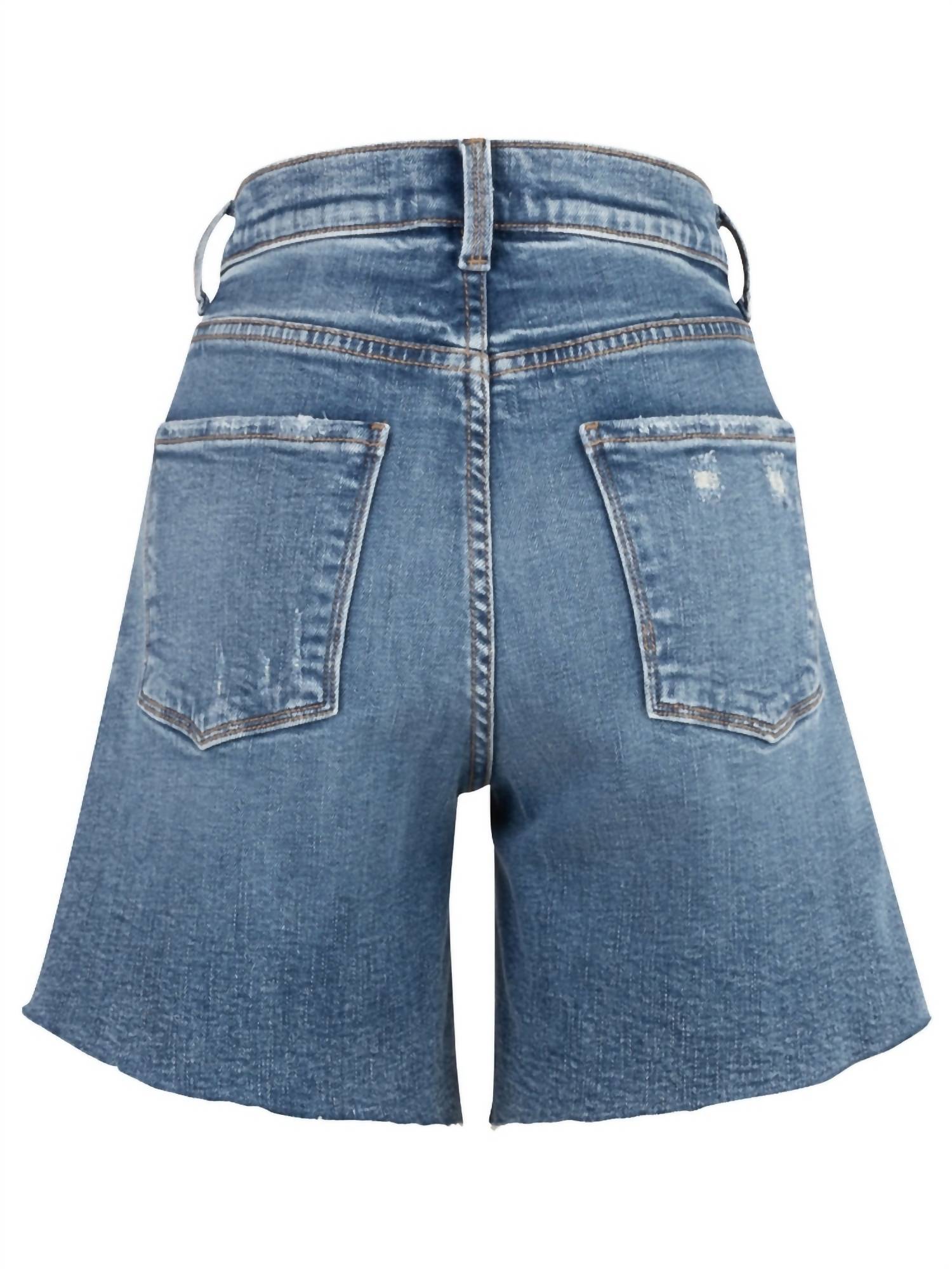 Effortlessly blending comfort and style. Feature a high rise with a relaxed cutoff fit. Providing a modern edge with a raw hem in a Medium Carnaby wash. Composition highlights include comfort stretch fabric with a hidden button fly closure. Dimension specifics: Rise 10 1/2", Inseam 7", and a 23 1/2" leg opening. Ensuring a flattering and comfortable fit.