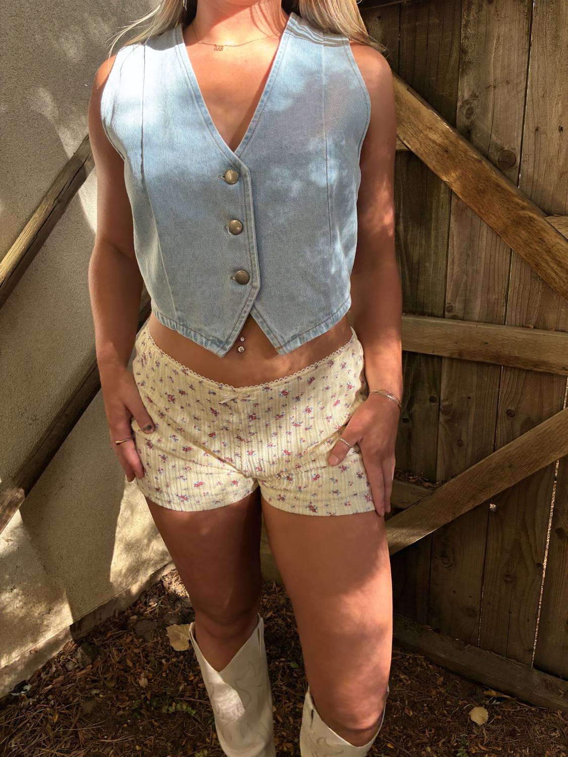 Not only cute but extremely comfortable. The jean shorts you will be reaching for all season long. Elevate your summer style with the Cobal Floral Shorts by Bailey Rose, a perfect blend of boho chic and cozy couture. These high-waisted shorts in a creamy ribbed knit feature an adorable mini red and blue floral print, complemented by a tiny satin bow and scalloped trim at the waistband. Made from 95% polyester and 5% spandex, they offer a soft, stretchy fit ideal for lounging or layering. Effortlessly pair them with a cropped tee for an understated yet feminine vacation look.