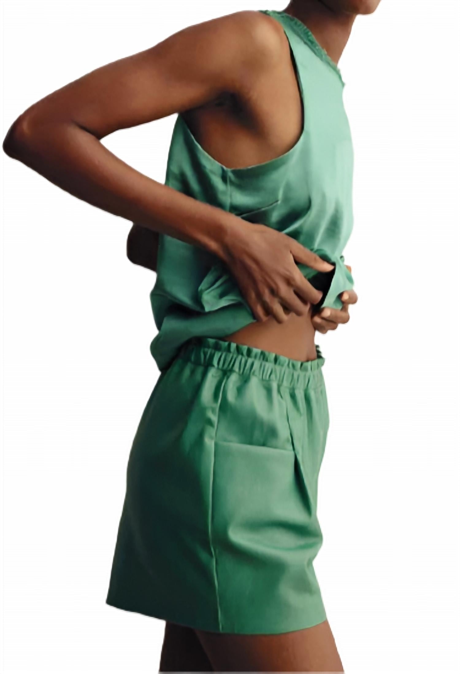 You can never have too many jean shorts and these will be your new favorites. Embrace effortless style with the Women's Vegan Leather Shorts by Melissa Nepton, perfect for a minimalist summer vibe. These pull-on shorts are crafted from solid exotic green faux leather, ensuring a relaxed fit that combines fashion with comfort. They feature convenient side pockets and are ideal for vacations or any casual occasion. Enhance your summer wardrobe with this versatile piece from Melissa Nepton.