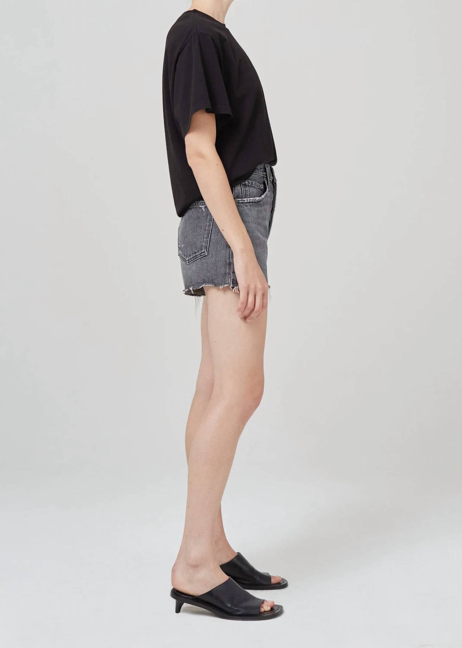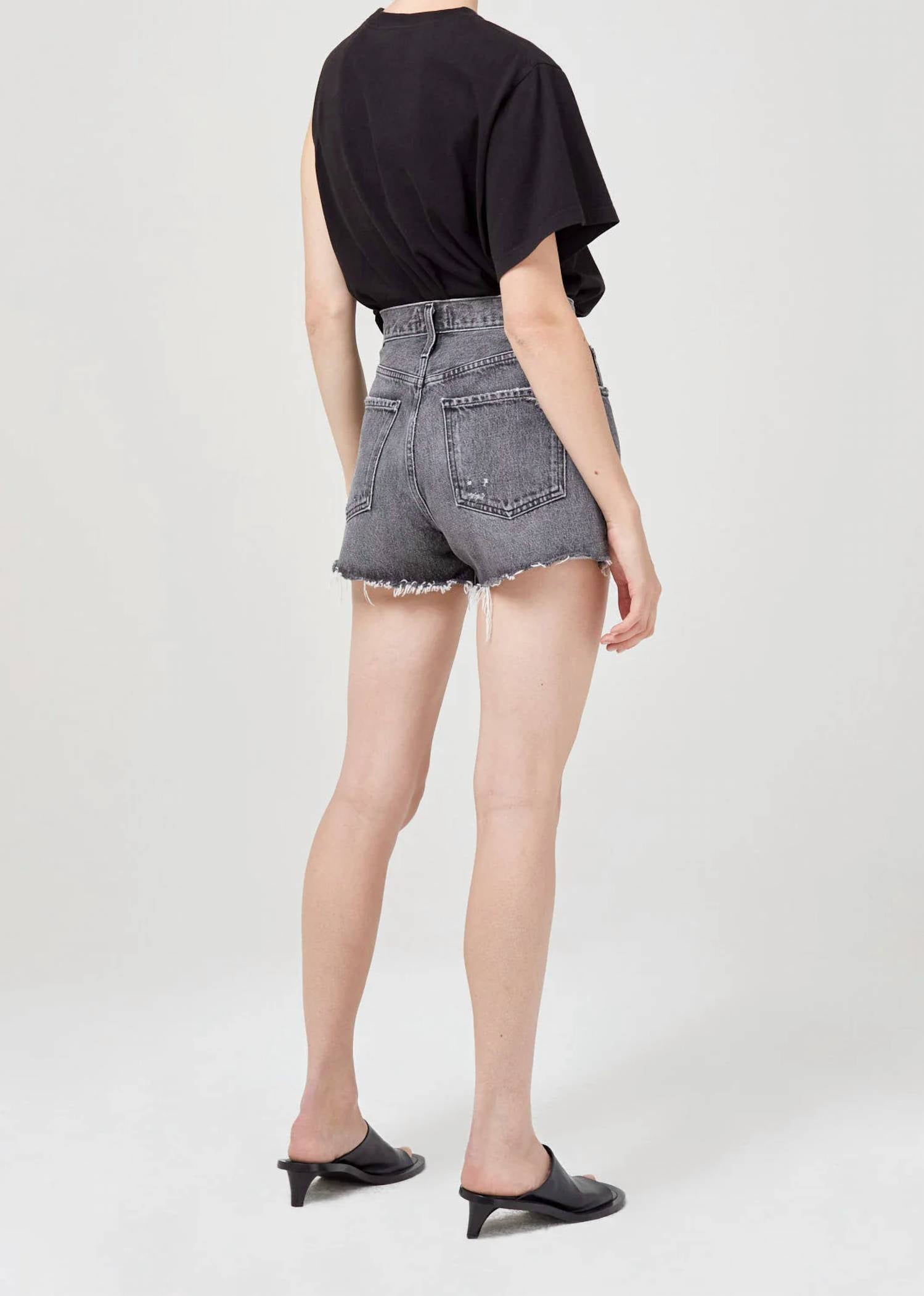 Not only cute but extremely comfortable. The jean shorts you will be reaching for all season long. Introducing the Dee Vintage High Rise Shorts by AGOLDE, offering a chic silhouette in moxy grey wash perfect for everyday wear. These jean shorts are crafted from 100% organic, non-stretch cotton with an ultra-high rise cut and a closer fit around the thigh. With a front rise of 12 1/2", an inseam of 3 1/2", and a leg opening of 22 1/2", they feature a classic button fly closure and are made in Turkey. Care for these denim shorts is easy: machine wash and tumble dry. Model is wearing size 27.