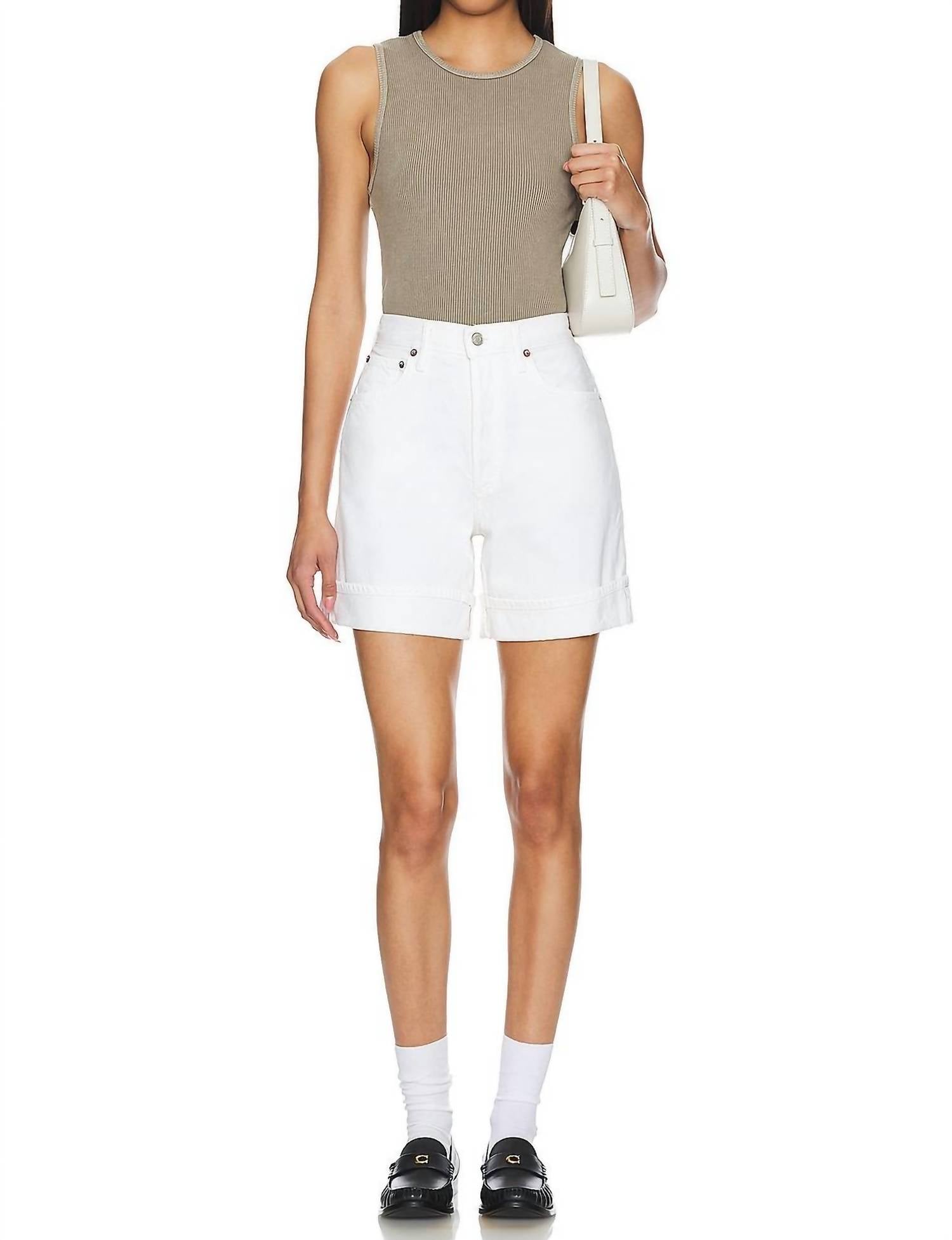 Classic shorts in non-stretch denim with a button fly and 5-pocket design. Features a rolled hem and is made from 100% organic cotton. Machine wash. Made in Turkey. Model is 5'9" and wearing a size 24. Measurements: Length 11", Rise 11.0".