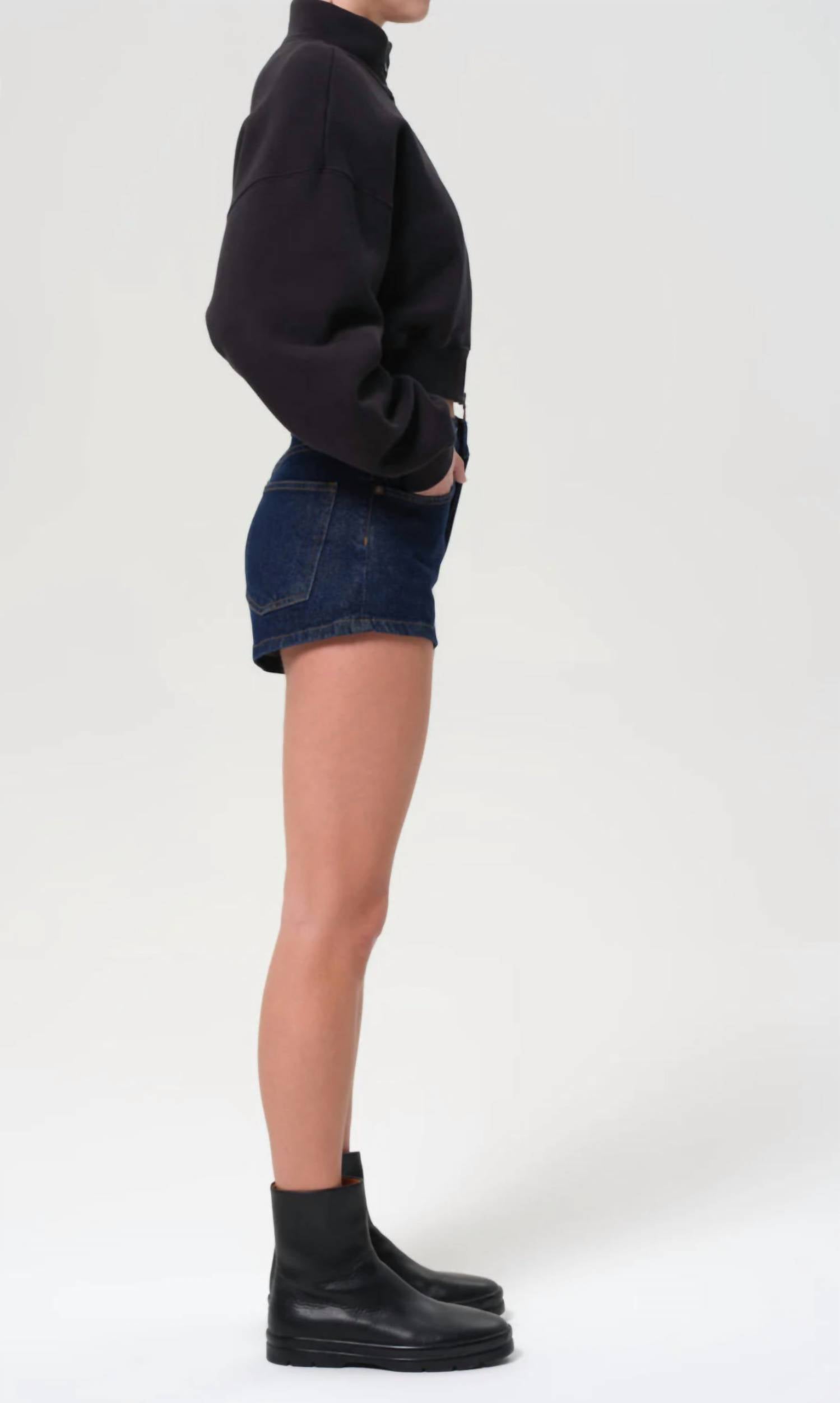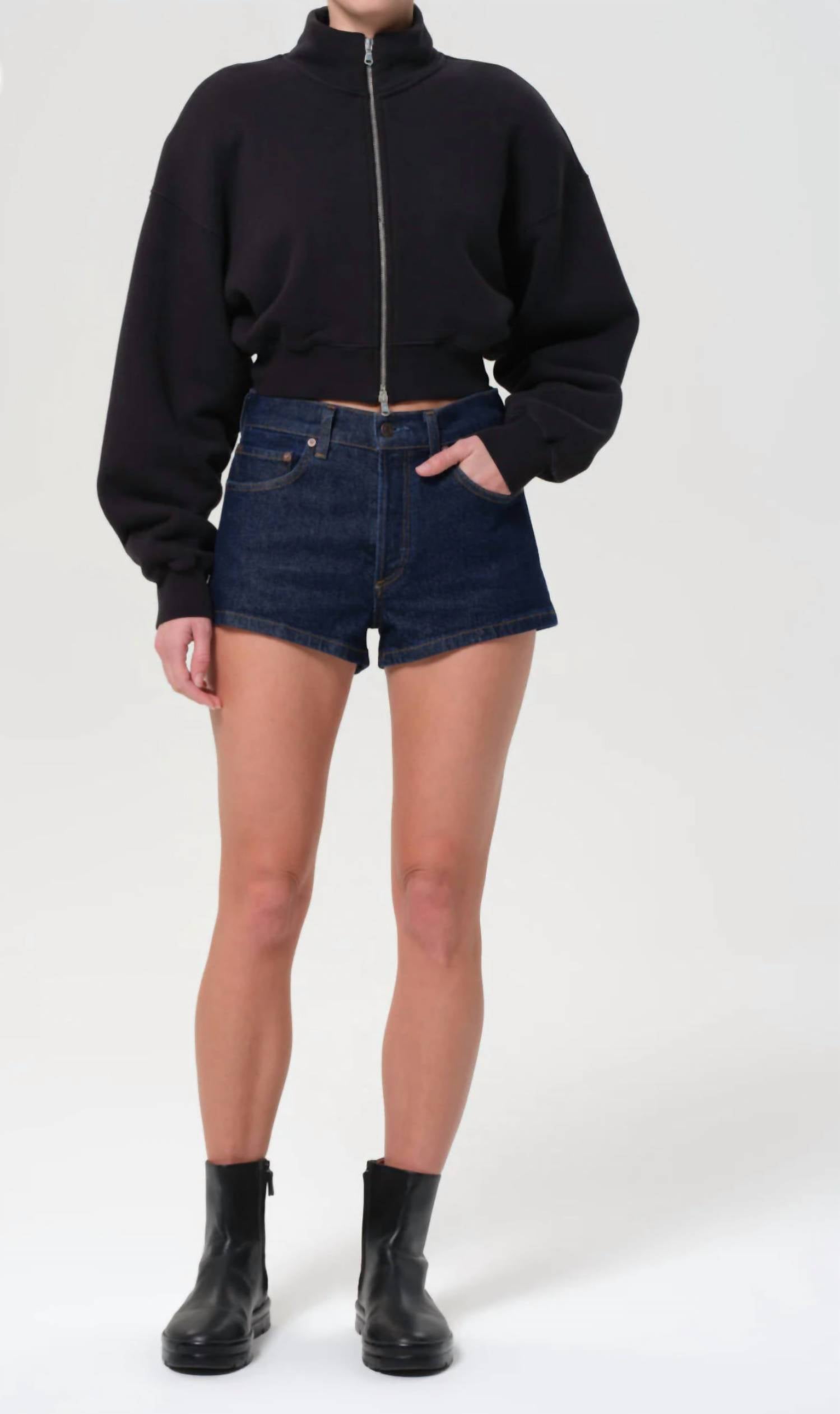 Jean shorts so versatile, you can literally wear them with anything. Introducing the AGOLDE Ridley Short, a stunning piece in dark indigo blue for an effortlessly chic summer style. These jean shorts boast a high-rise, contoured fit with a 12 1/8" rise and 2 1/2" inseam, crafted from 99% regenerative cotton and 1% LYCRA® EcoMade Fiber for added stretch. Manufactured in Turkey with imported materials, they feature a button fly closure and are dyed using Eco-Indigo for reduced environmental impact. Care: Machine wash cold inside out with like colors, tumble dry low. Model is 5'10" wearing a size 27 with a leg opening of 25 1/2".