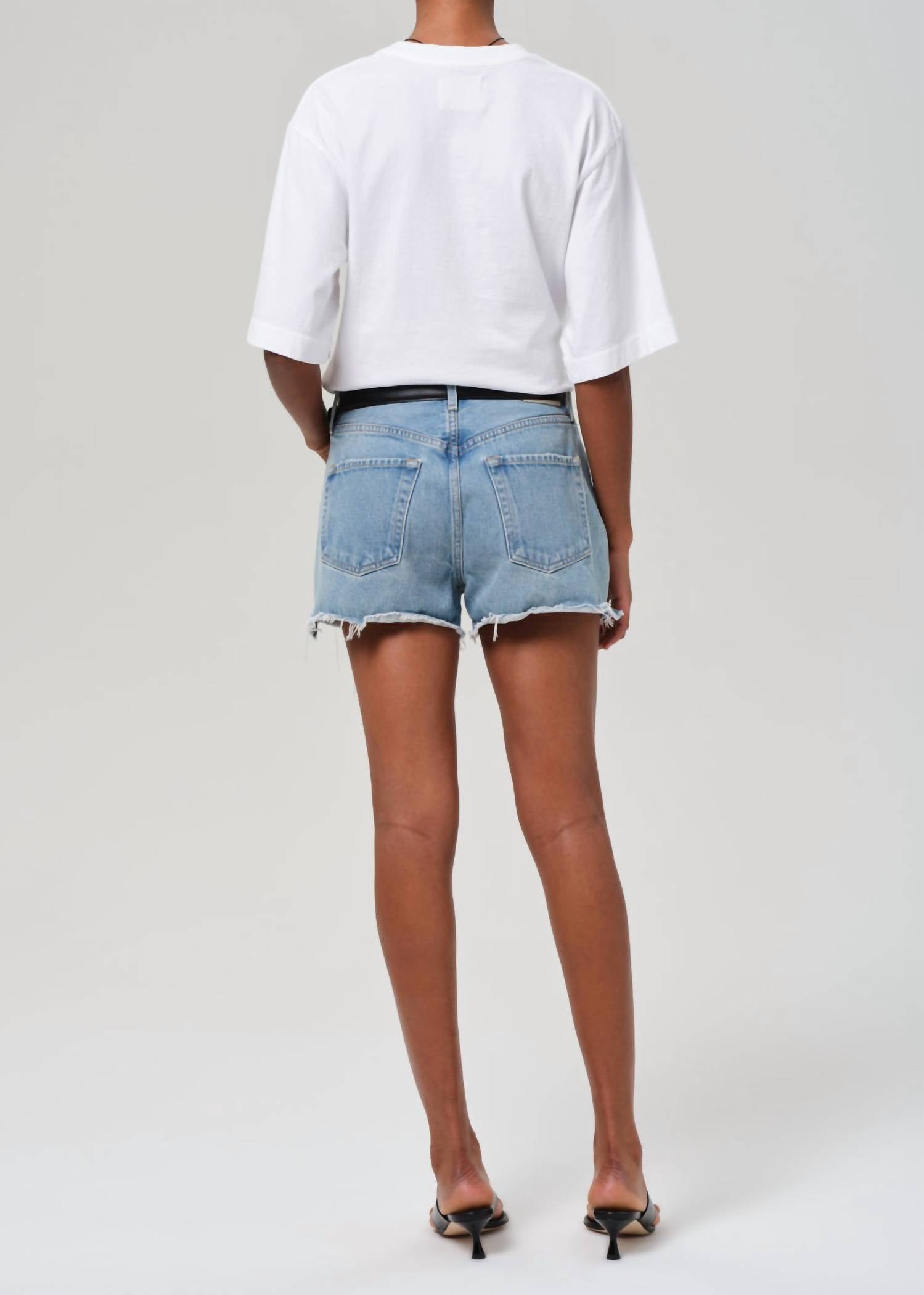 Not only cute but extremely comfortable. The jean shorts you will be reaching for all season long. Discover the Marlow Short by Citizens of Humanity, a must-have for your summer wardrobe. These women's jean shorts in refreshing Seltzer boast a mid-rise design with a raw hem and slight distressing for a laid-back vibe. Crafted from 100% regenerative cotton, these shorts feature a 12" rise, 3 1/4" inseam, and 24 1/2" leg opening, complete with a button fly closure. Simply machine wash cold inside out with like colors and tumble dry low. Model is 5'10" and wears a size 27.