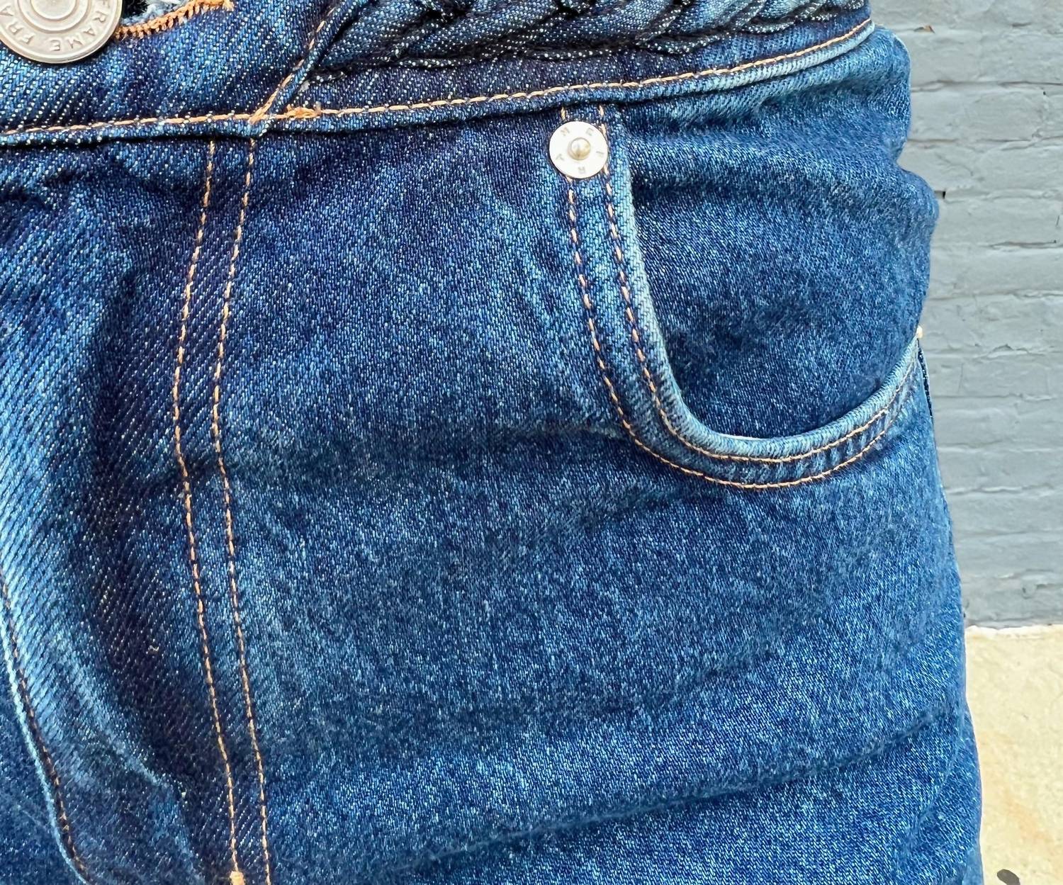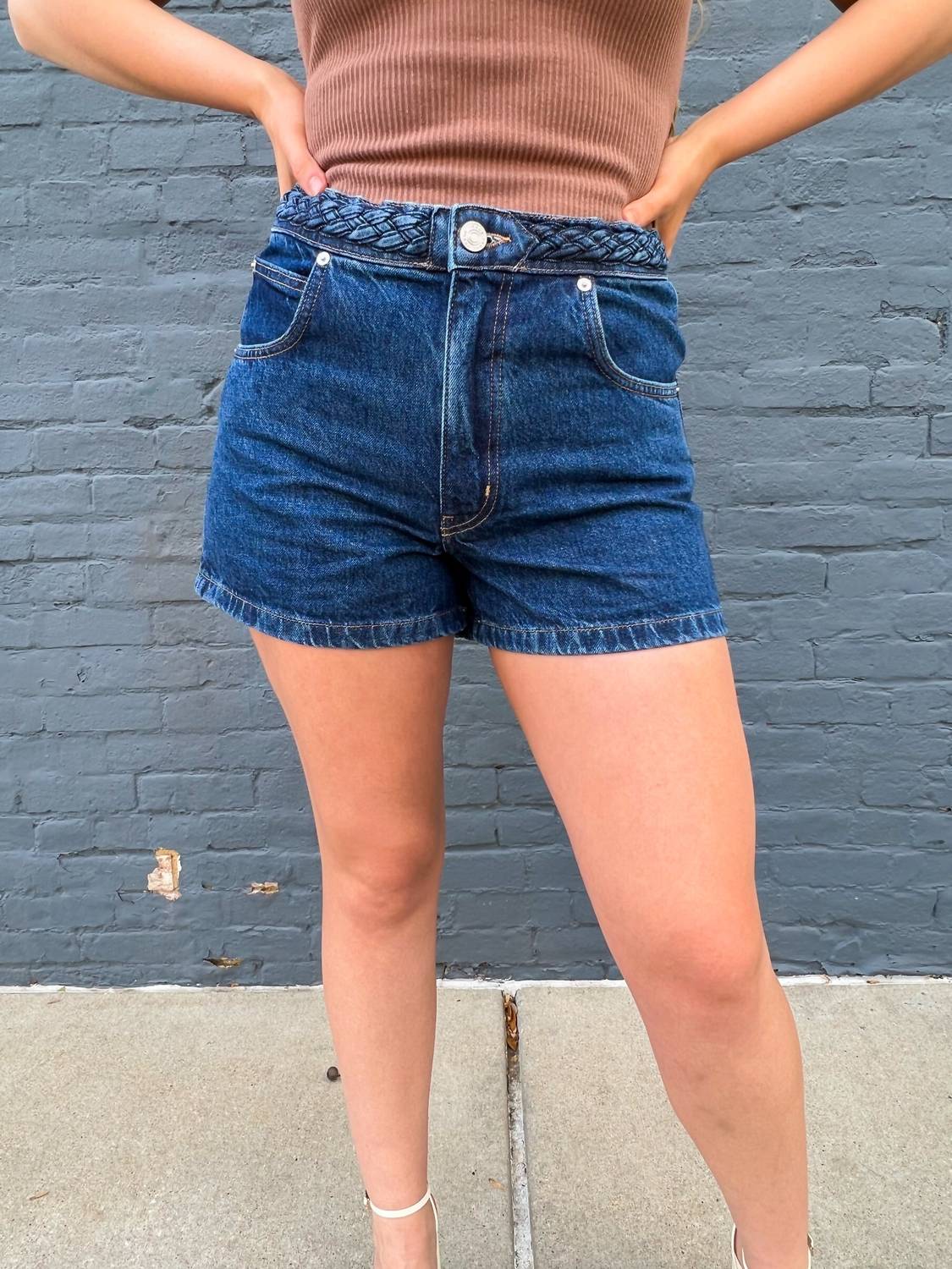 You can never have too many jean shorts and these will be your new favorites. Discover effortless summer style with the Braided Waistband Short by FRAME, featuring a distinctive braided waistband for added flair. These dark wash denim shorts offer a solid pattern and include practical pockets for convenience. Designed with a tie closure, they embody a minimalist aesthetic perfect for any vacation. Care: Machine wash and tumble dry, ensuring easy upkeep for warm-weather adventures.