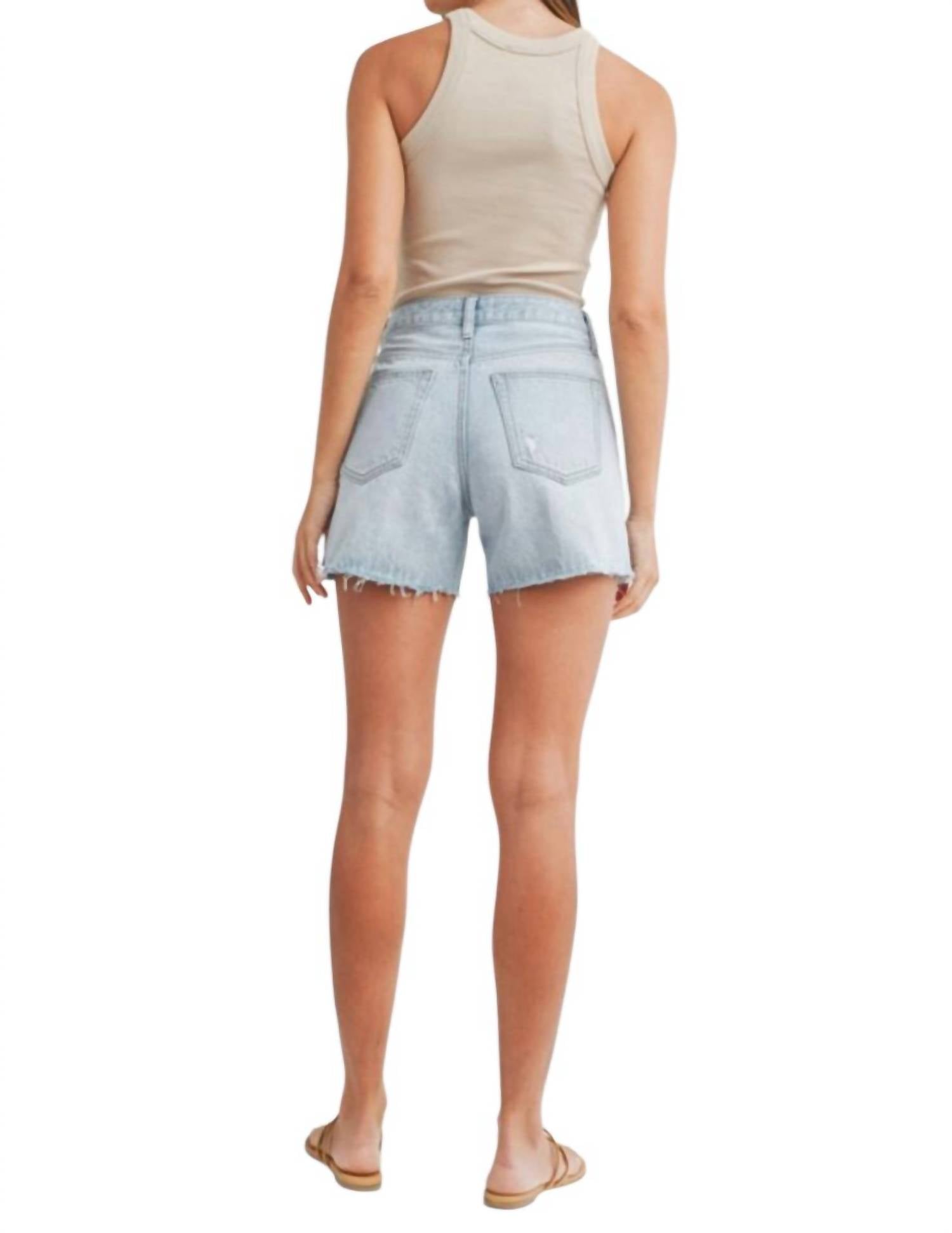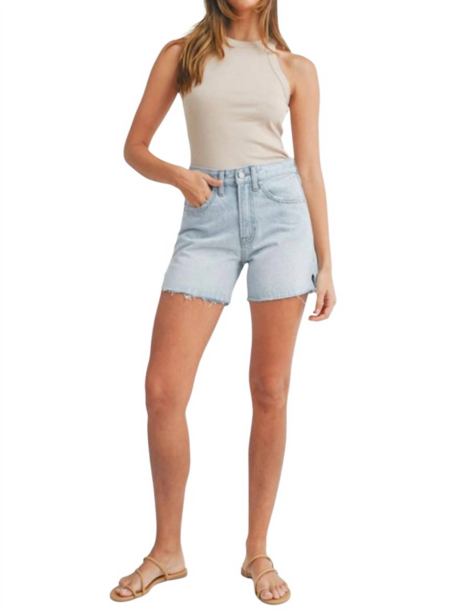 You can never have too many jean shorts and these will be your new favorites. Elevate your summer wardrobe with the Denim Shorts With Raw Hem by JBD, designed for a laid-back yet stylish look. These light wash jean shorts feature a high-waisted design with a 10" rise and 3.5" inseam, accentuated by a raw hem and side slits that are slightly longer in the back. Made from cotton, they come with practical pockets and a secure button/zipper closure. Perfectly embodying 90s fashion, they are a go-to choice for vacations and warm weather outings, offering a true-to-size fit as showcased by Elizabeth and Lauren.