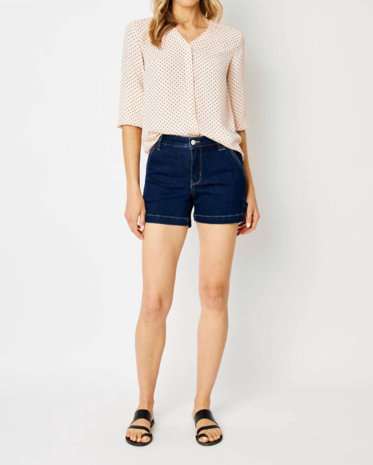 Jean shorts so versatile, you can literally wear them with anything. The Judy Blue Mr Classic Carpenter Shorts in solid blue offer a perfect blend of comfort and style for a casual summer getaway. Crafted as midrise shorts, they feature a comfortable cotton blend composition with 76.2% cotton, 22.5% polyester, and 1.3% spandex. A button closure design is complemented by functional pockets, making these jean shorts both practical and versatile. Model wears size S with dimensions of 5'9" height, 24" waist, and 34" hip.