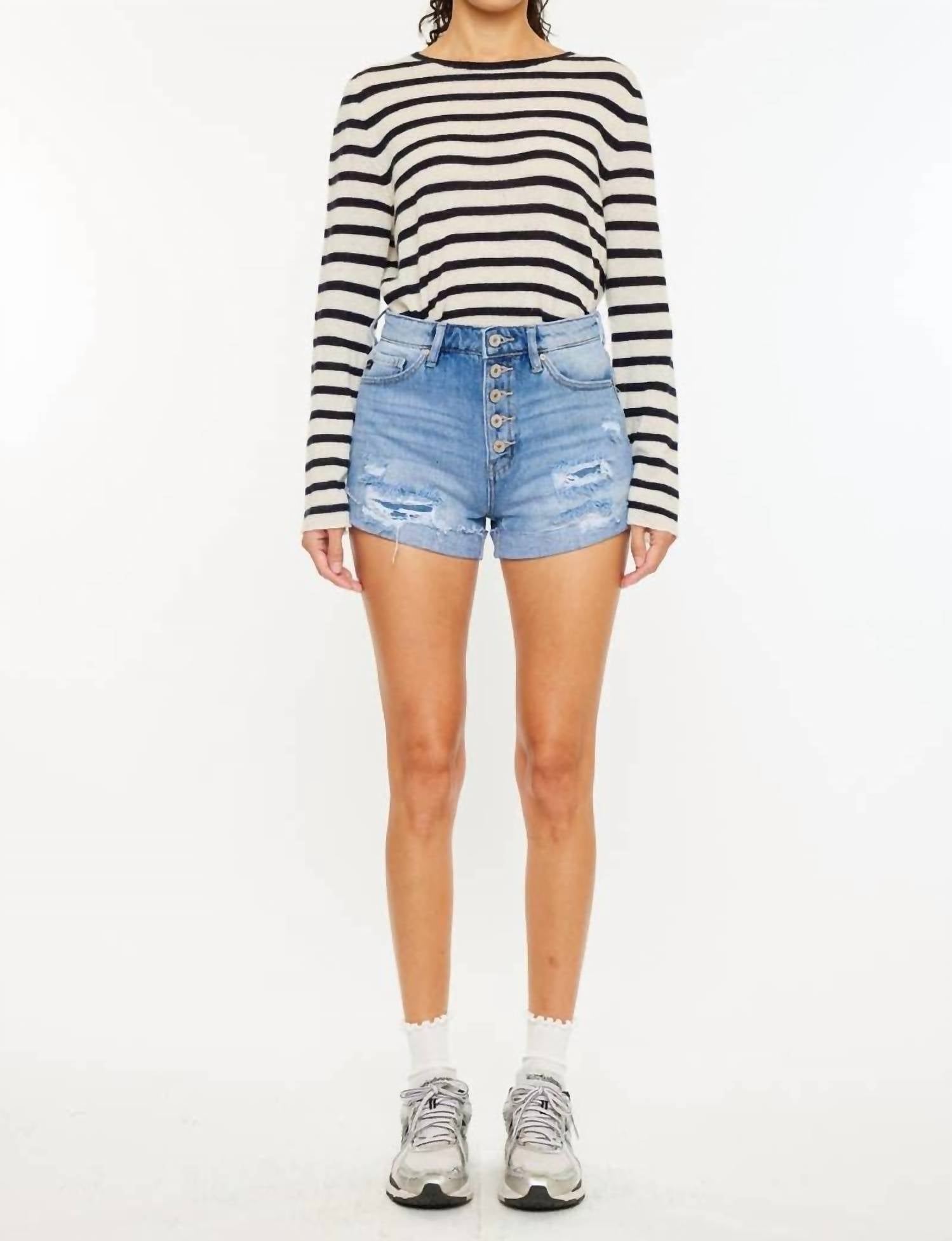 Jean shorts so versatile, you can literally wear them with anything. Elevate your spring wardrobe with the Jovana Ultra High Rise Shorts by KanCan, perfect for streetwear enthusiasts and holiday parties. These light wash jean shorts feature a high rise with an 11.25-inch rise and a 3-inch inseam, crafted from 100% cotton for durability and comfort. With a textured pattern and chic distressing, these shorts boast an exposed button closure and convenient pockets. Care: Machine wash and line dry to maintain their vintage-inspired look.