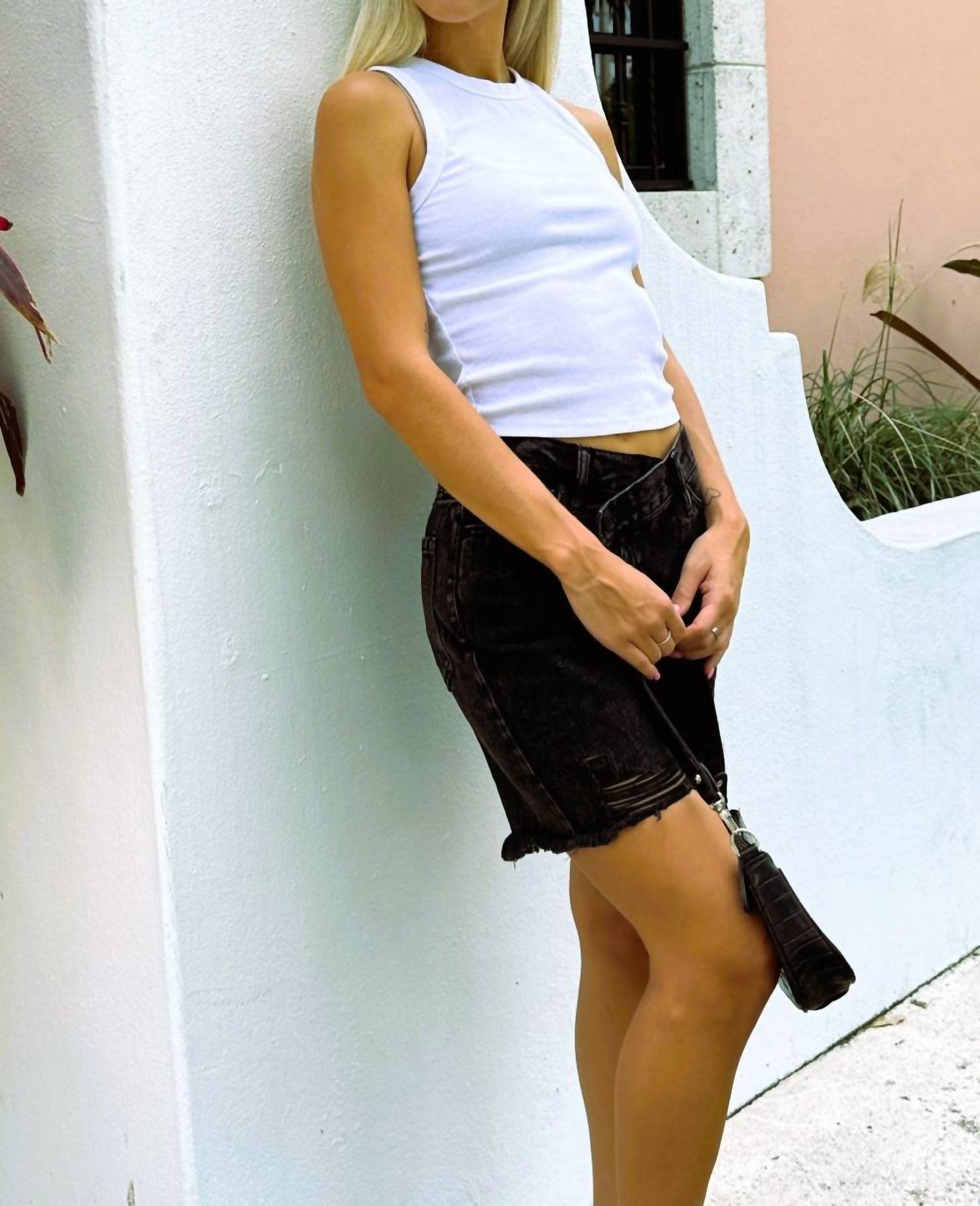 Not only cute but extremely comfortable. The jean shorts you will be reaching for all season long. The KanCan Nelson Cross Front Denim Shorts offer a nod to the 90s with their black stone-washed finish and relaxed rigid fit. Crafted from 100% cotton, these Bermuda shorts feature a high-rise cross over waistband, fray hem, and convenient zip closure. With measurements of an 11.5" rise and 6" inseam in size M, these shorts are versatile enough to pair with your favorite basics or a beach ensemble. Model is 5'6" and wearing a size small.