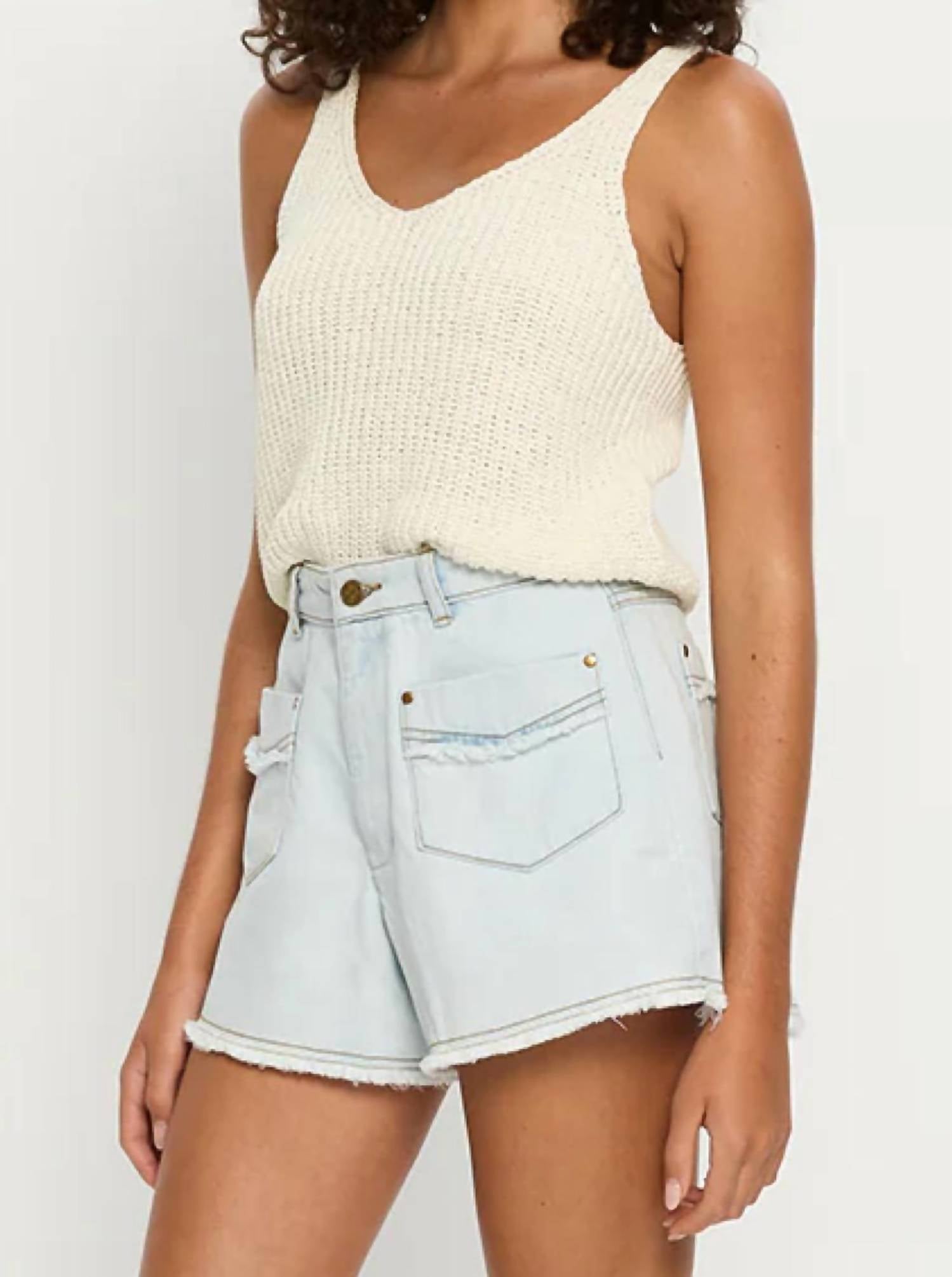 You can never have too many jean shorts and these will be your new favorites. Introducing the KIVARI Gail Denim Short in a refreshing Pale Indigo, perfect for your summer wardrobe. Made from 100% cotton denim, these shorts feature both front and back patch pockets for practicality. They boast a fly front button closure and a chic fray hem detail, embodying a Western trend. Easy to care for, these shorts are machine washable and tumble dry-friendly, making them a convenient choice for vacations and casual outings.