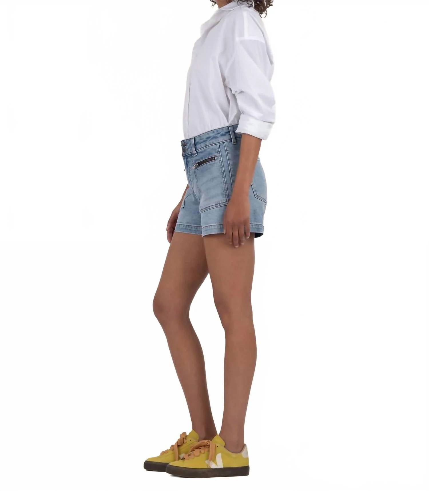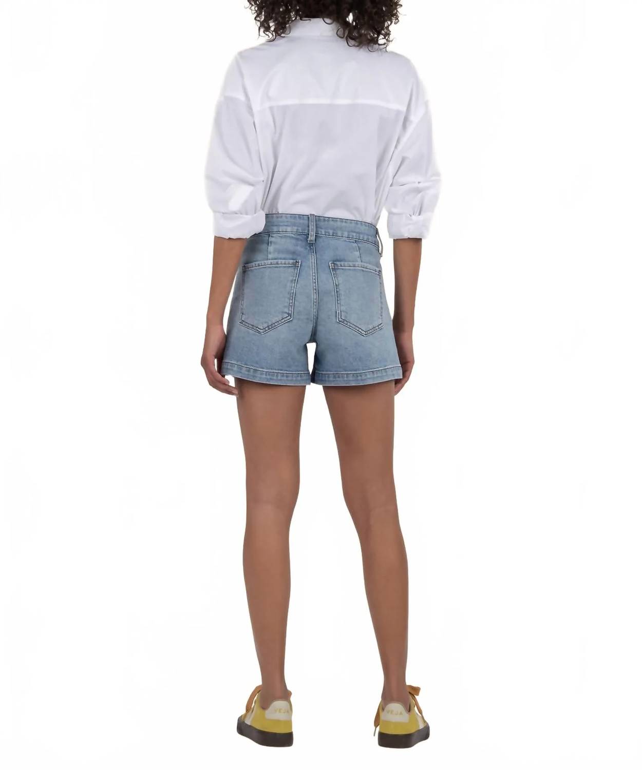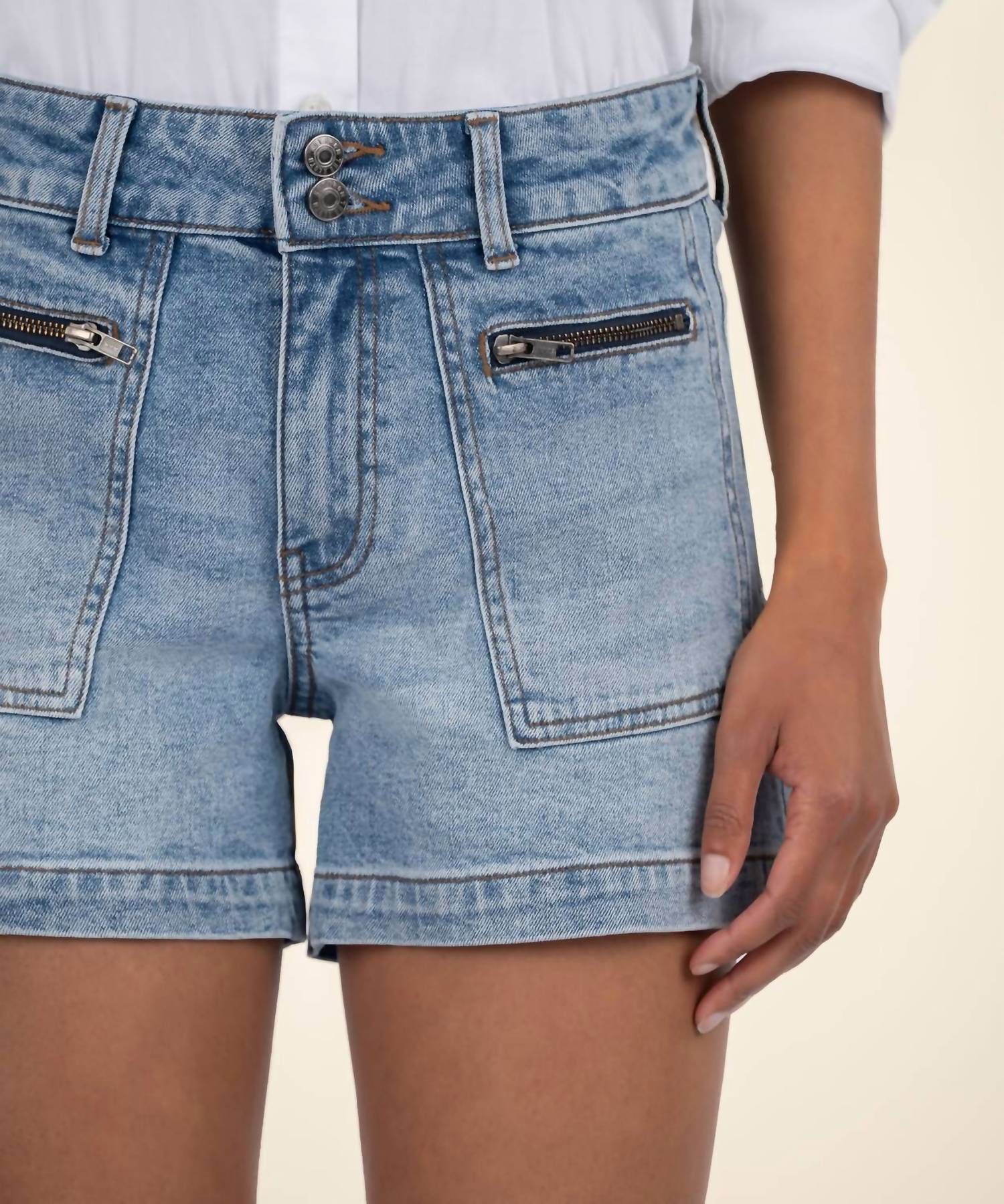 You can never have too many jean shorts and these will be your new favorites. Elevate your summer wardrobe with the Jane High Rise Long Shorts by KUT FROM THE KLOTH, designed in order med base, a classic denim hue. Featuring patch pockets with zippers, these solid denim shorts offer a structured fit with a high rise, wider waistband, and double buttons. Crafted from 99% cotton and 1% spandex, the shorts feature a zip closure and boast an inseam of 4.25 inches, rise of 10.5 inches, and leg opening of 25 inches. Care: Machine wash and tumble dry.