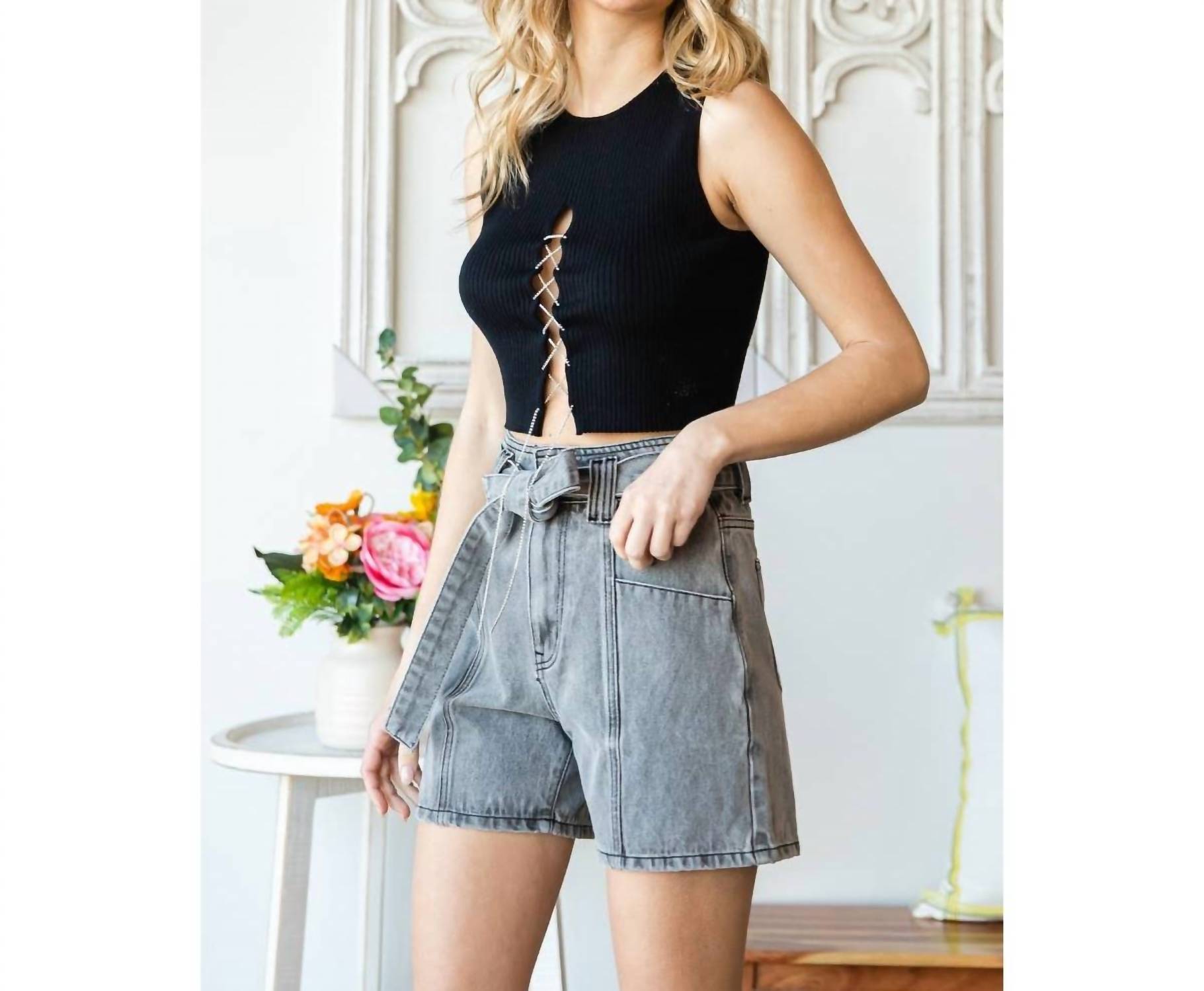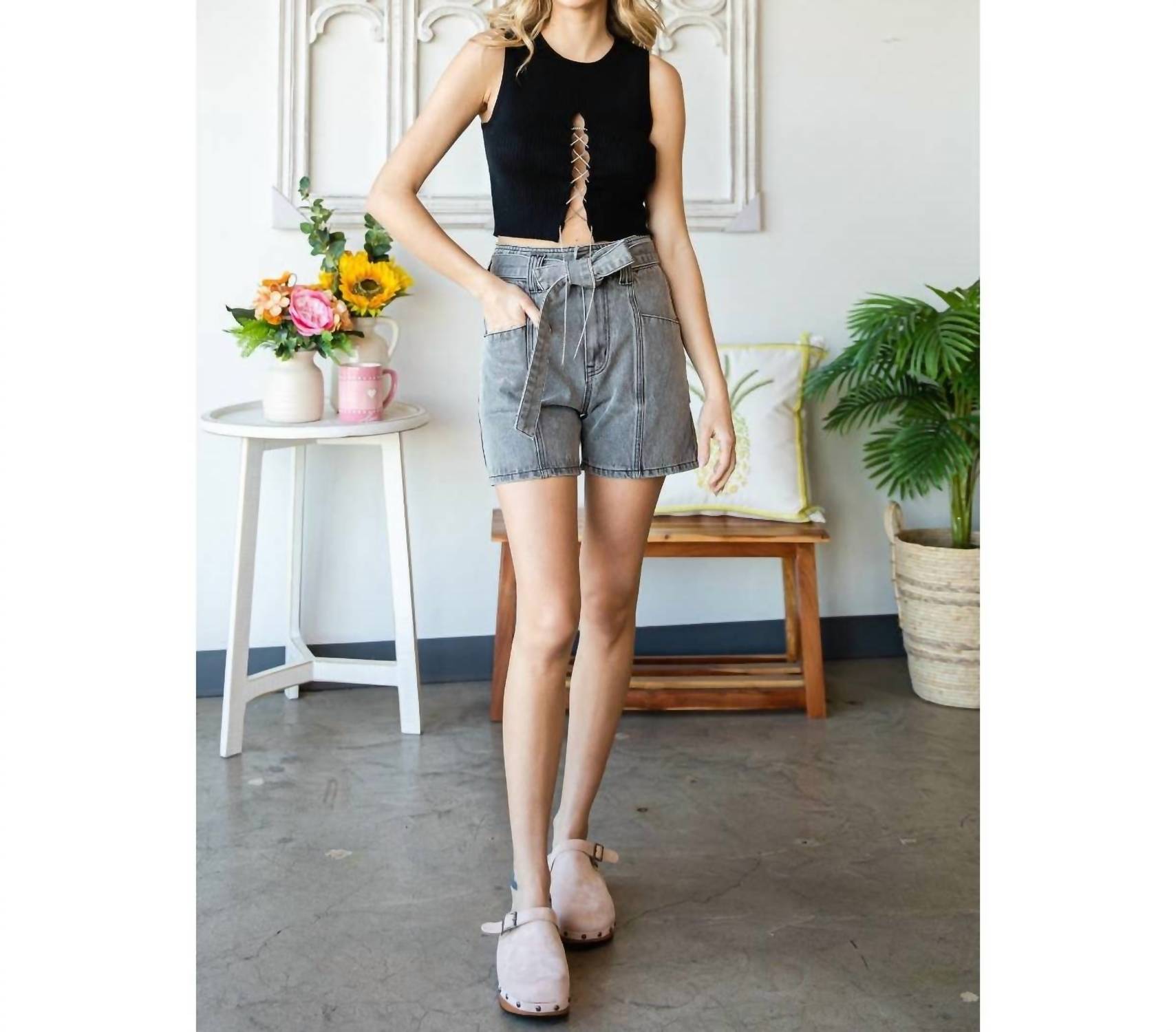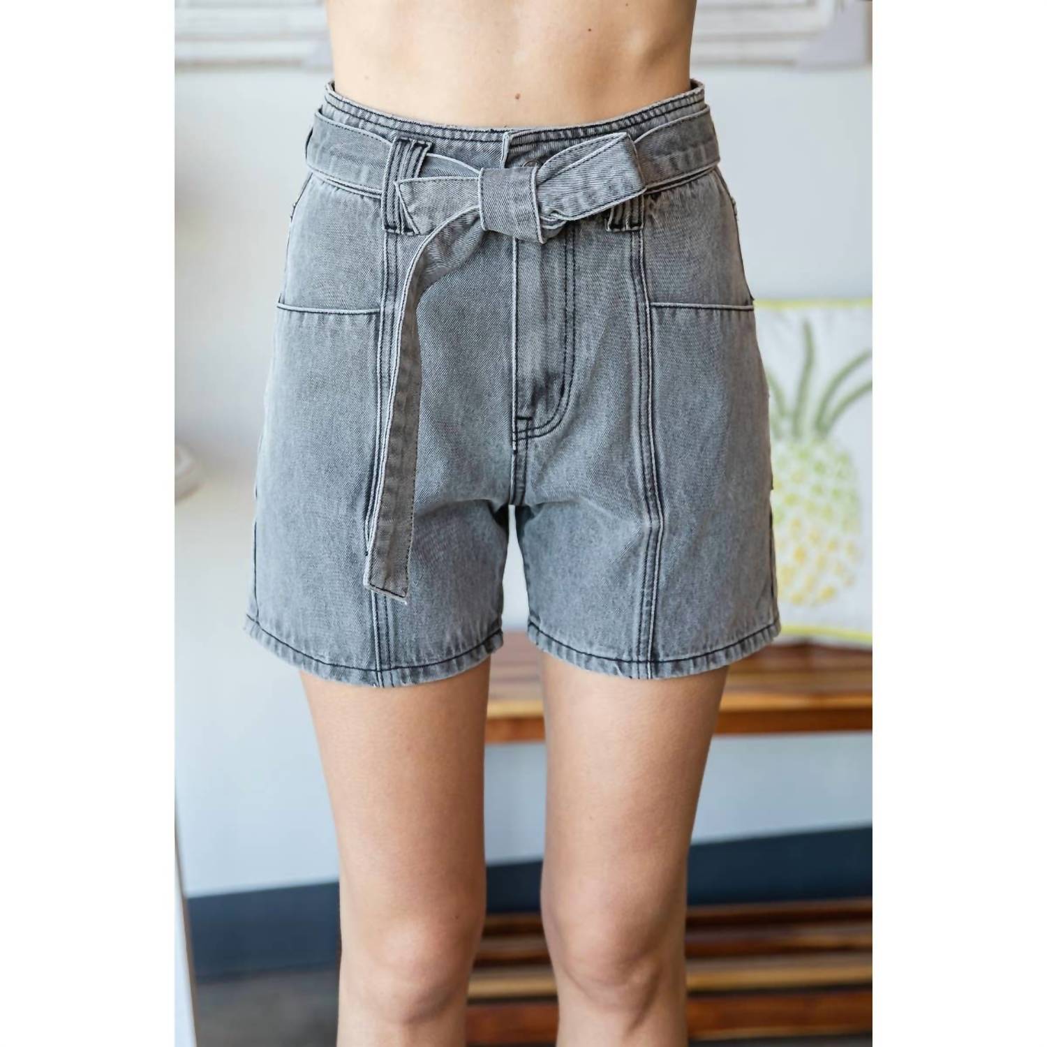 Jean shorts so versatile, you can literally wear them with anything. Upgrade your summer wardrobe with the Waist Belted Denim Shorts by Veveret, perfect for streetwear enthusiasts. These women's shorts are designed in a relaxed high-rise fit with a textured grey wash. Crafted from 100% cotton, they feature a button closure, center cut seam front pockets, and a waist belt band with belt loops. Originating from an imported source, they're easy to care for with a simple hand wash. Model is 5'7" and wearing a size small.