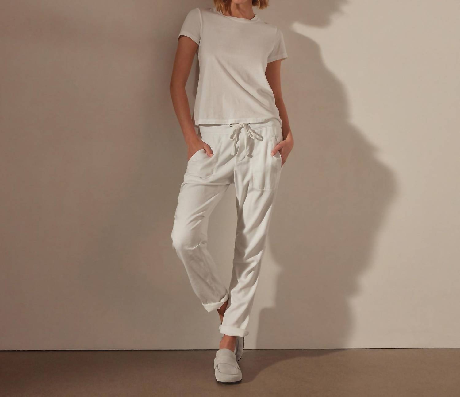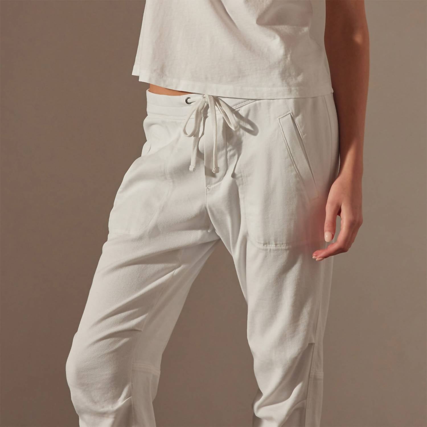 Fit to flatter and so comfortable you could sleep in them. Experience ultimate comfort and style with the Women's Soft Drape Pant from JAMES PERSE, a perfect addition for any vacation wardrobe. Made from a cozy cotton blend, these white jeggings feature a classic skinny leg that flatters, paired with a convenient pull-on closure. The minimalist design provides a timeless look, with handy pockets enhancing functionality. Ideal for sunny summer outings, this solid pattern piece embodies casual elegance.