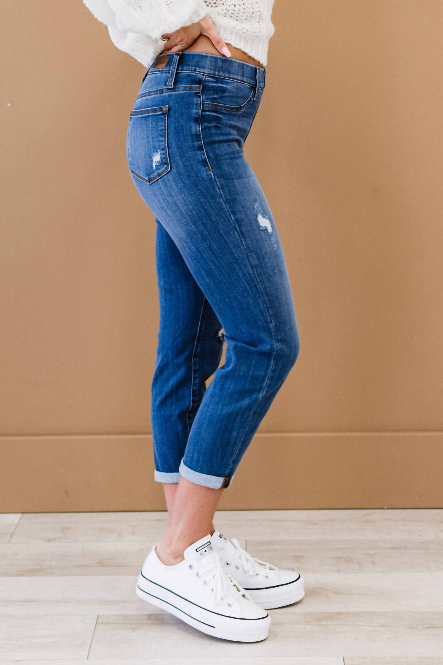 The most comfortable jeggings you'll own! The Nikki Mid-Rise Pull On Destroyed Boyfriend Jeggings by Judy Blue blend comfort and style for a standout summer streetwear look. Made from super stretchy denim, these jeggings feature a mid-rise elastic waistband, faux front pockets, and functional back pockets. With a light wash and slight distressing, they offer a relaxed, slim boyfriend fit. Composition: 52% Cotton, 22% Rayon, 23% Polyester, 3% Lycra. Care: Machine wash cold, line dry. The inseam measures 28 inches, and the cuffed length is 26 inches for versatile styling.